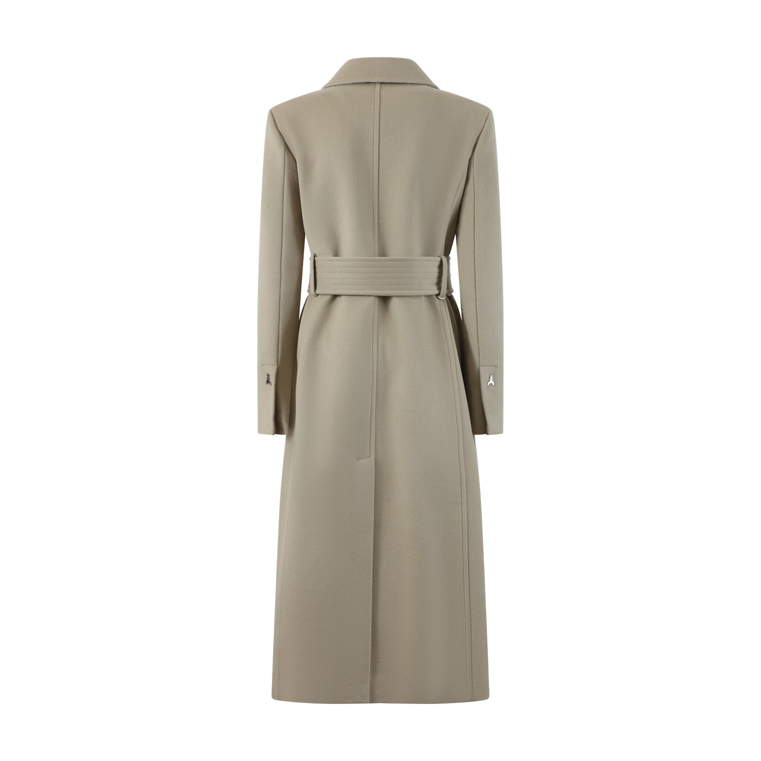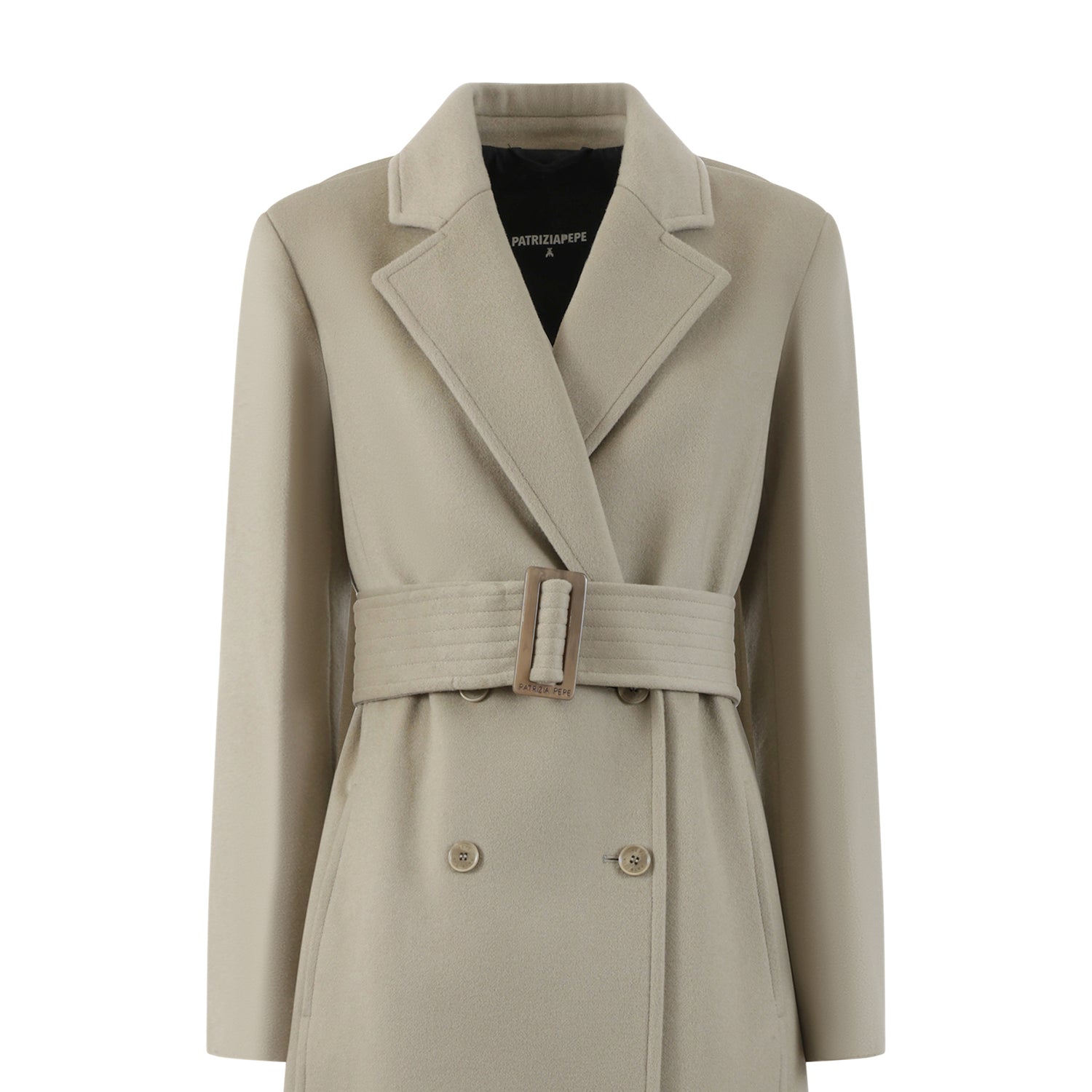 Cappotto ESSENTIAL grigio di PATRIZIA PEPE in misto lana con maniche lunghe con spacco, collo rever clasisco, modello doppio petto con cintura in vita.