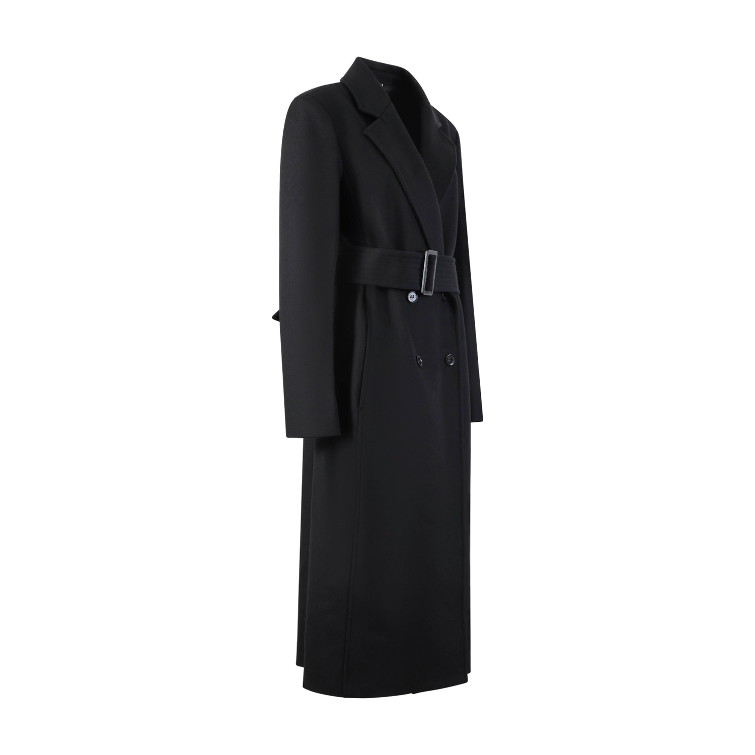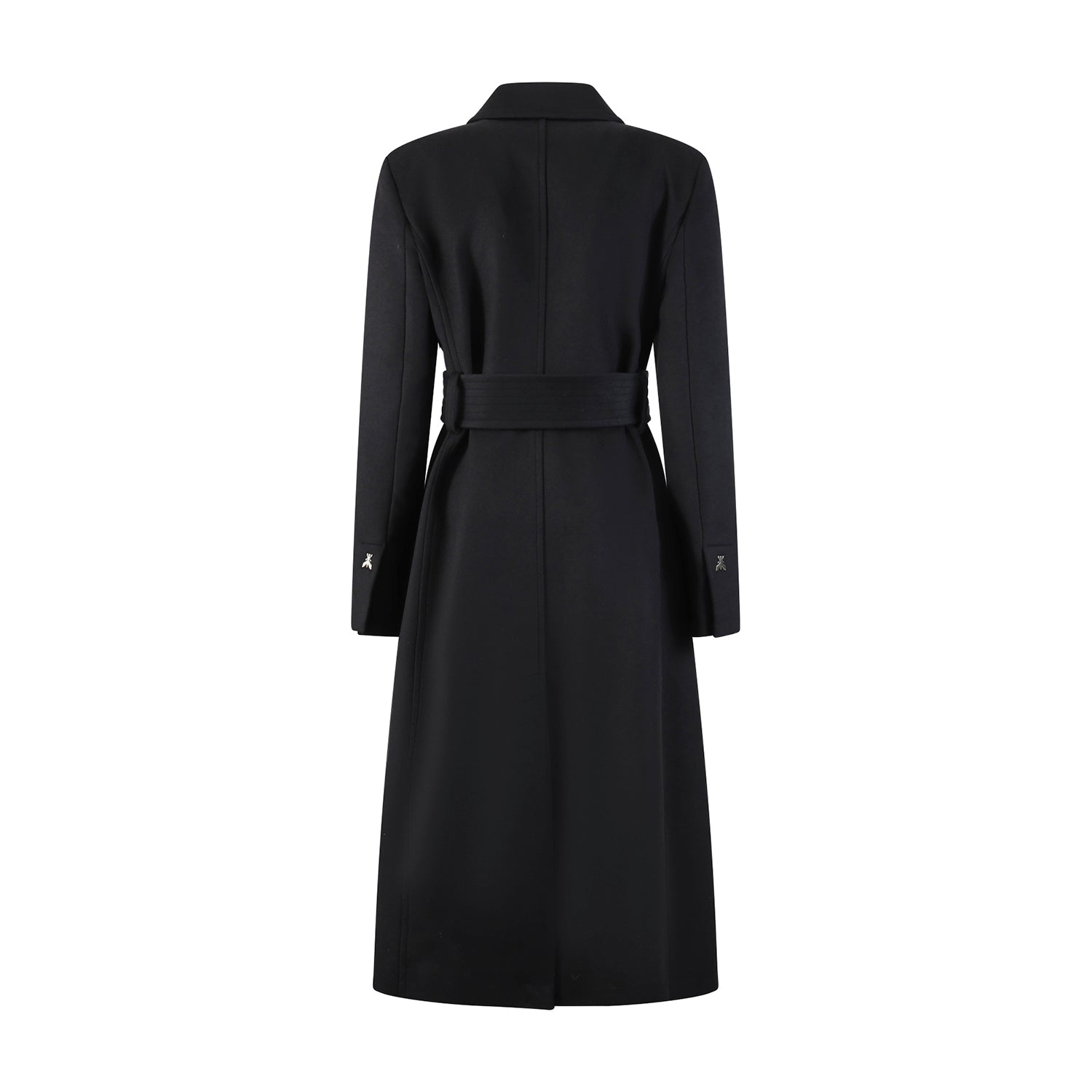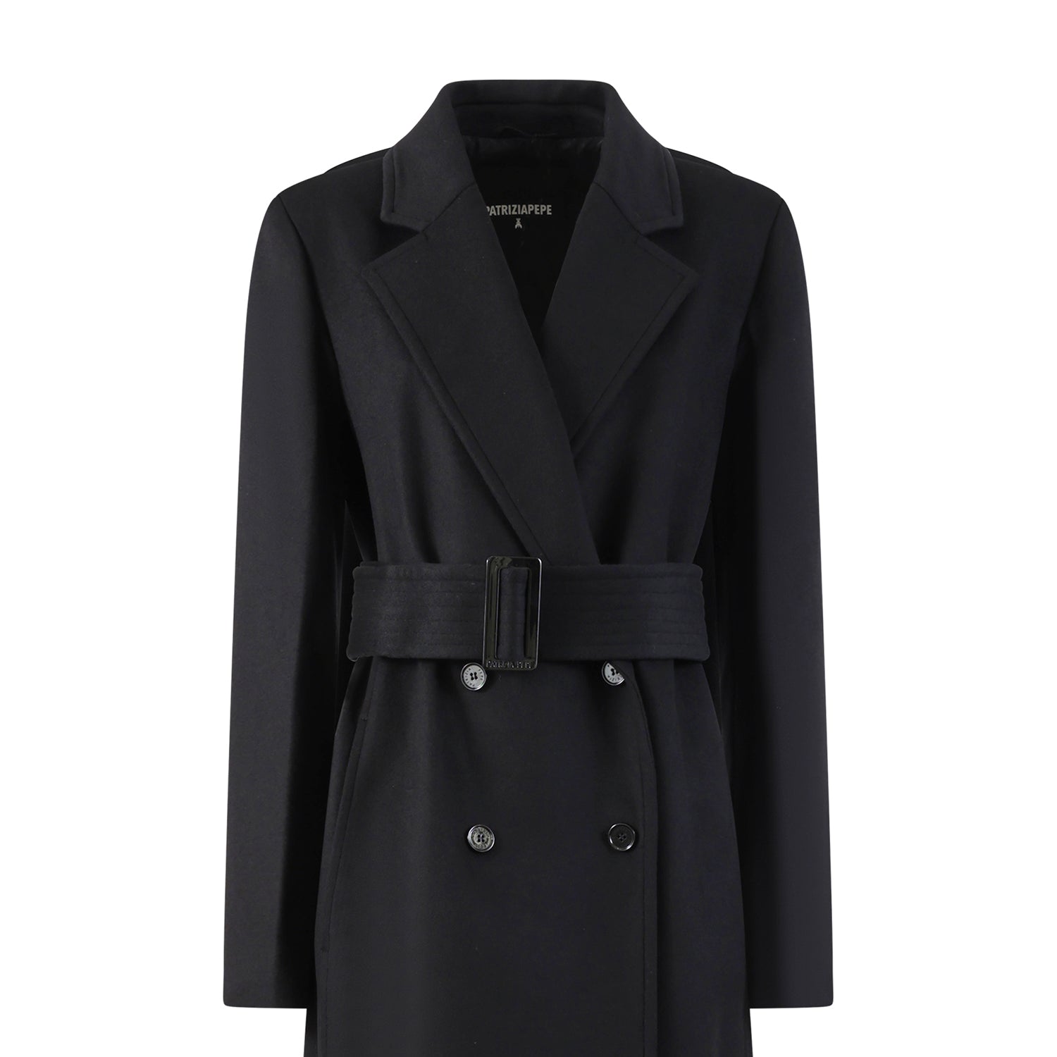 Cappotto ESSENTIAL nero di PATRIZIA PEPE in misto lana con maniche lunghe con spacco, collo rever clasisco, modello doppio petto con cintura in vita.