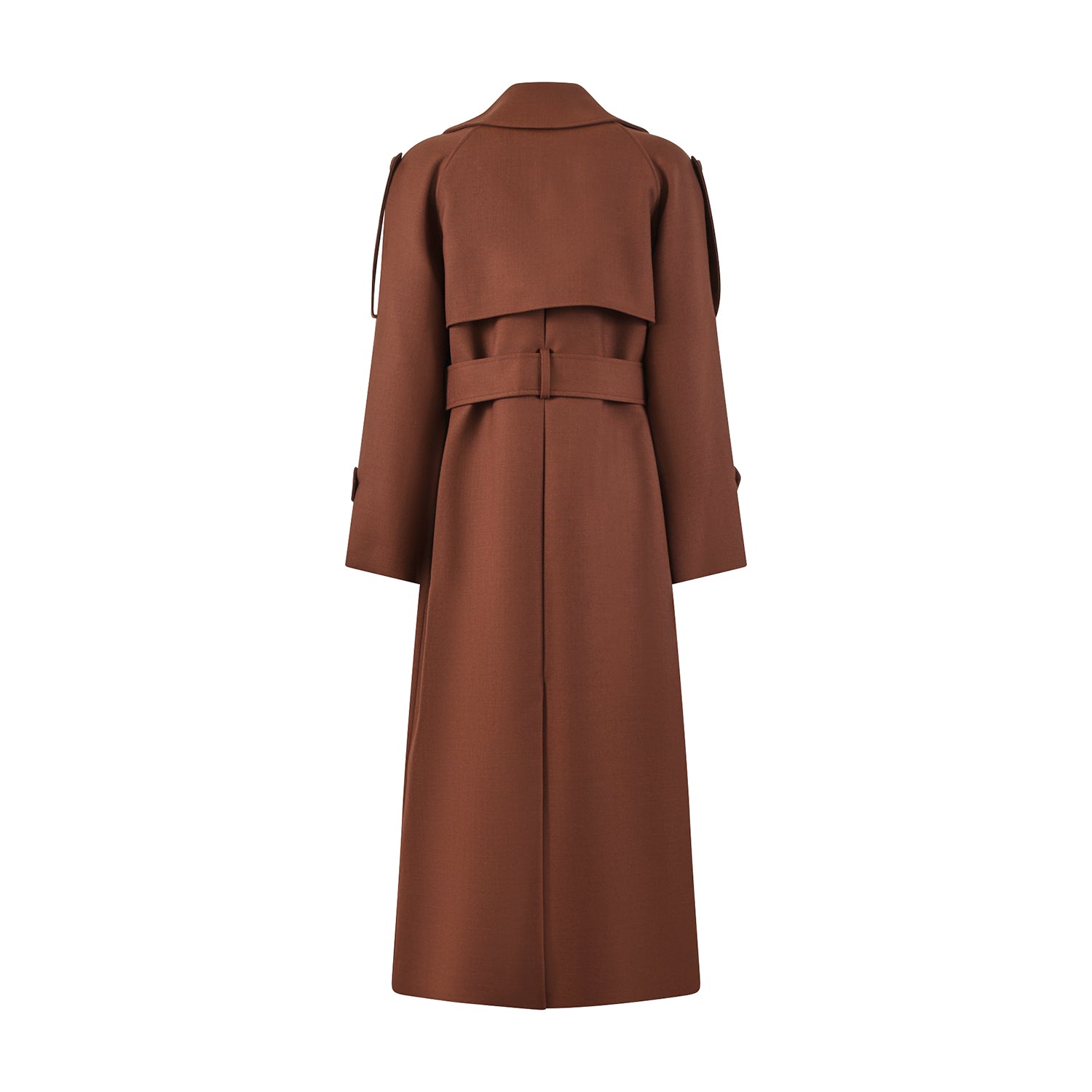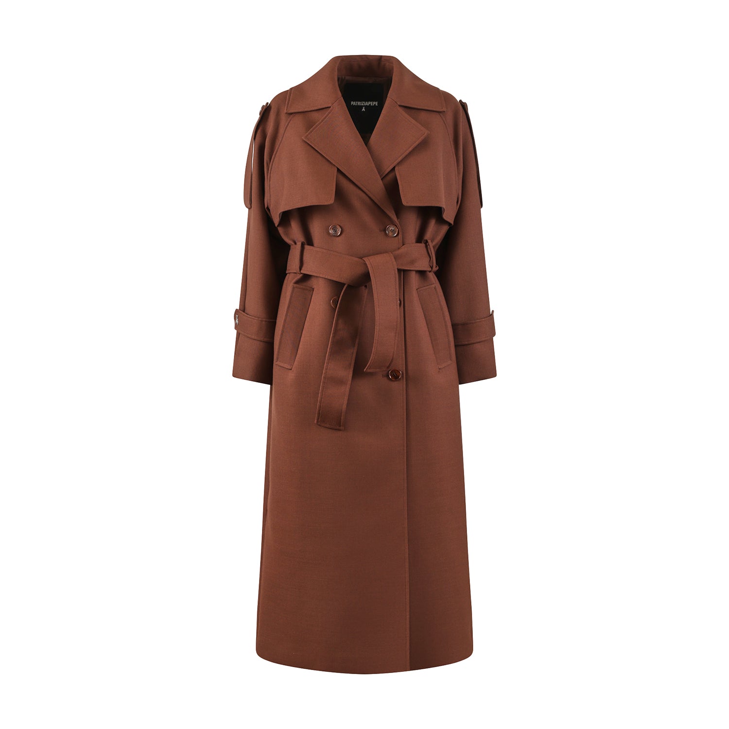 Trench marrone di PATRIZIA PEPE in lana con spalla scesa, maniche lunghe, scollo a trench, modello doppio petto e cintura in vita.