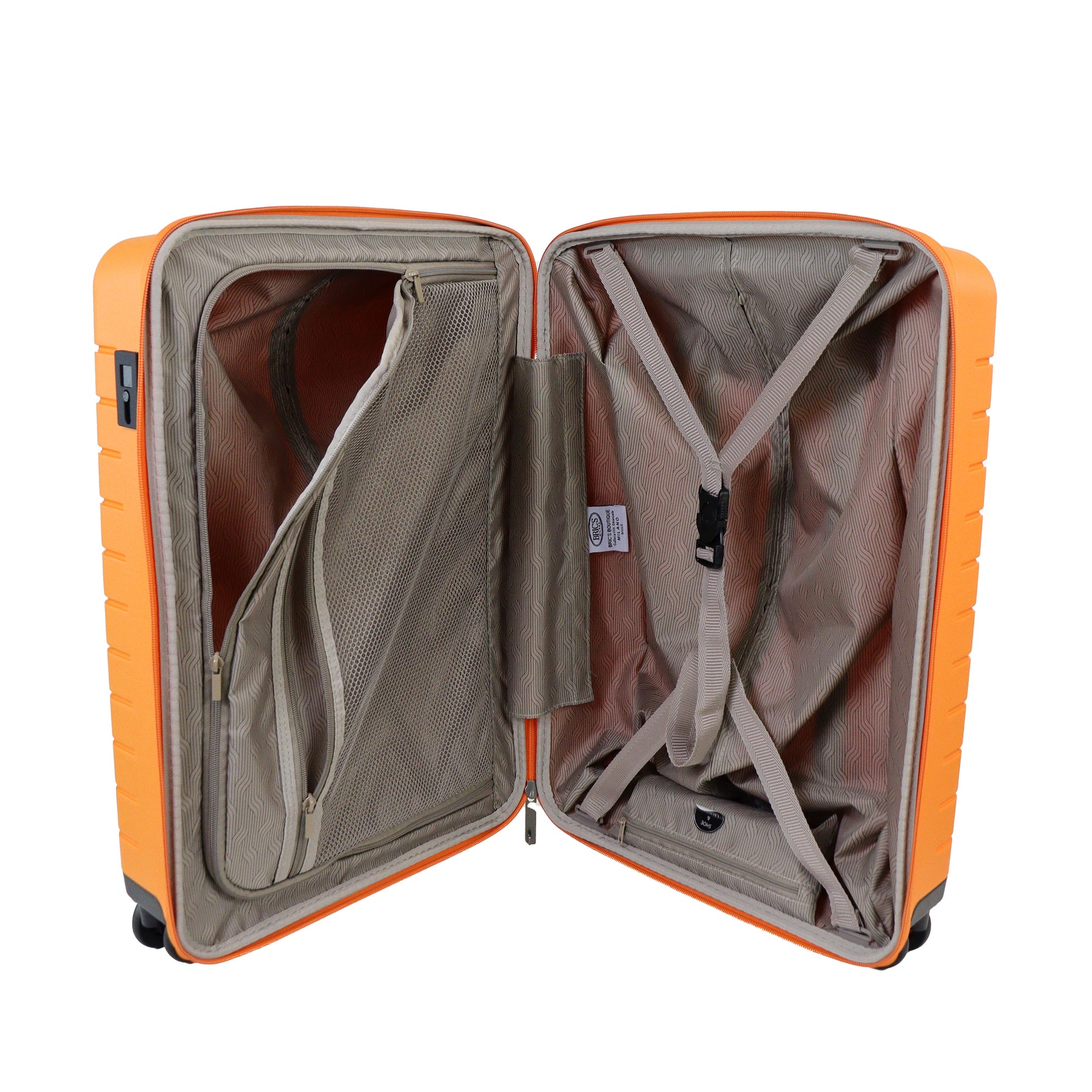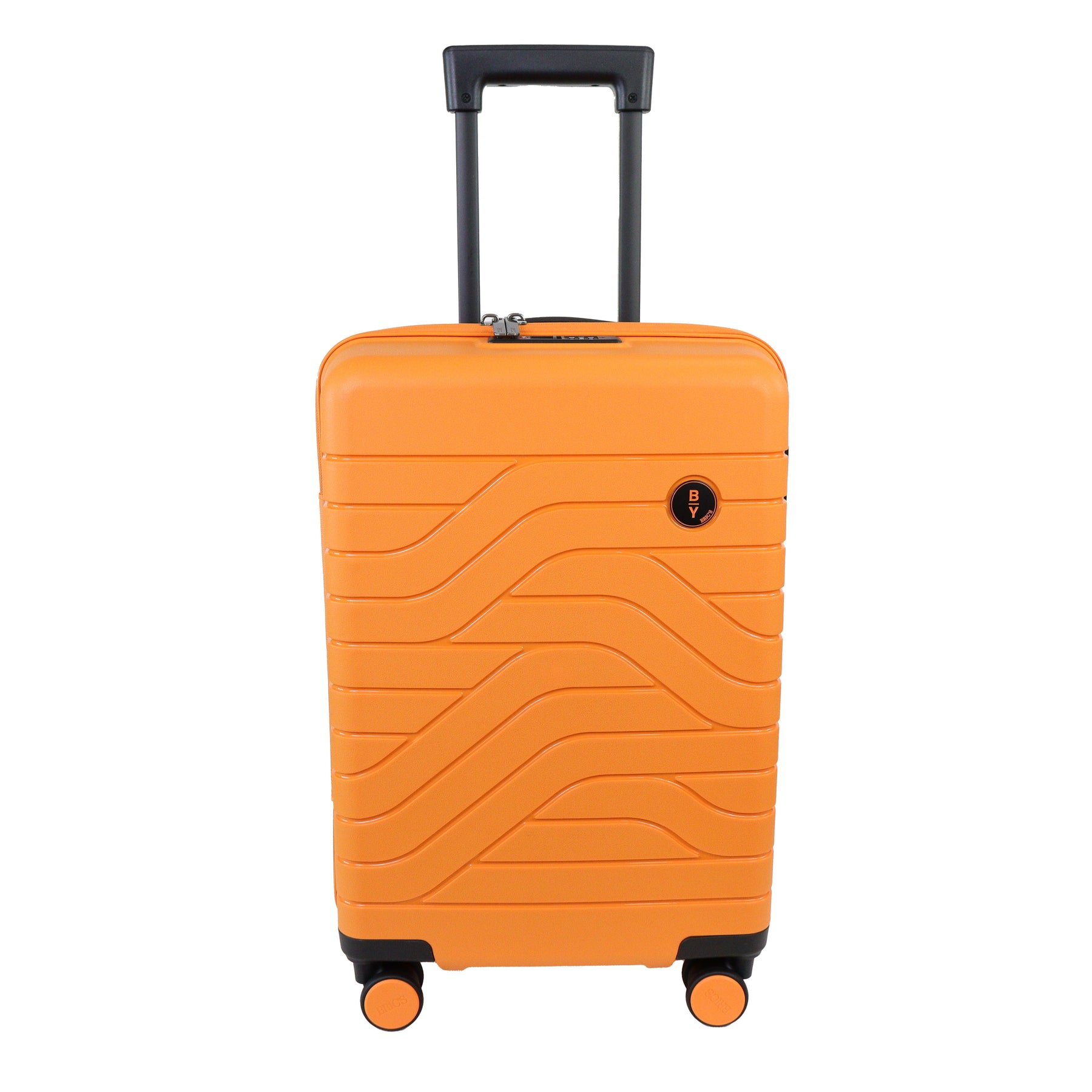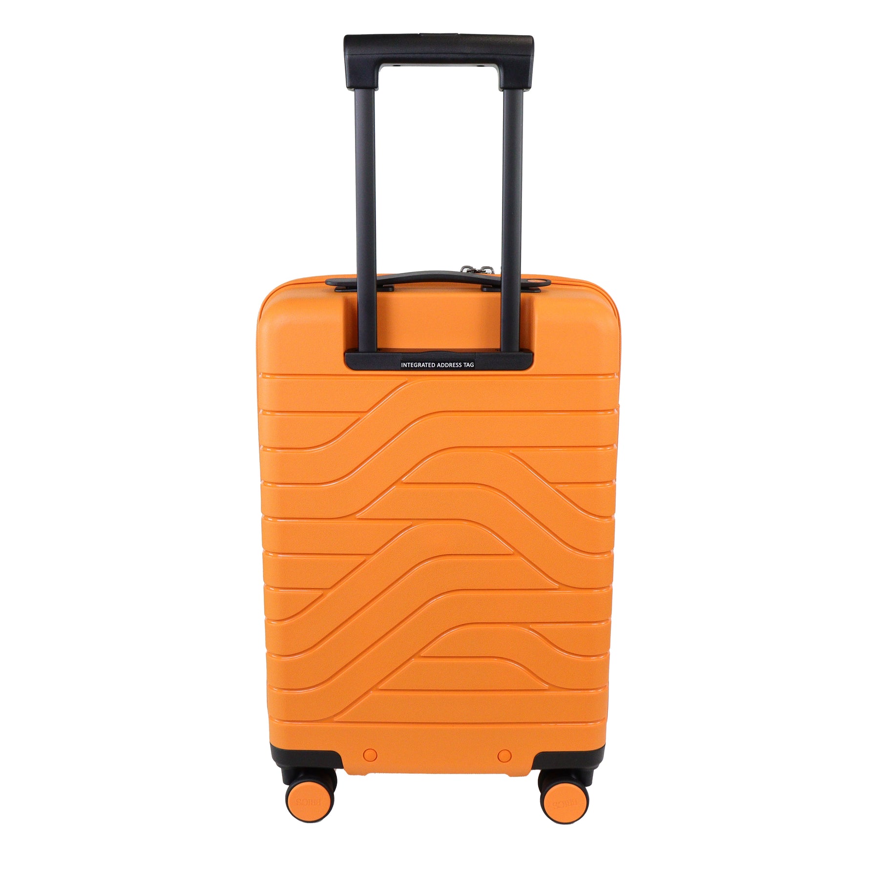 Cabin trolley piccolo rigido arancione di BRICS in polipropilene con chiusura a zip con dettaglio logo del brand. Blocco con codice e ricarica usb. Divisore con taschino con rete e taschino centrale con zip. Misure 37x55x20 cm.