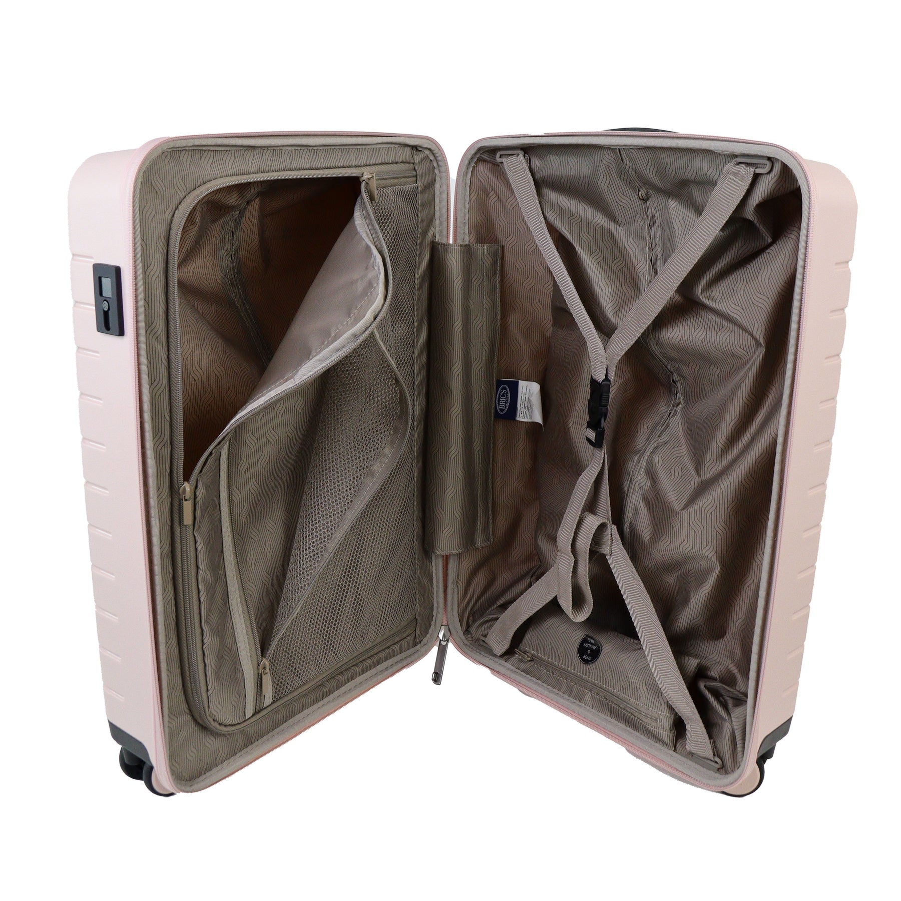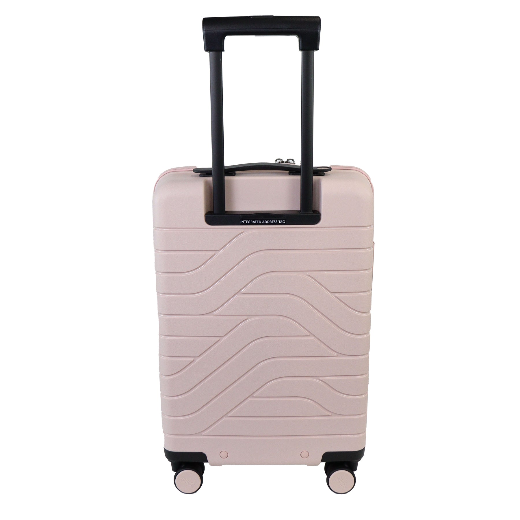 Cabin trolley piccolo rigido rosa di BRICS in polipropilene con chiusura a zip con dettaglio logo del brand. Blocco con codice e ricarica usb. Divisore con taschino con rete e taschino centrale con zip. Misure 37x55x20 cm.