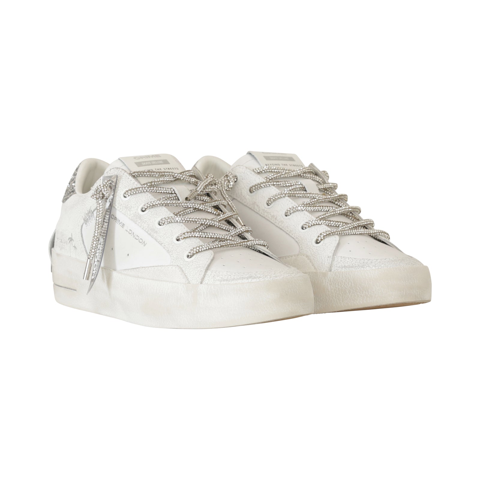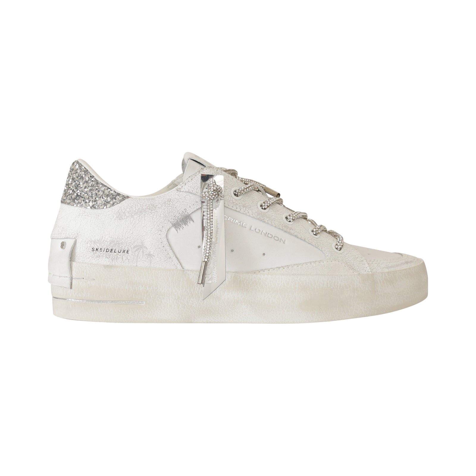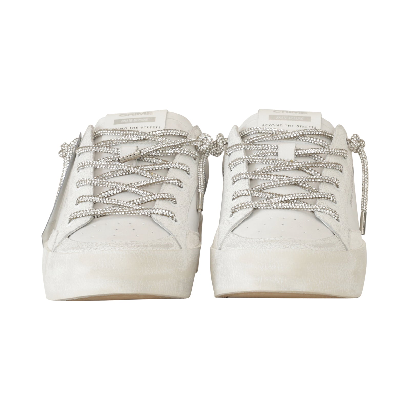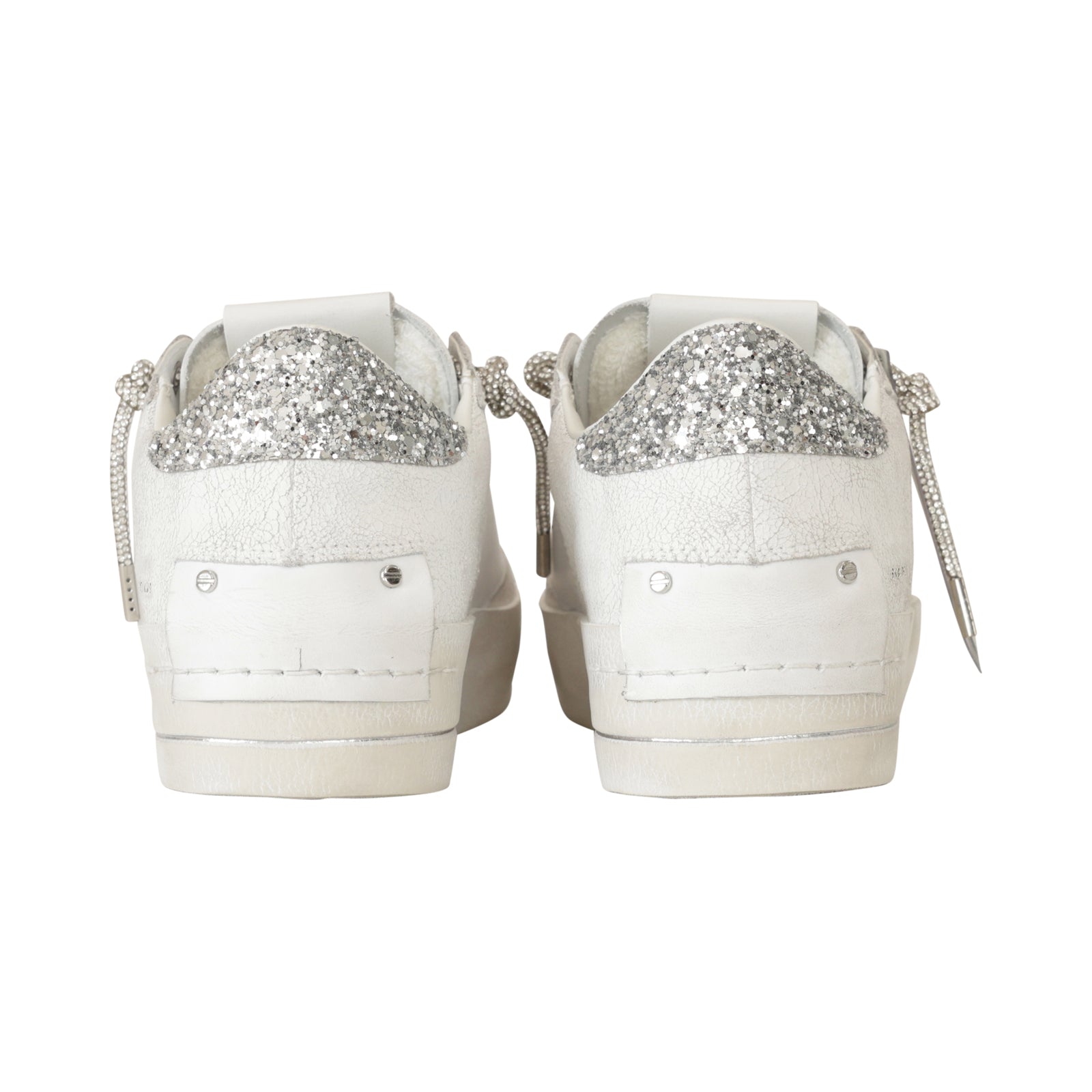 Sneakers SKATE DELUXE HEEL bianca di CRIME in pelle con bordi in pelle crackele bianca, tallone in glitter argento, lacci con cristalli e zeppa interna di 2cm. Fondo in gomma effetto used