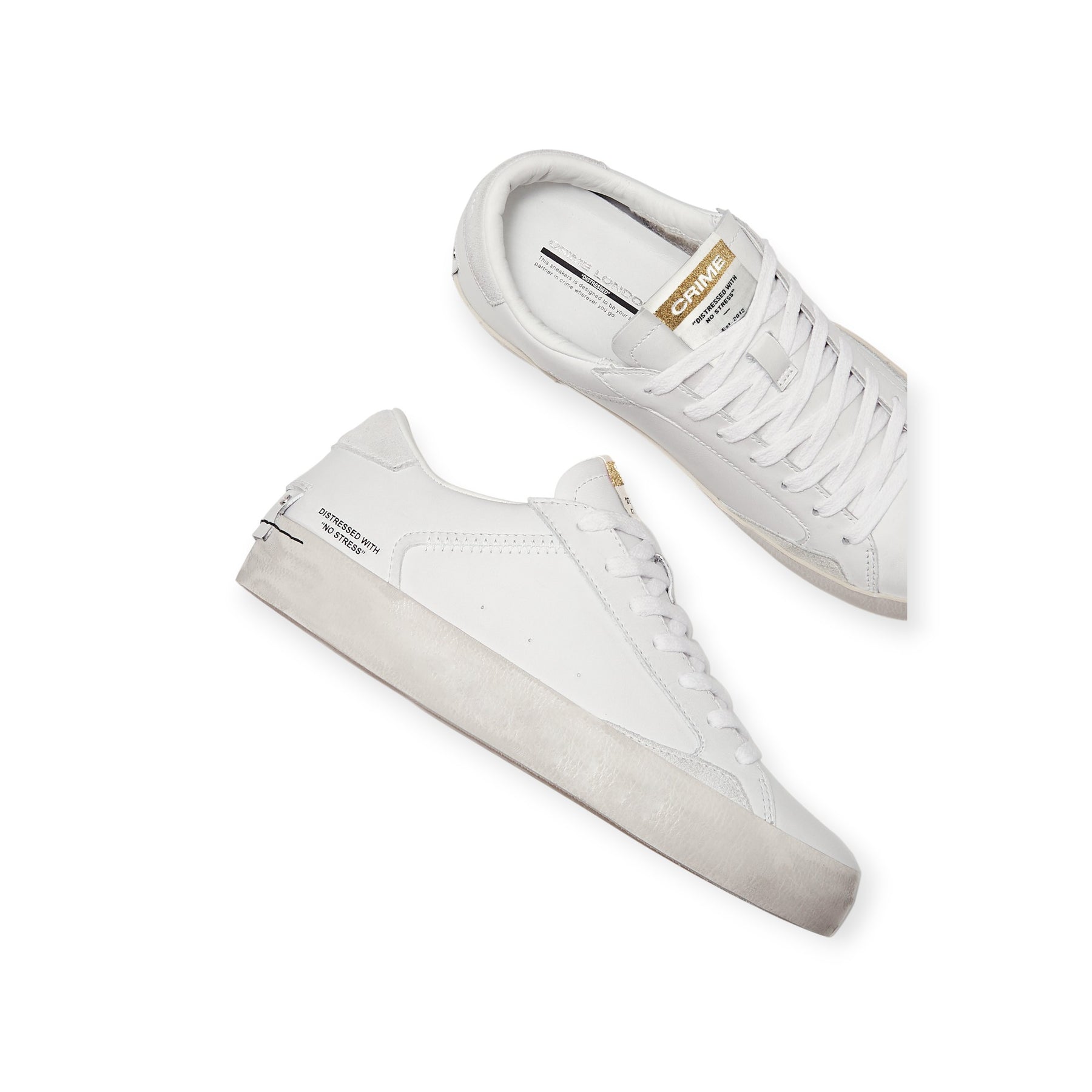 Sneakers DISTRESSED bianca di CRIME in pelle con punta tonda, profilo e talloncino posteriore in camoscio bianco. Fondo in gomma.
