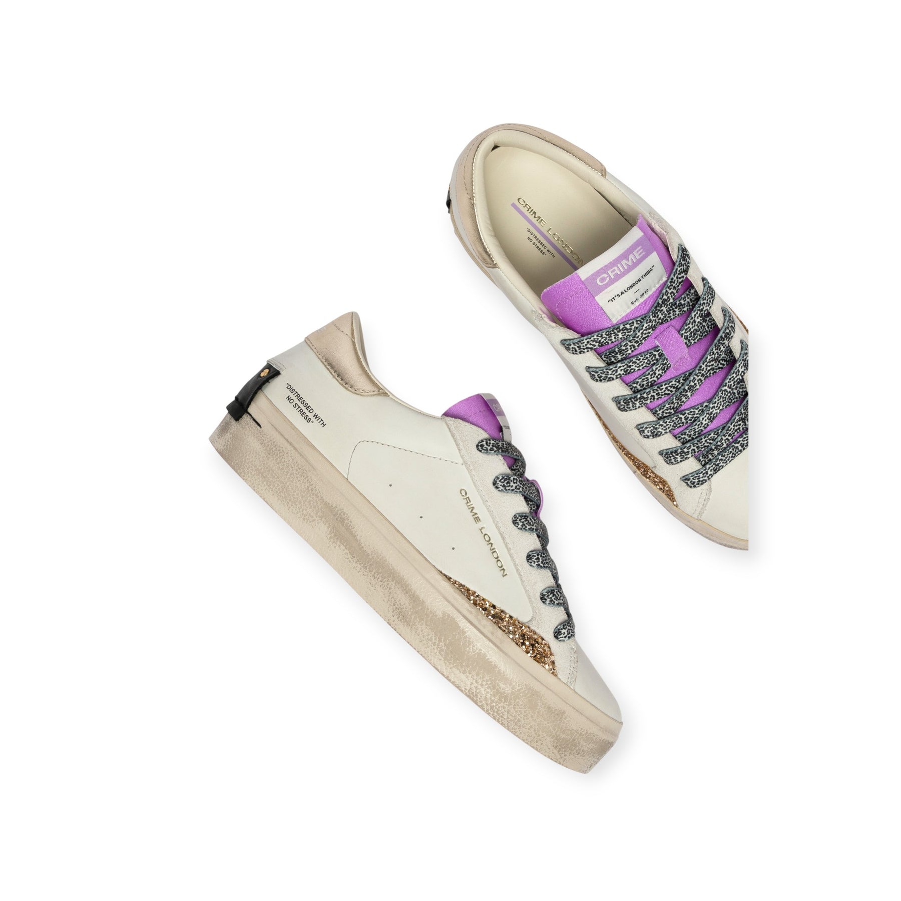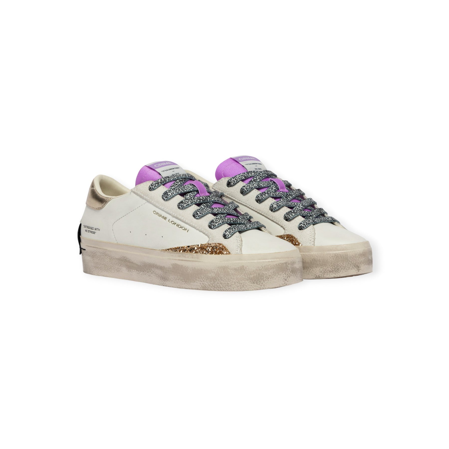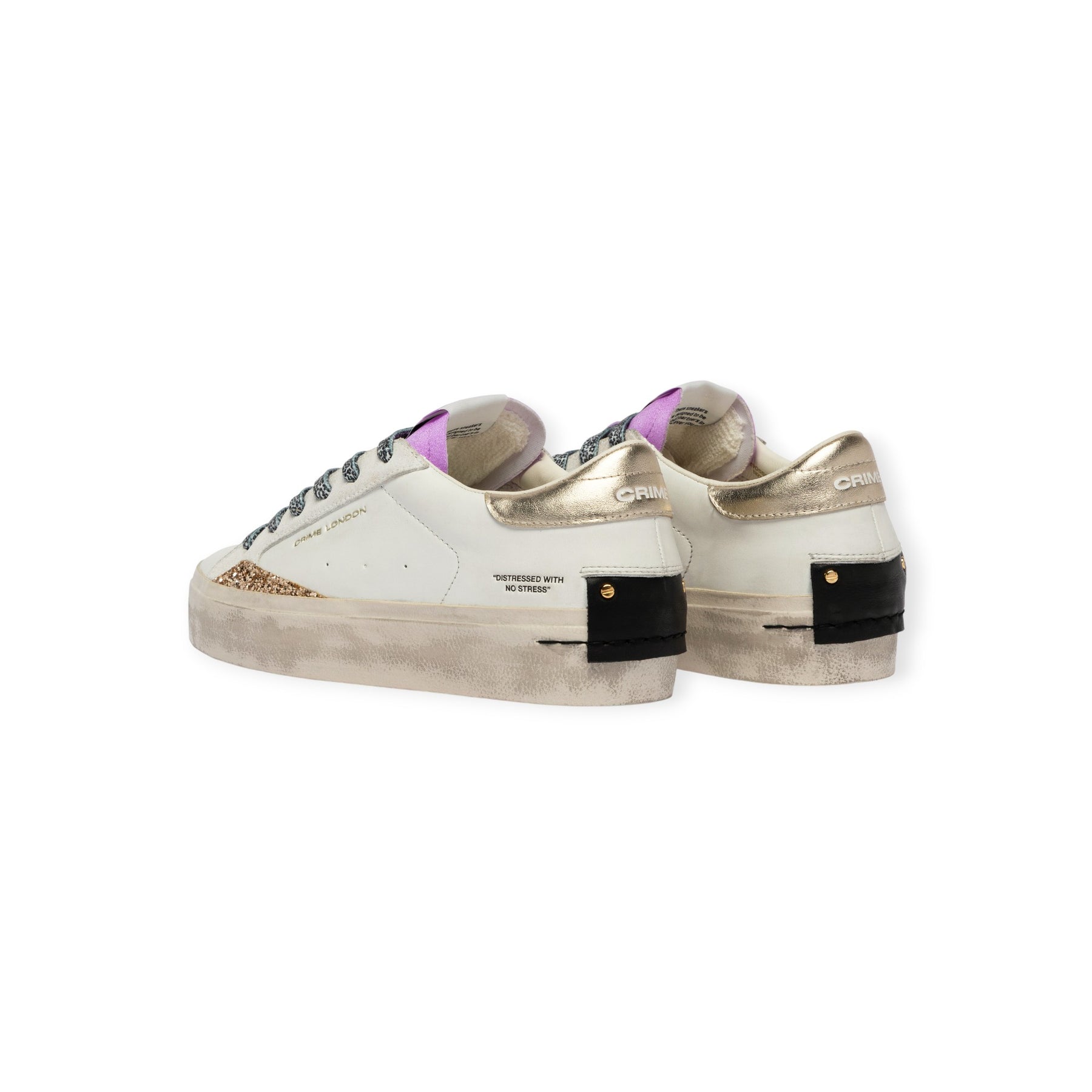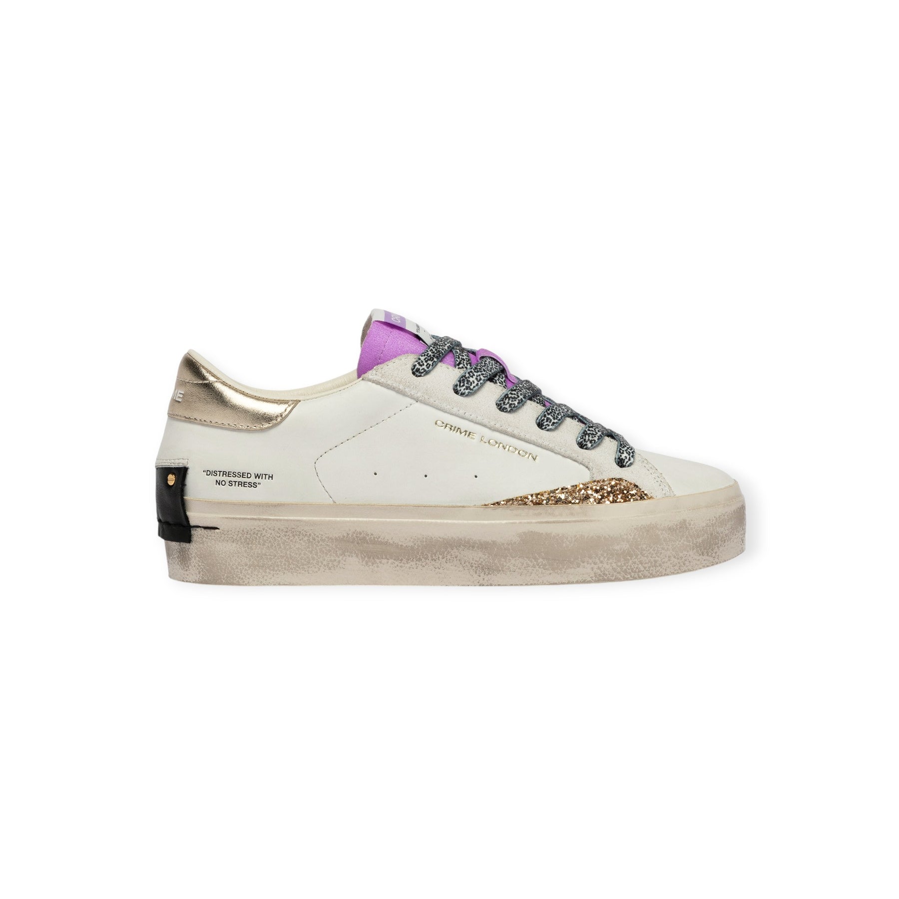 Sneakers DISTRESSED bianca di CRIME in pelle con punta tonda, profilo in glitter oro, talloncino posteriore in pelle laminata rame, linguetta in tessuto viola. Fondo in gomma.