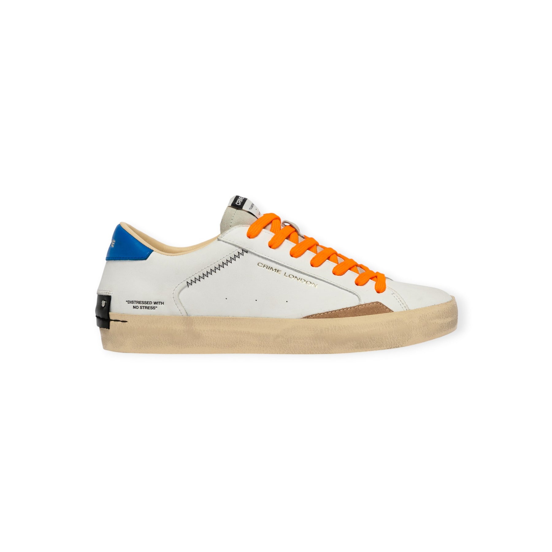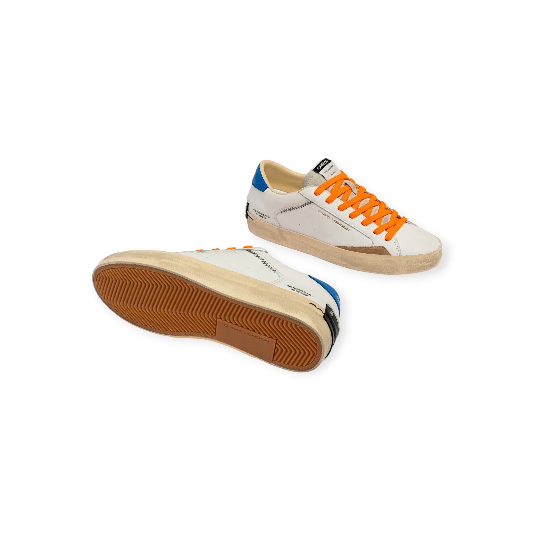 Sneakers DISTRESSED bianca di CRIME in pelle con profilo in camoscio cuoio, talloncino posteriore in pelle blu cobalto con logo lettering. Fondo in gomma.