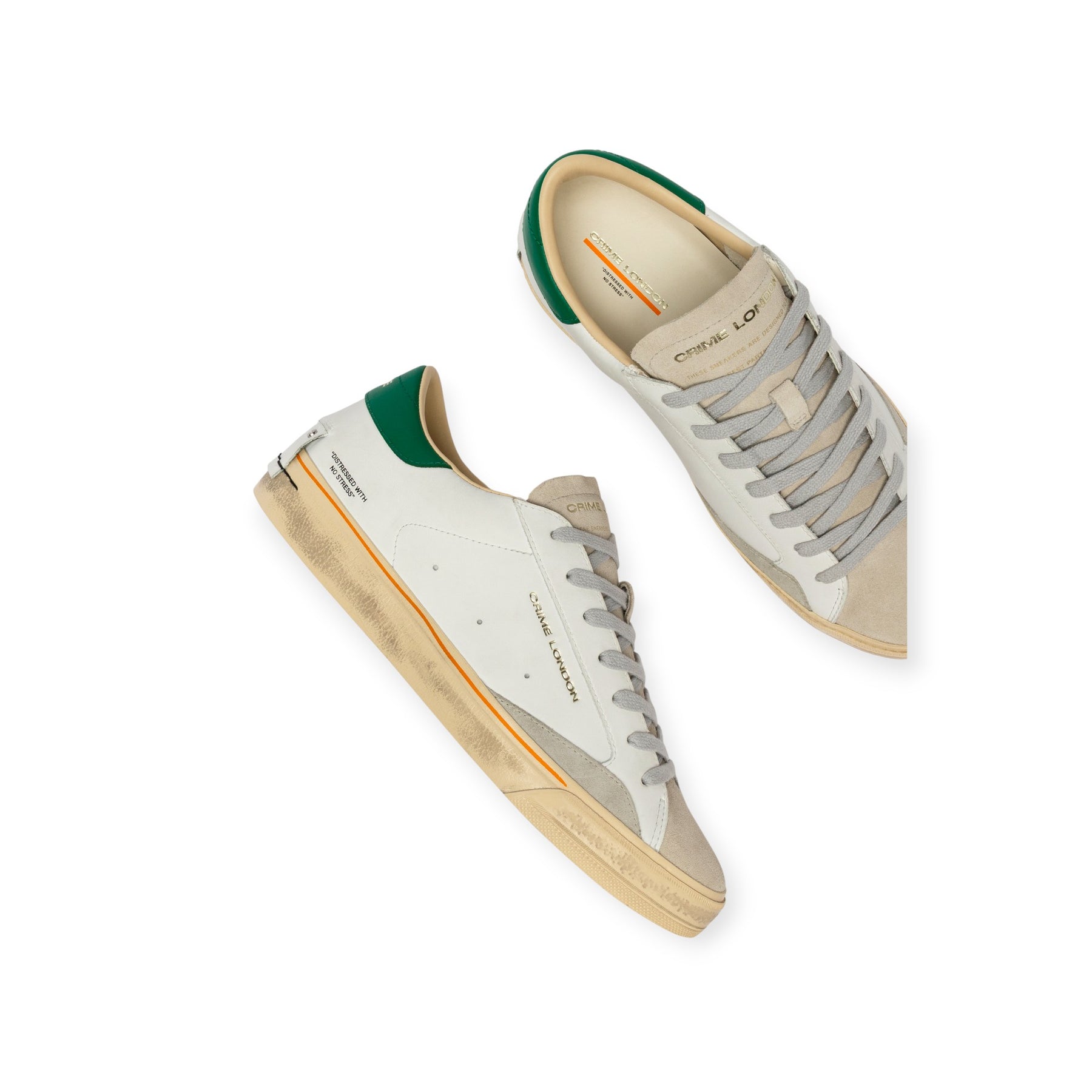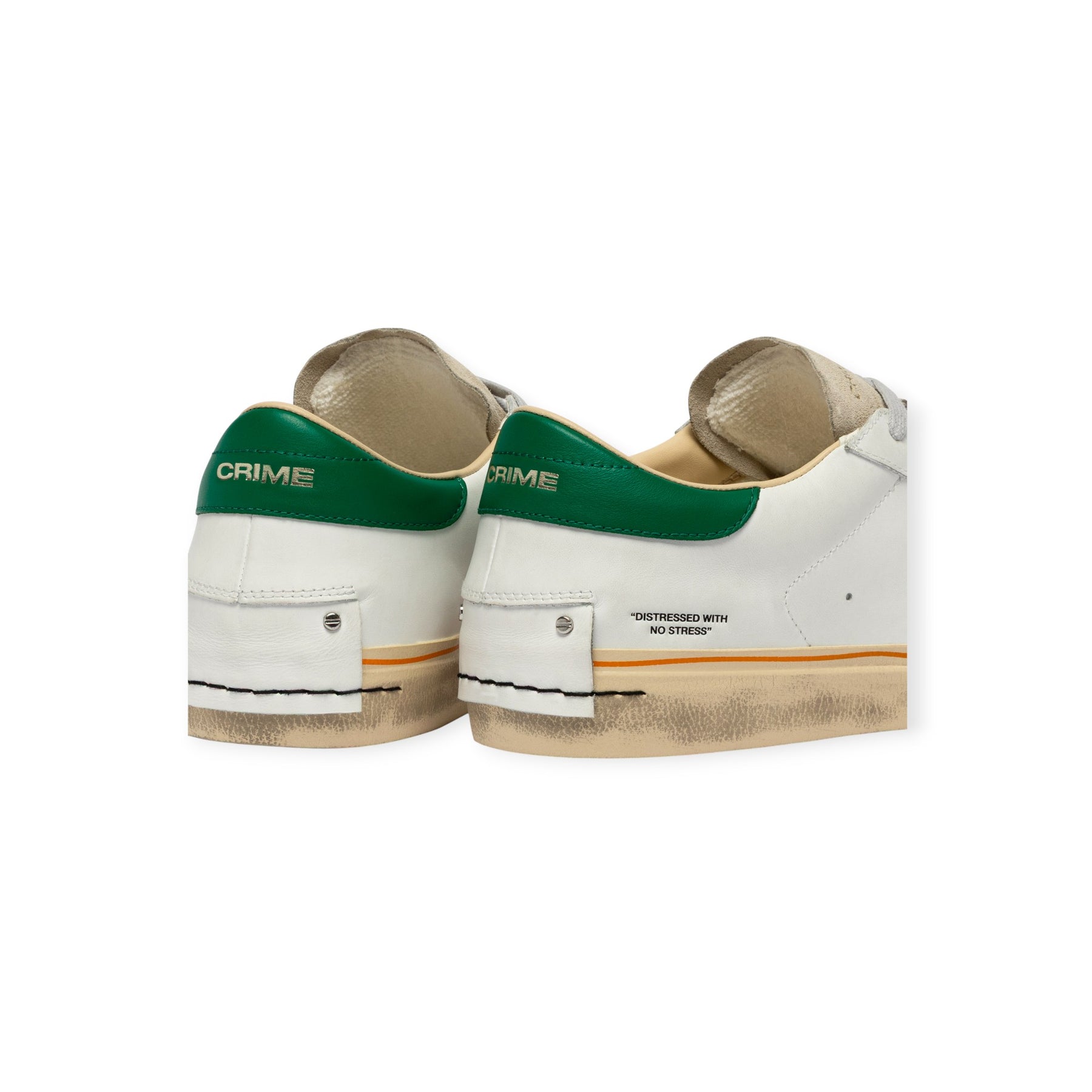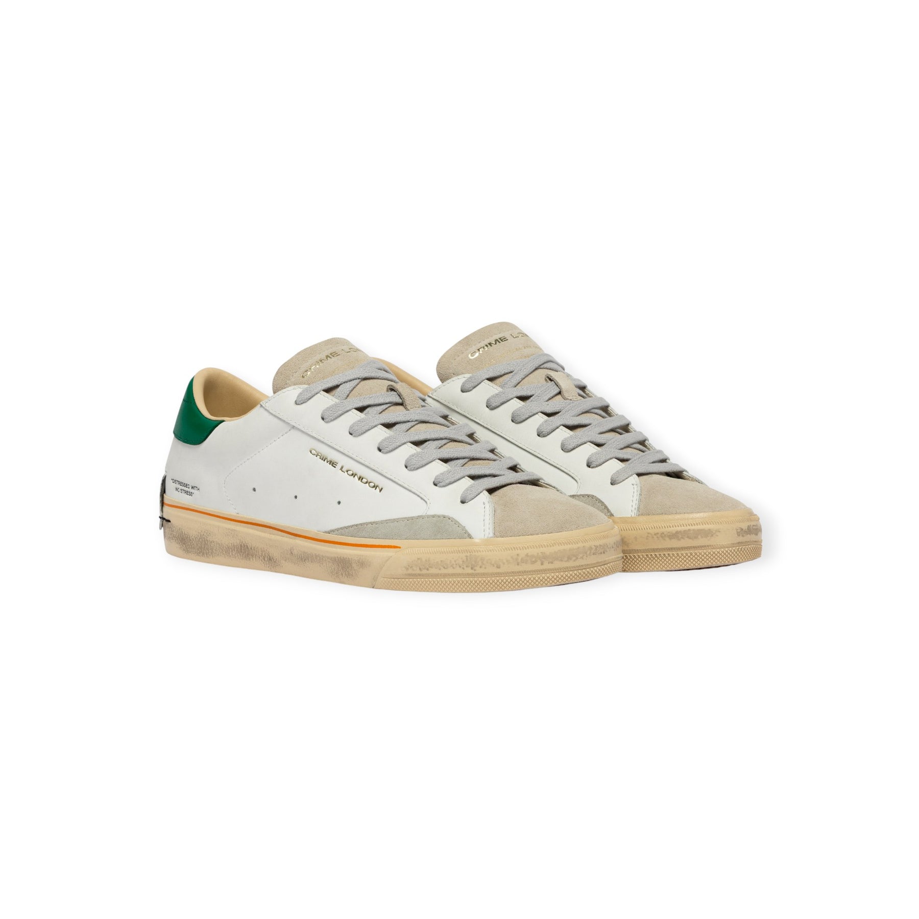 Sneakers DISTRESSED bianca di CRIME in pelle con profilo, punta e linguetta in camoscio beige, talloncino posteriore in pelle verde con logo lettering. Fondo in gomma.