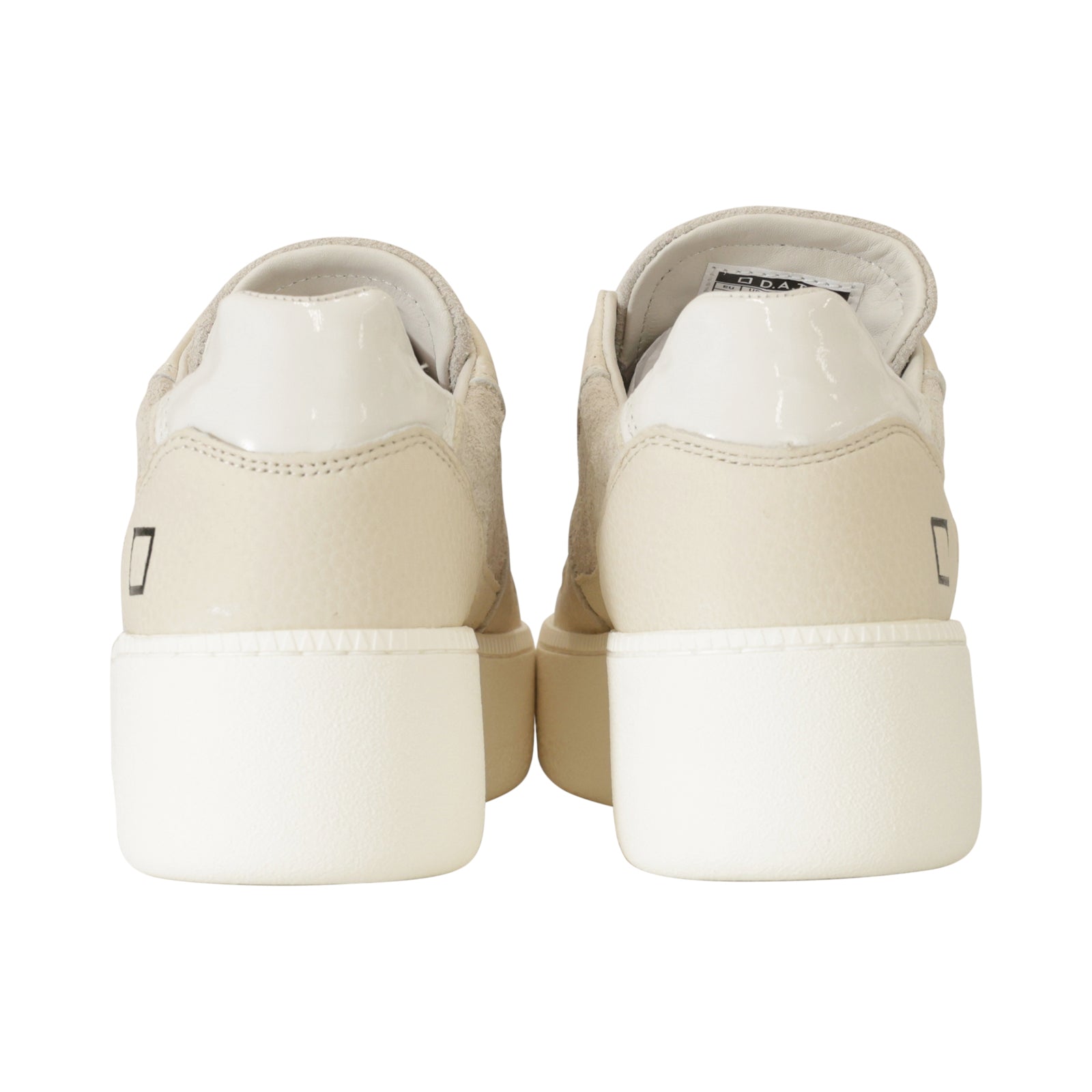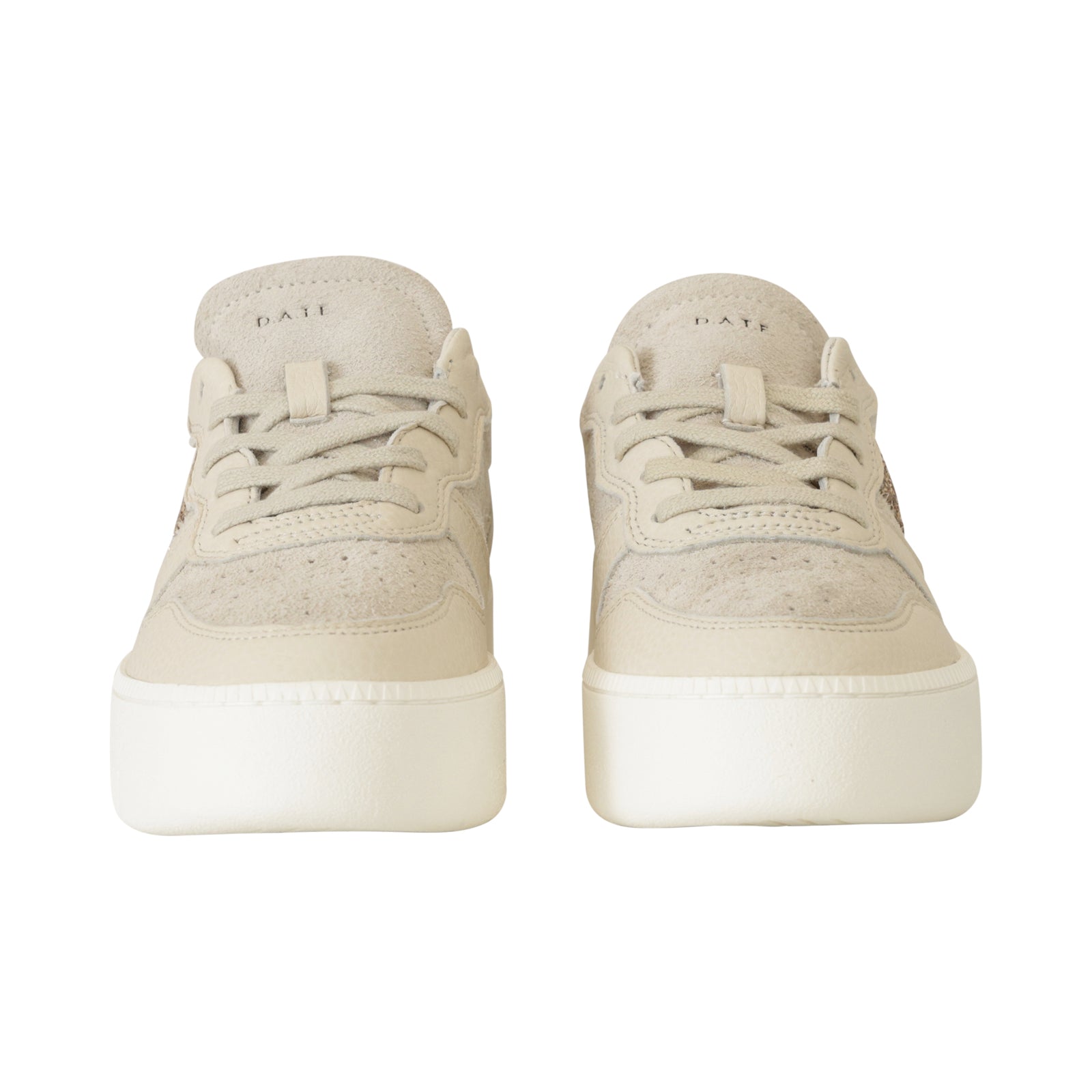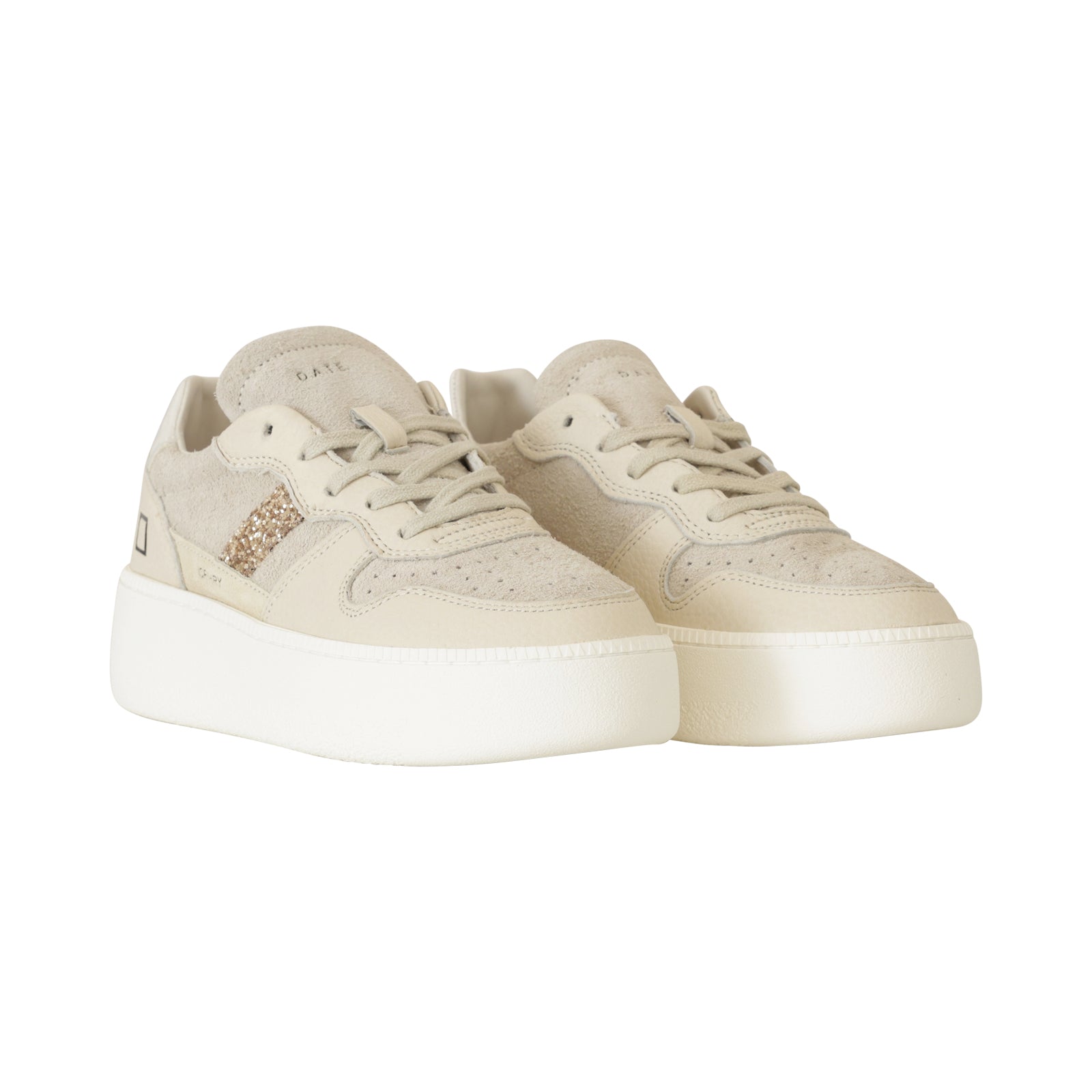 Sneakers COURT PLATFORM beige di DATE in camoscio con bordi in pelle beige, tallone in pelle crema e profili in glitter oro. Punta microforata. Fondo in gomma platform alto 30mm.