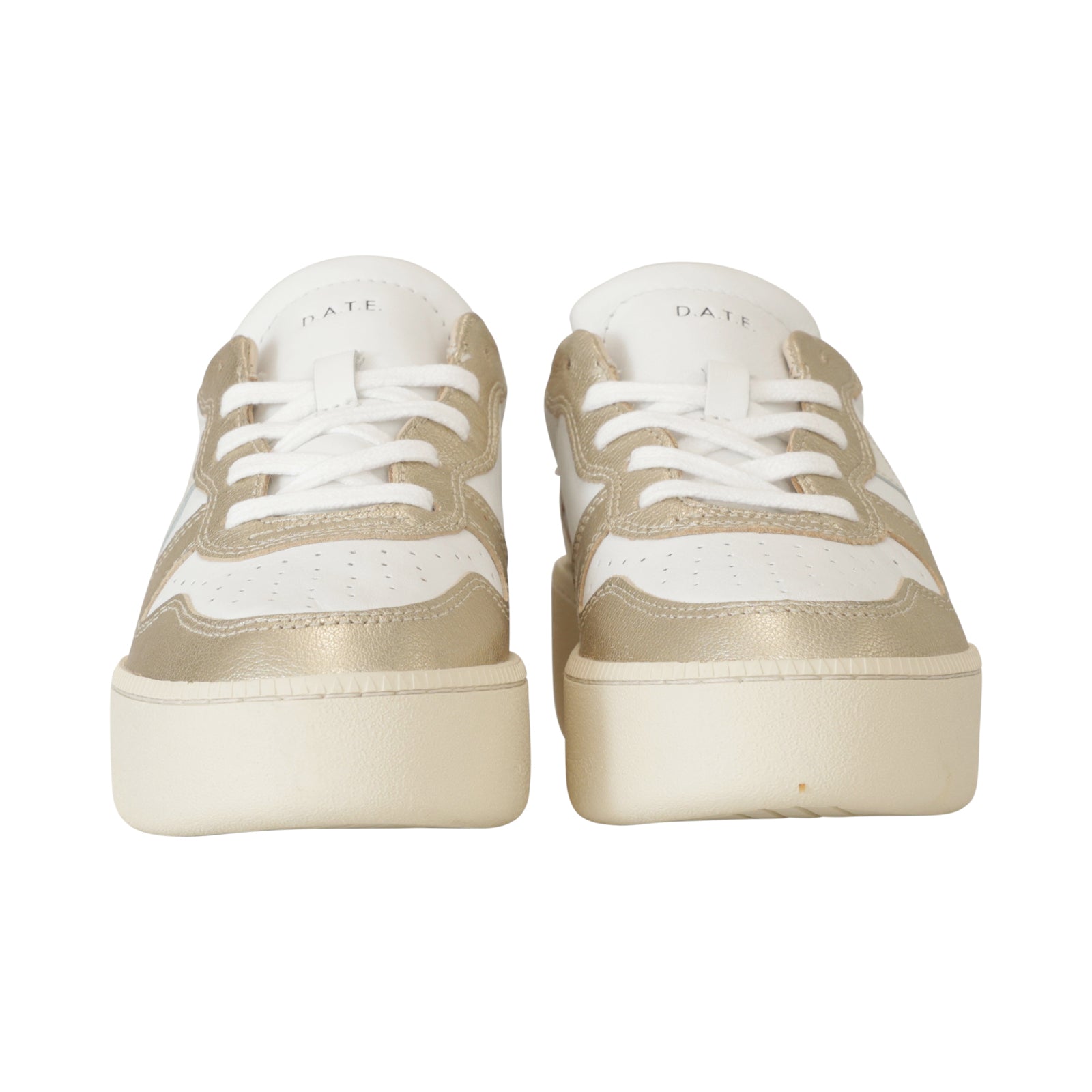 Sneakers COURT PLATFORM bianca di DATE in pelle con bordi in pelle laminata oro, tallone in pelle platino, profili in vernice beige. Punta microforata. Fondo in gomma platform alto 30mm.