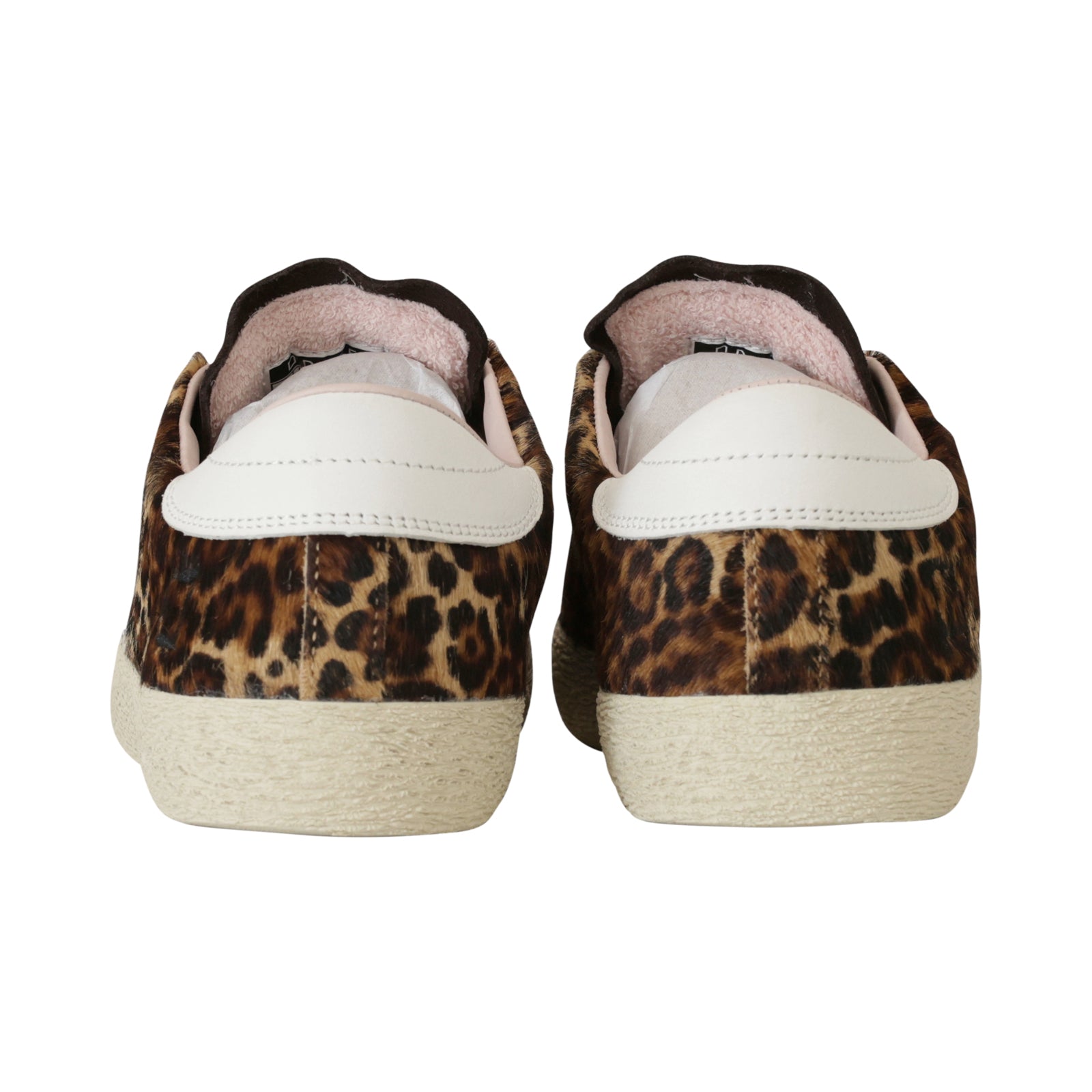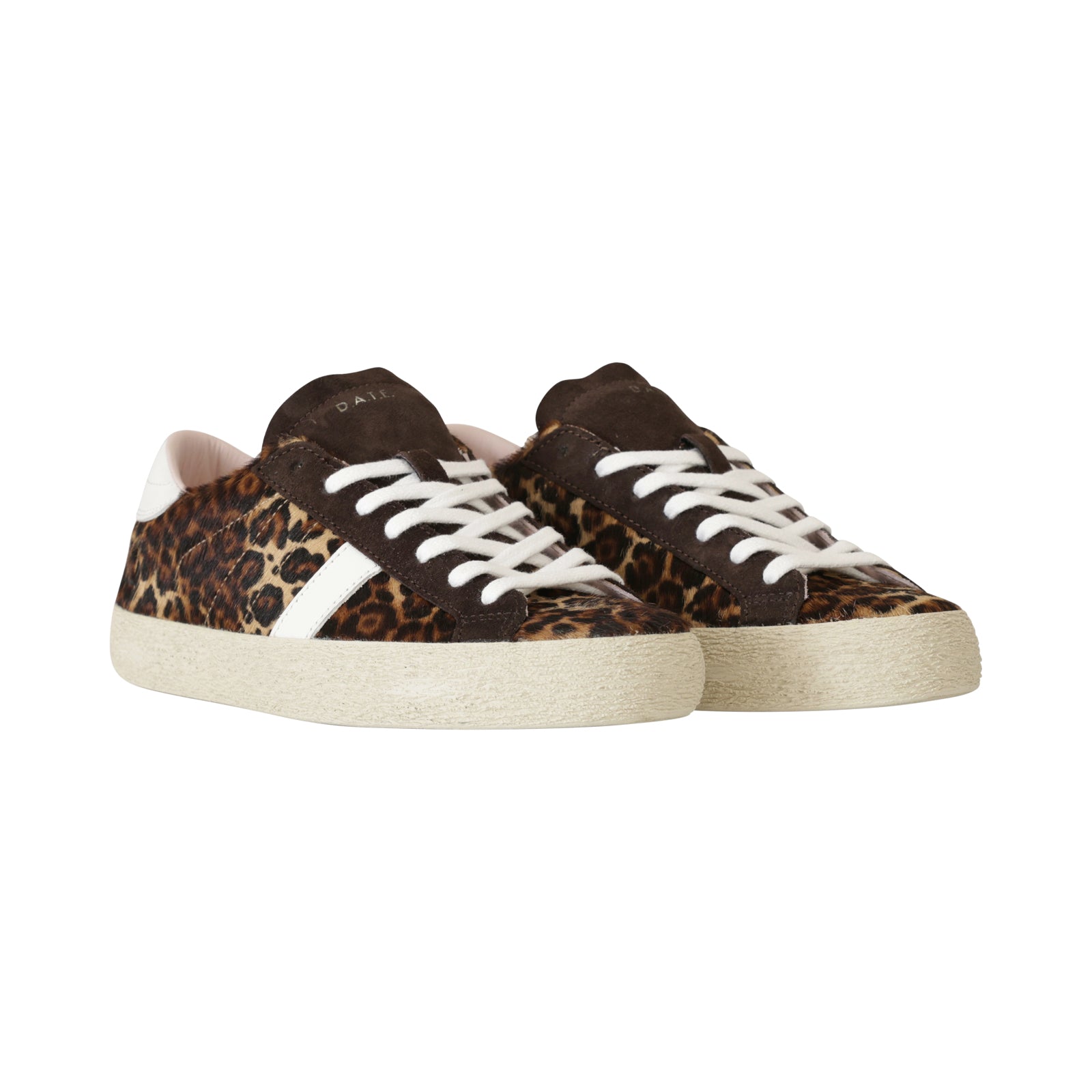 Sneakers HILL LOW leopardata di DATE in cavallino con bordi in camoscio marrone, tallone e profili in pelle bianca. Fondo in gomma.
