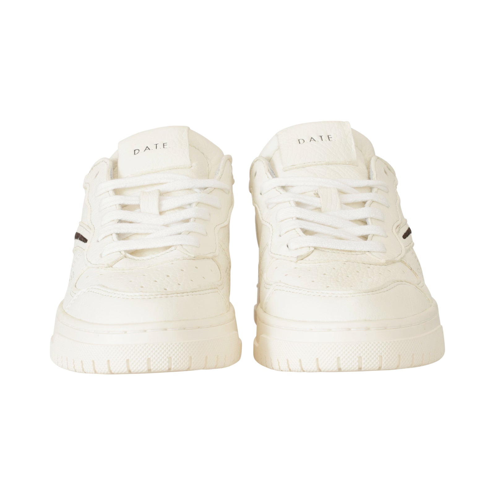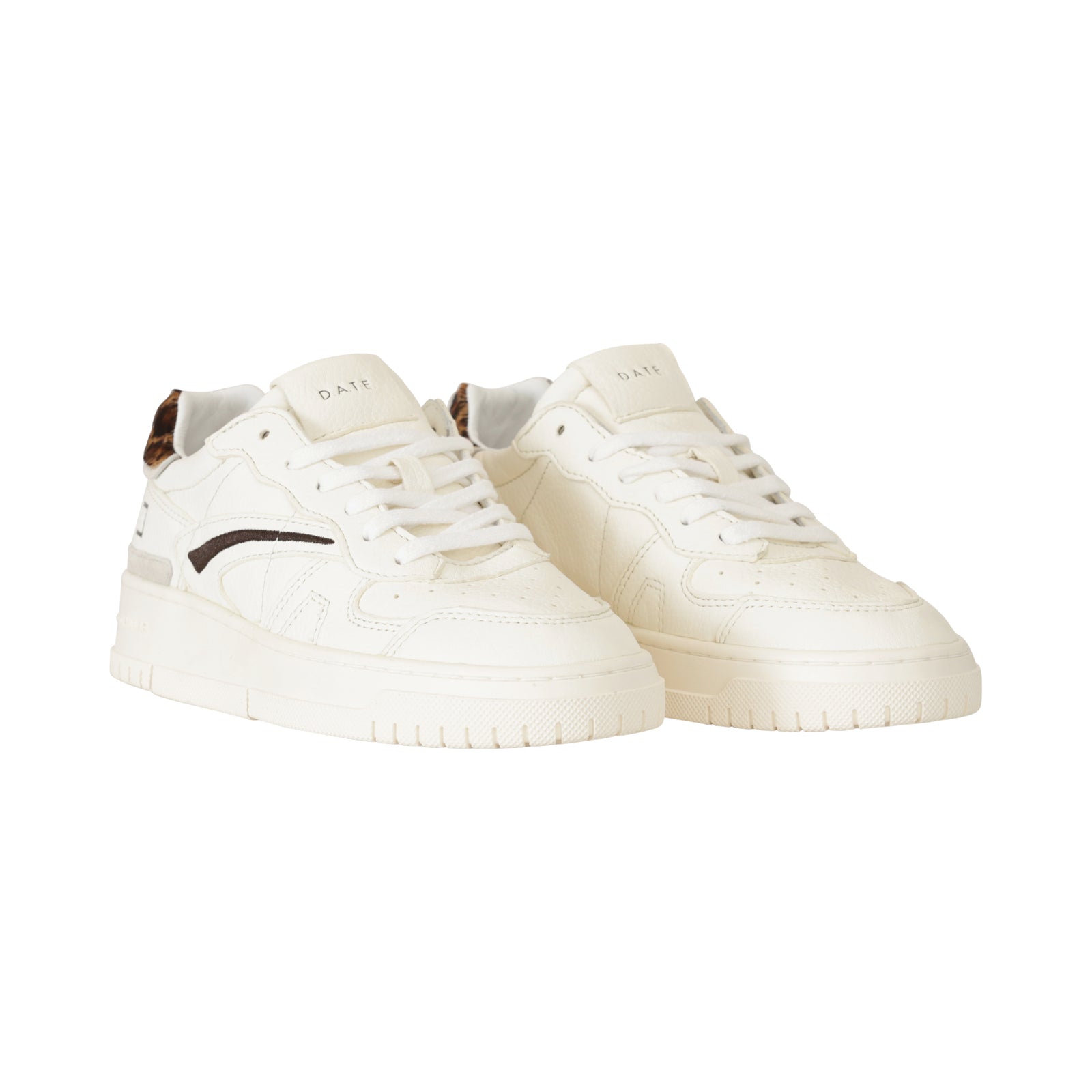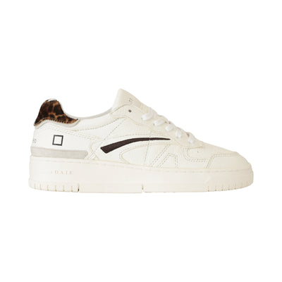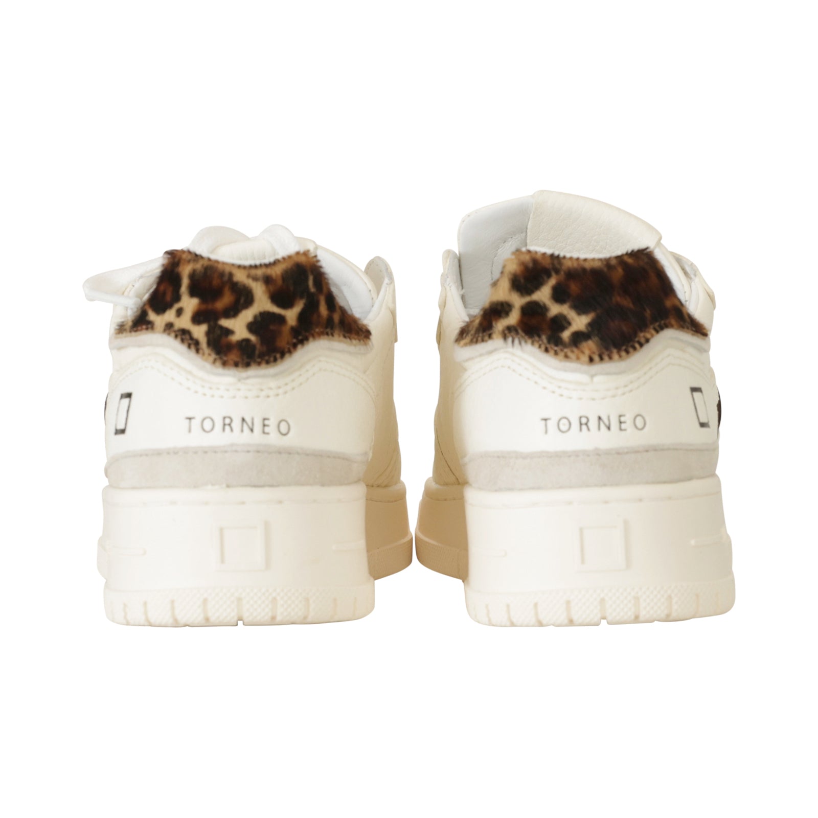 Sneakers TORNEO bianca di DATE in pelle con tallone in cavallino leopardato profili in camoscio beige e marrone, punta microforata e fondo in gomma.