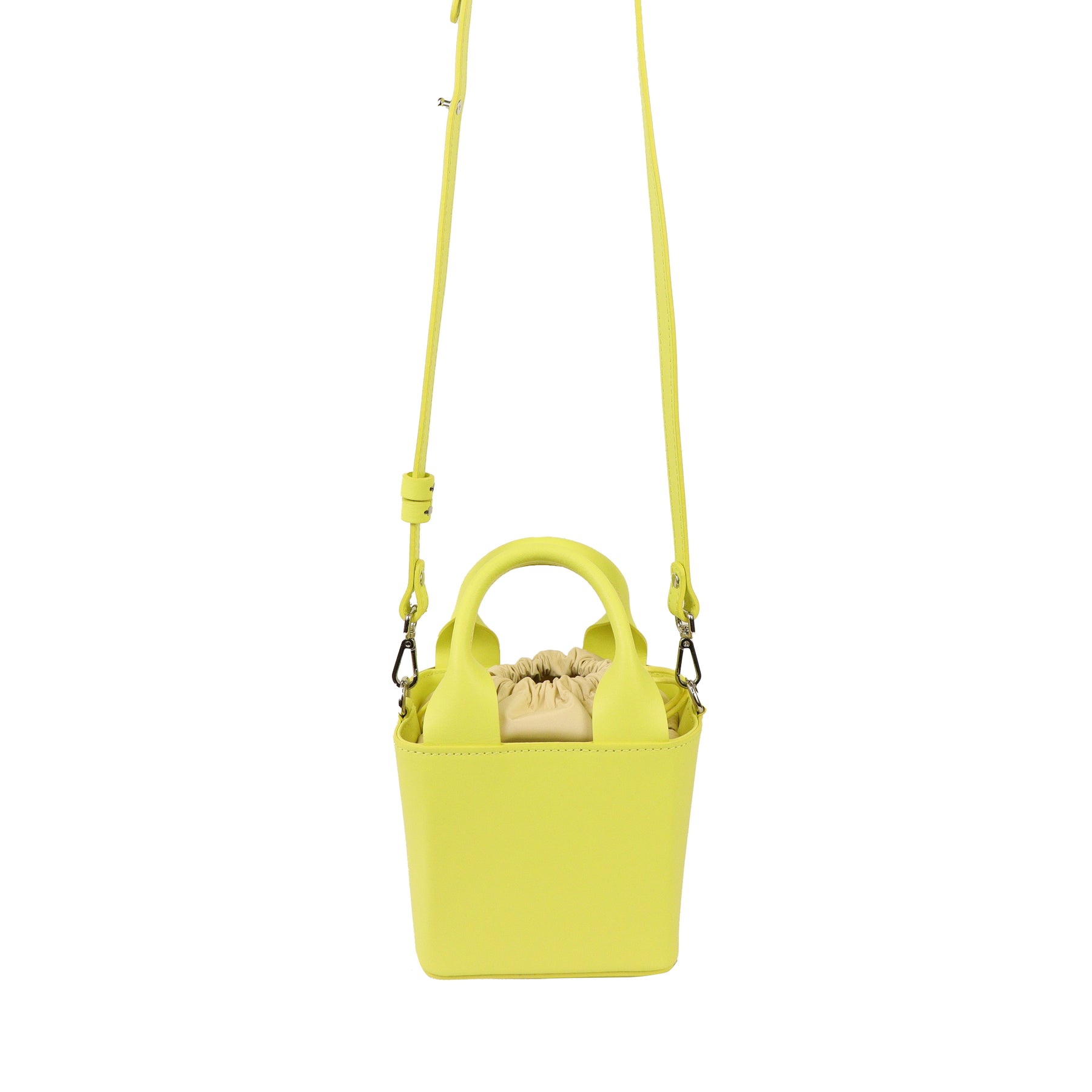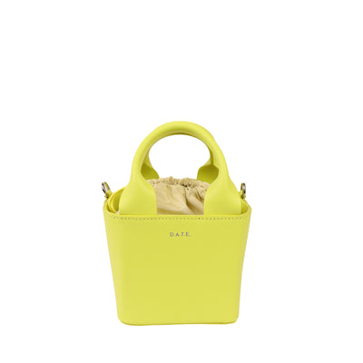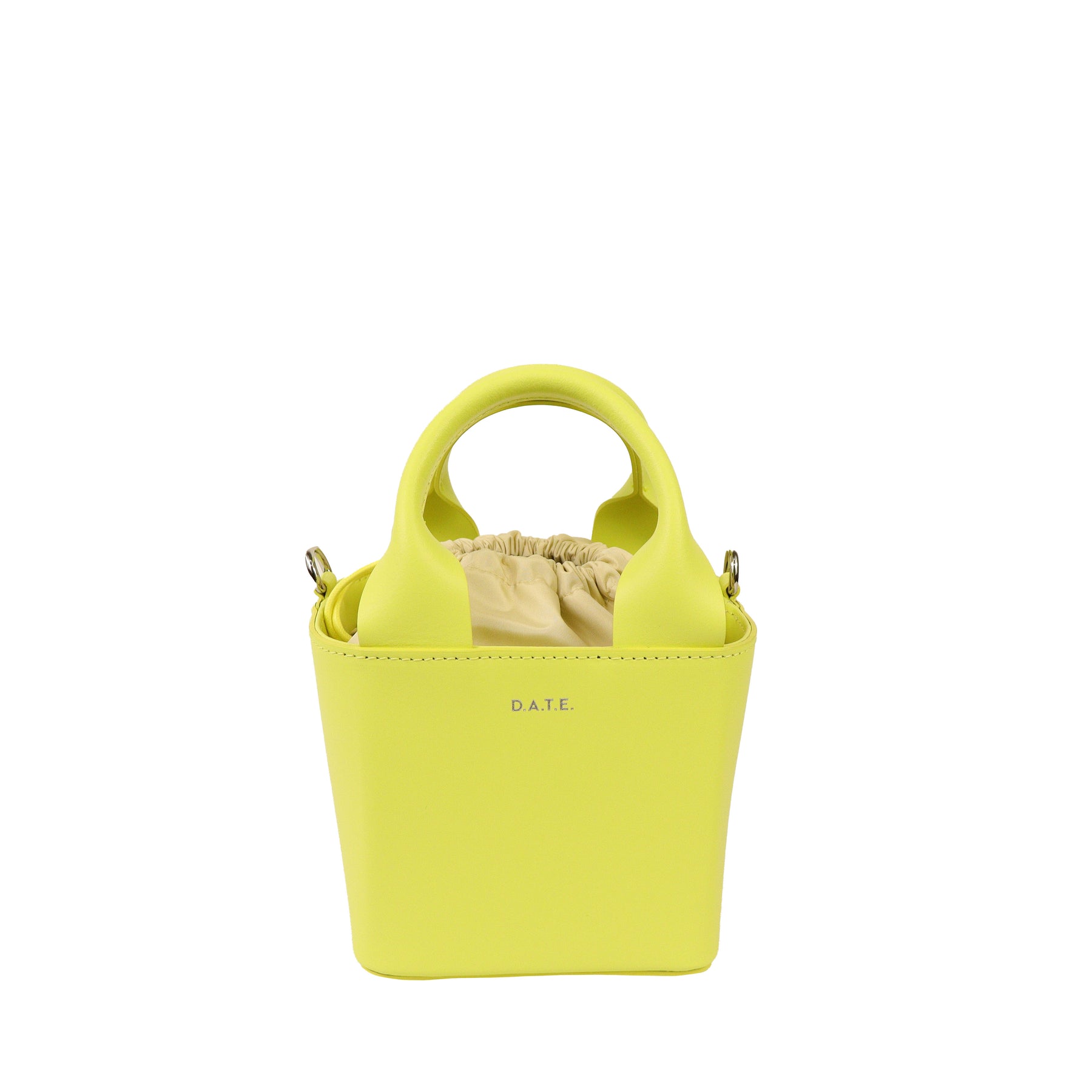 Secchiello giallo di DATE in pelle con doppio manico, chiusura con lacci e tracolla interna. Misure 13x13x14cm.