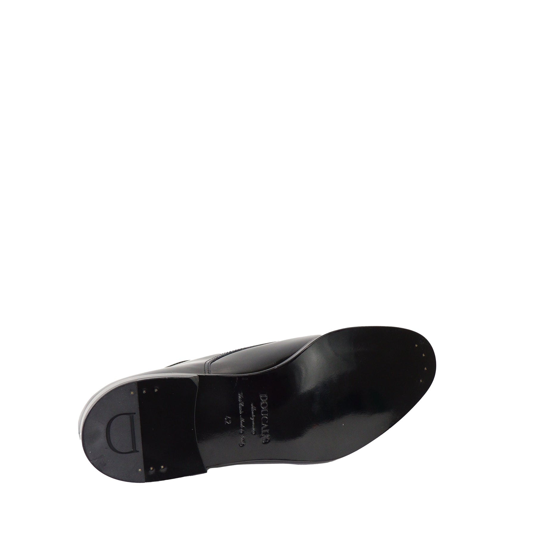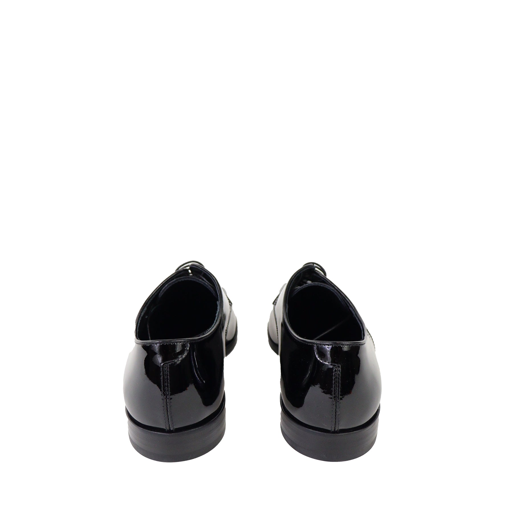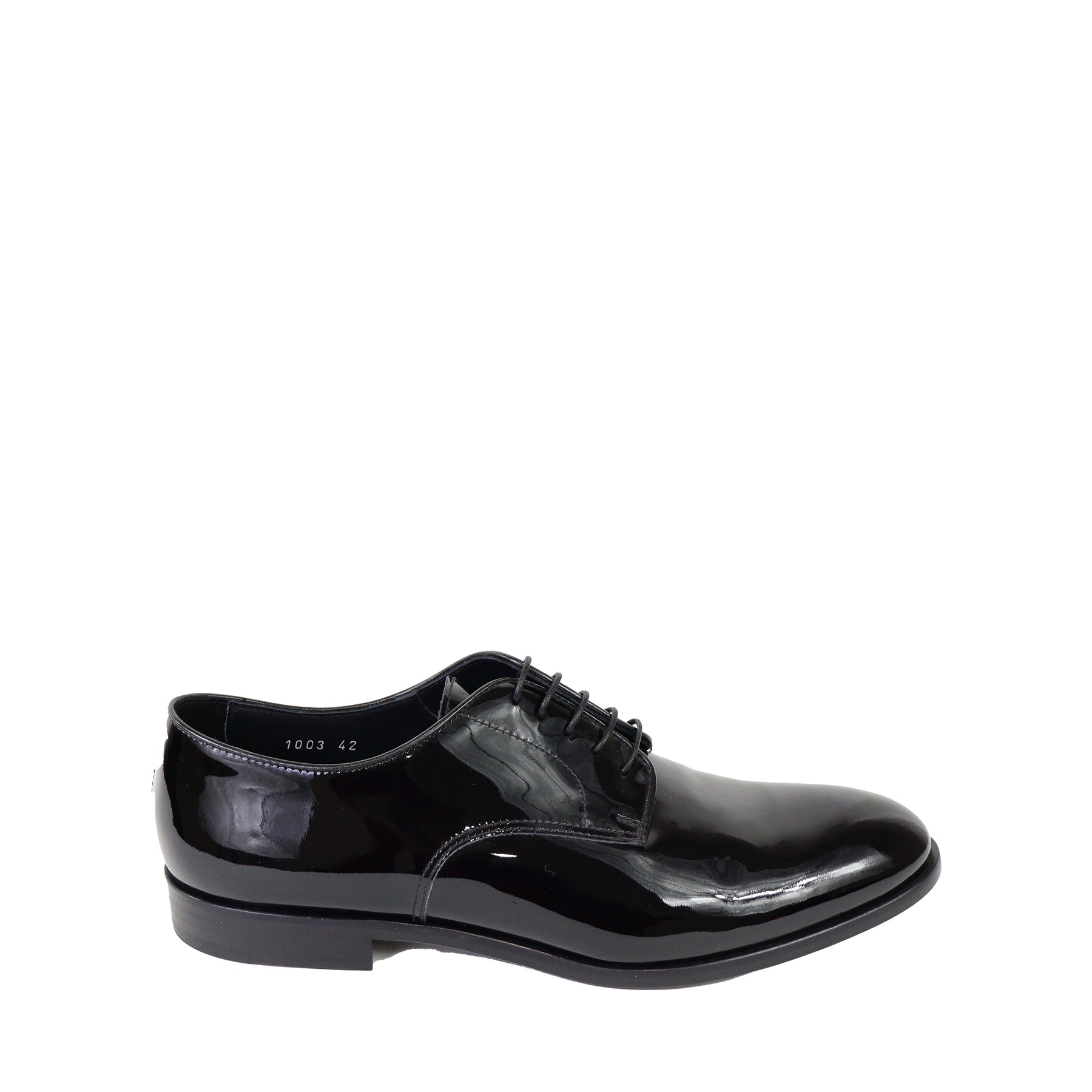 Scarpa derby nera di DOUCALS in vernice con cuciture in tinta, liscia e con fondo in cuoio nero.