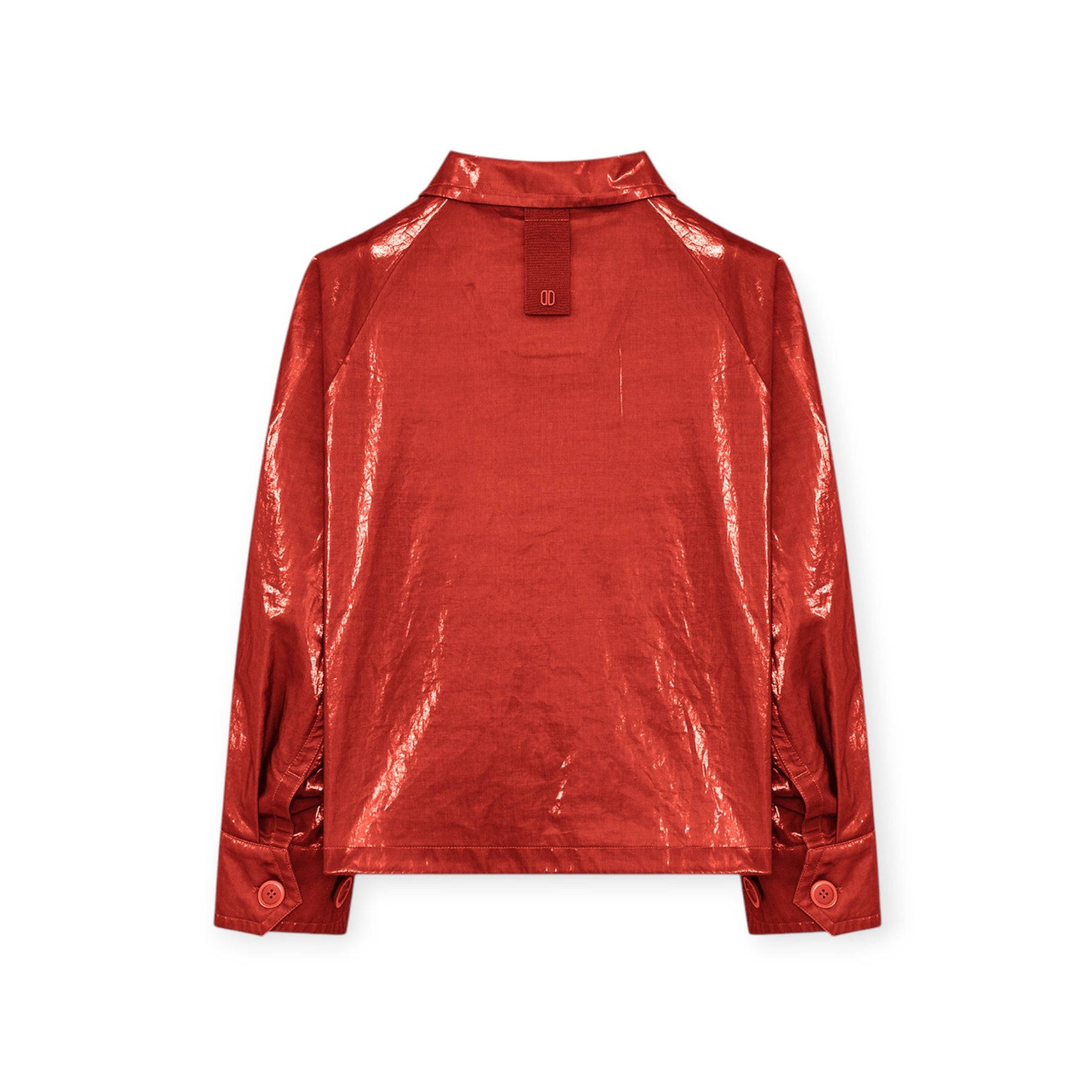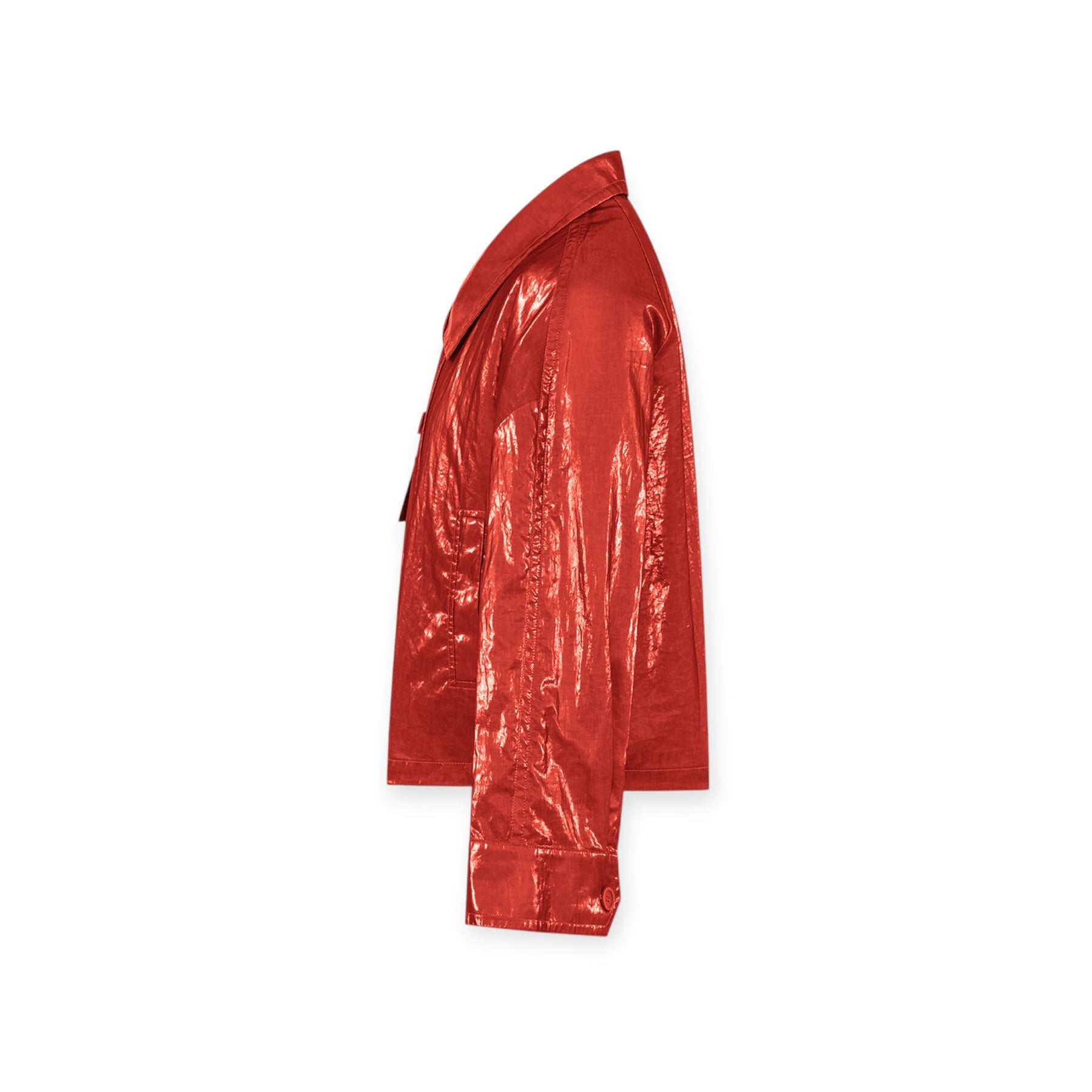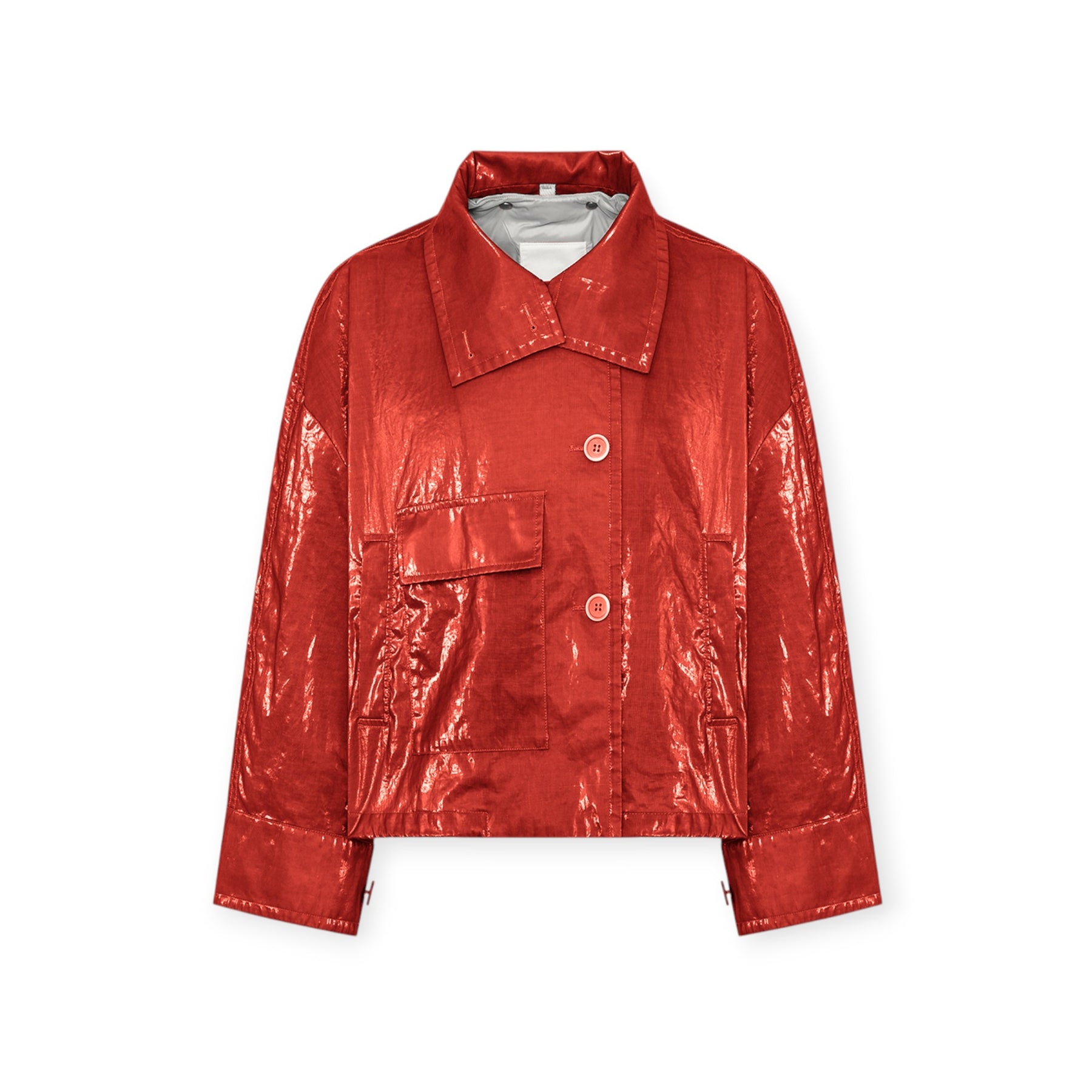 Giacca ELINA corallo di DUNO in ramie con collo ampio, modello effetto doppio petto, due bottoni, tasca applicata con patta e due tasche laterali a filetto.