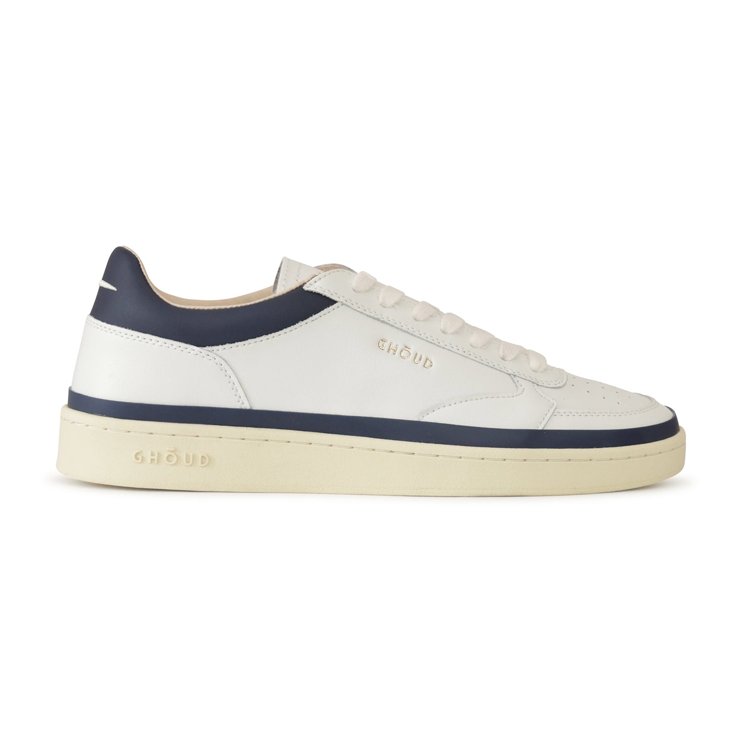 Sneakers PADS bianca di GHOUD in pelle con punta microforata, collarino e profilo del fondo in blu, fondo in gomma.