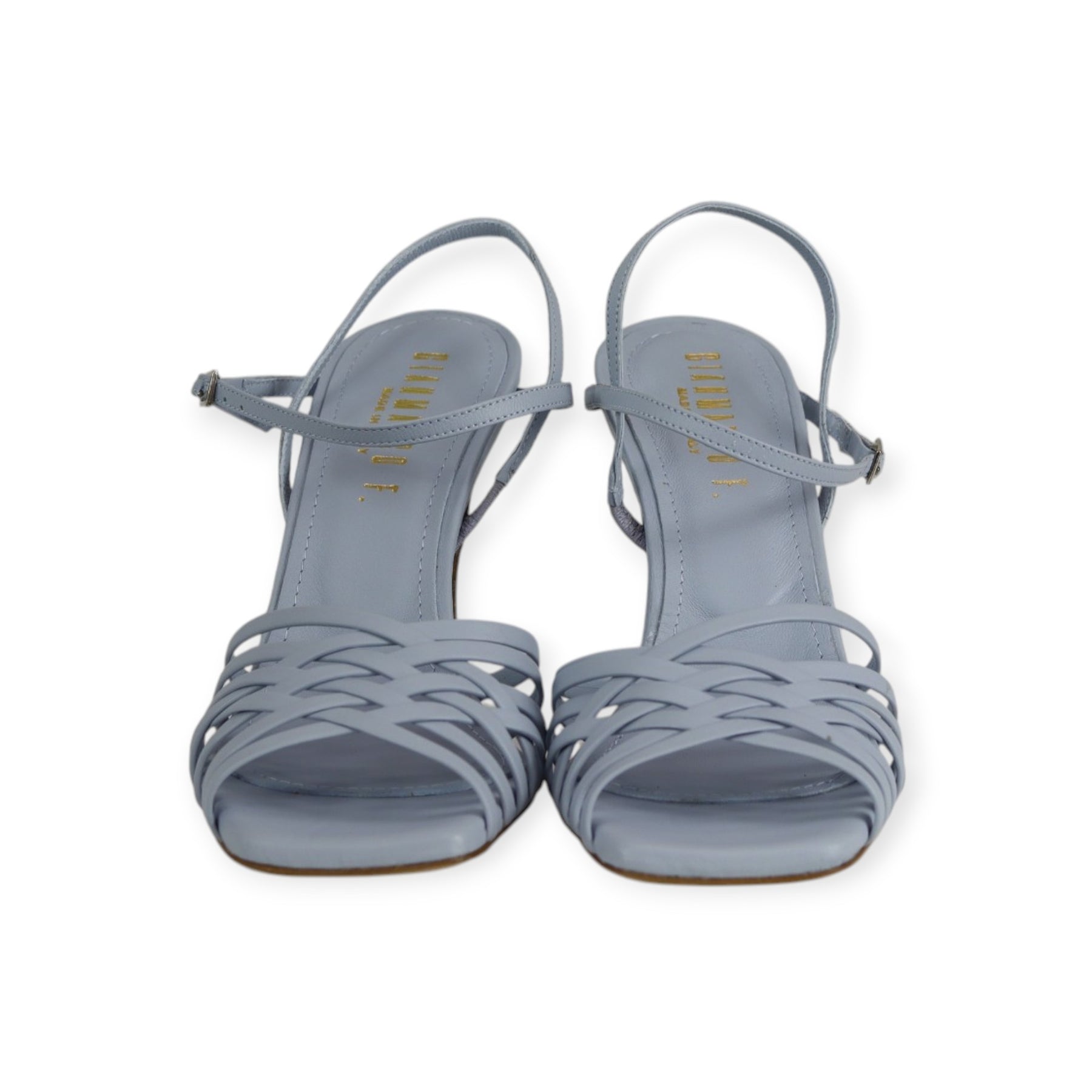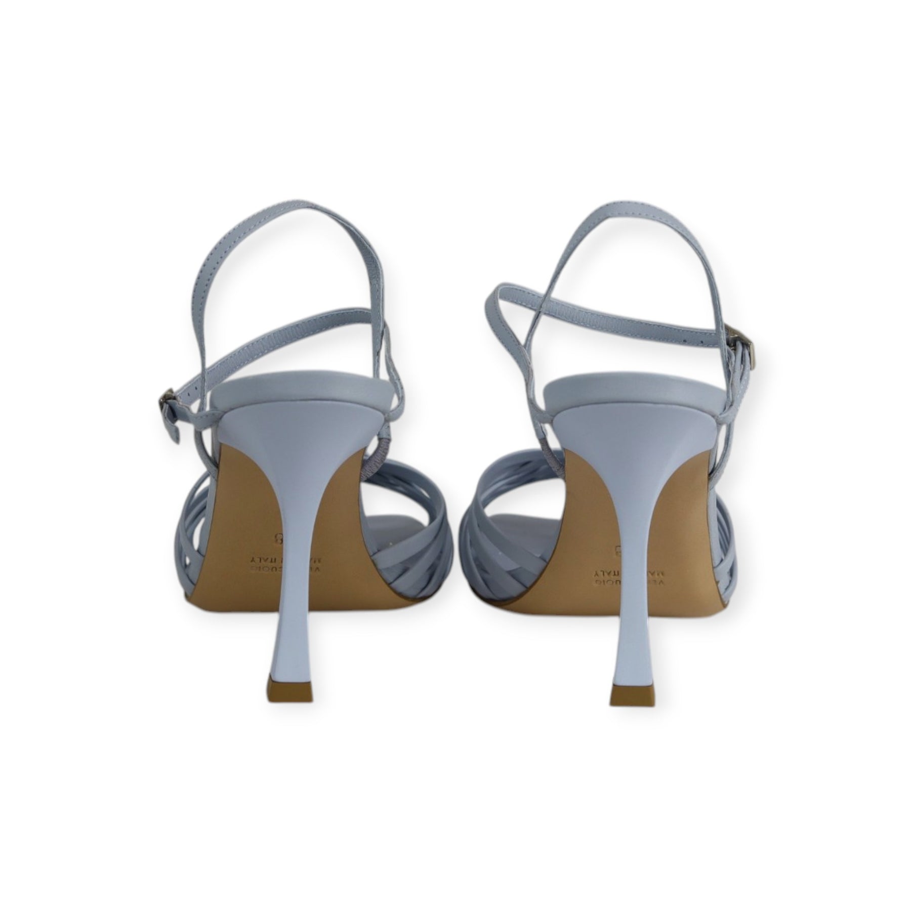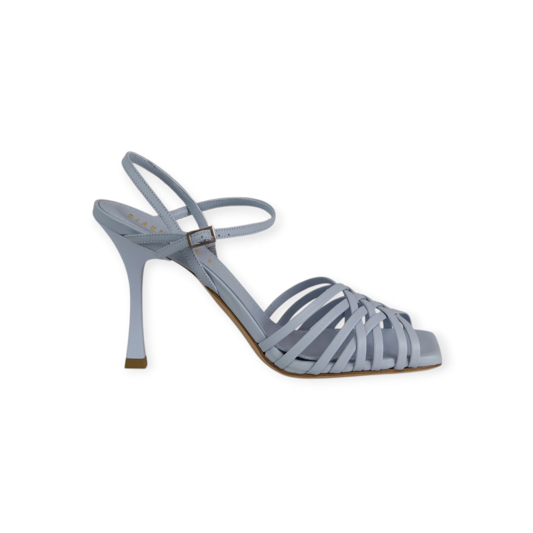 Sandalo azzurro di GIANMARCO F. in pelle con cinturino con fibbietta alla caviglia, forma leggermente squadrata, tacco 95mm.
