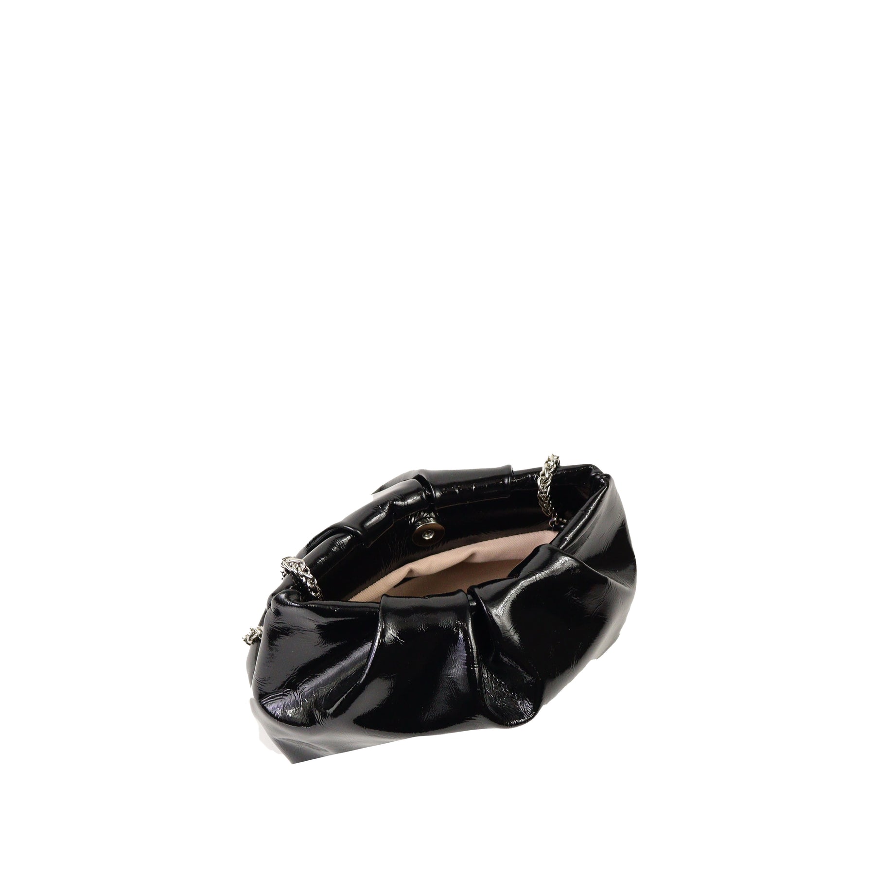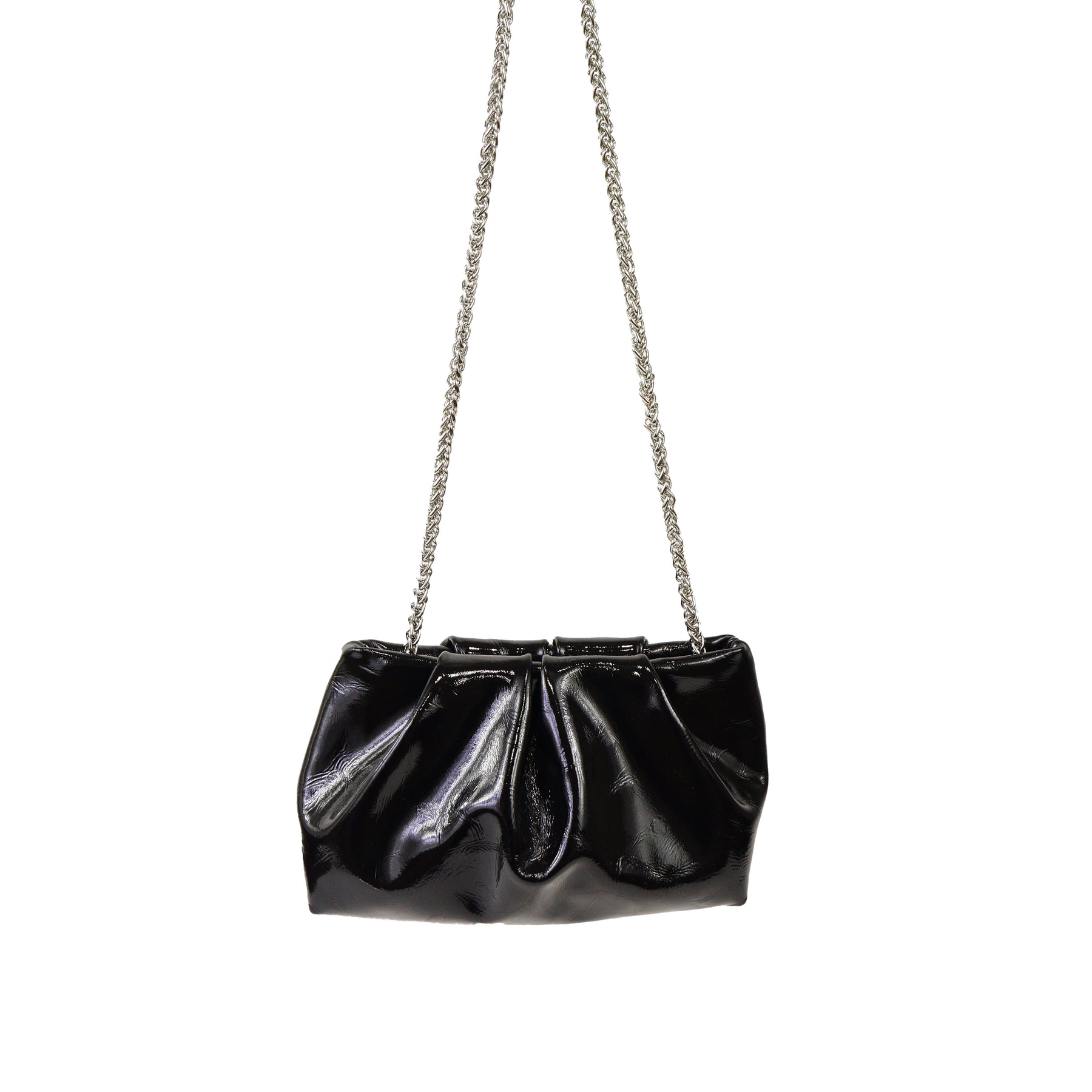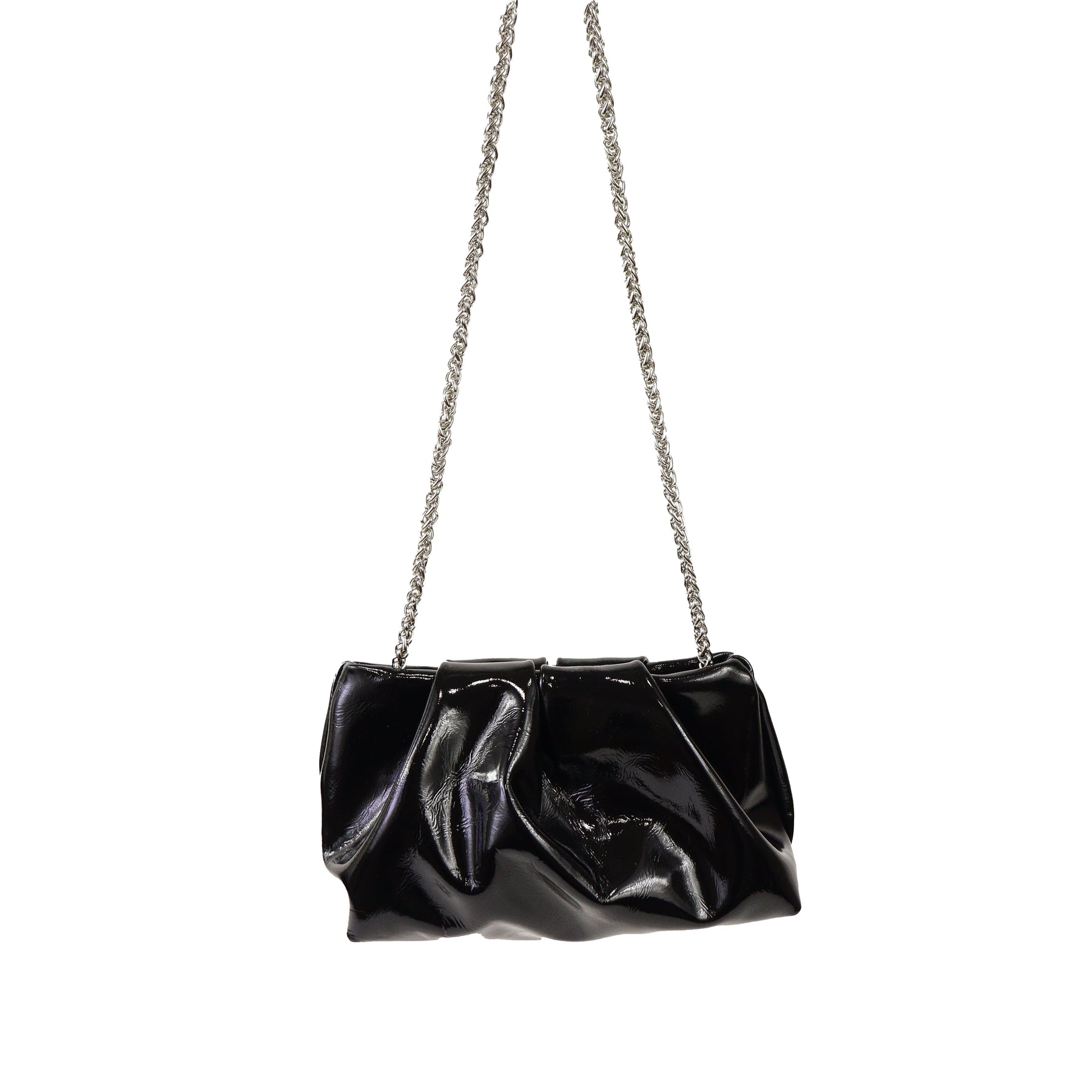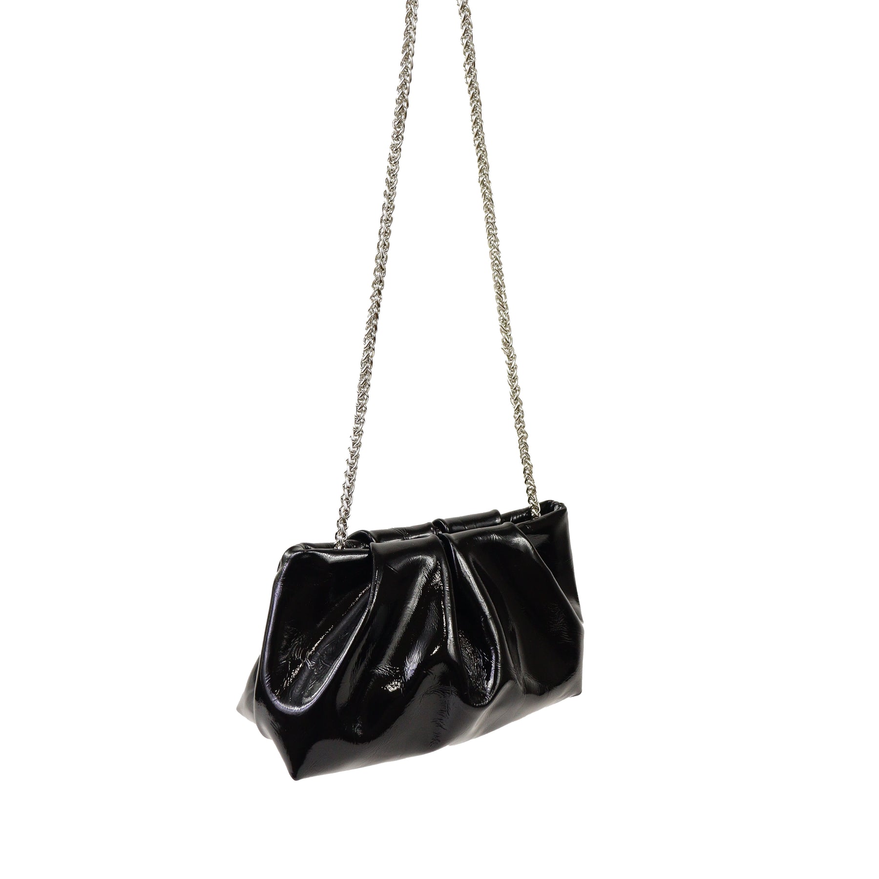 Pochette c/arriccio nera in vernice di SCARLETT con chiusura a clip e tracollina a catena color argento. Misure 20x14x8 cm