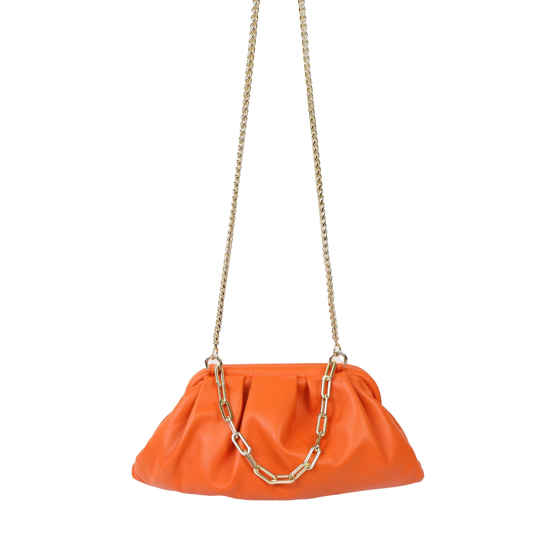 Borsetta con arriccio arancione in pelle di SCARLETT con manico a catena color oro e dotata di tracollina a catena color oro e chiusura a scatto. Misure 33x14x15 cm