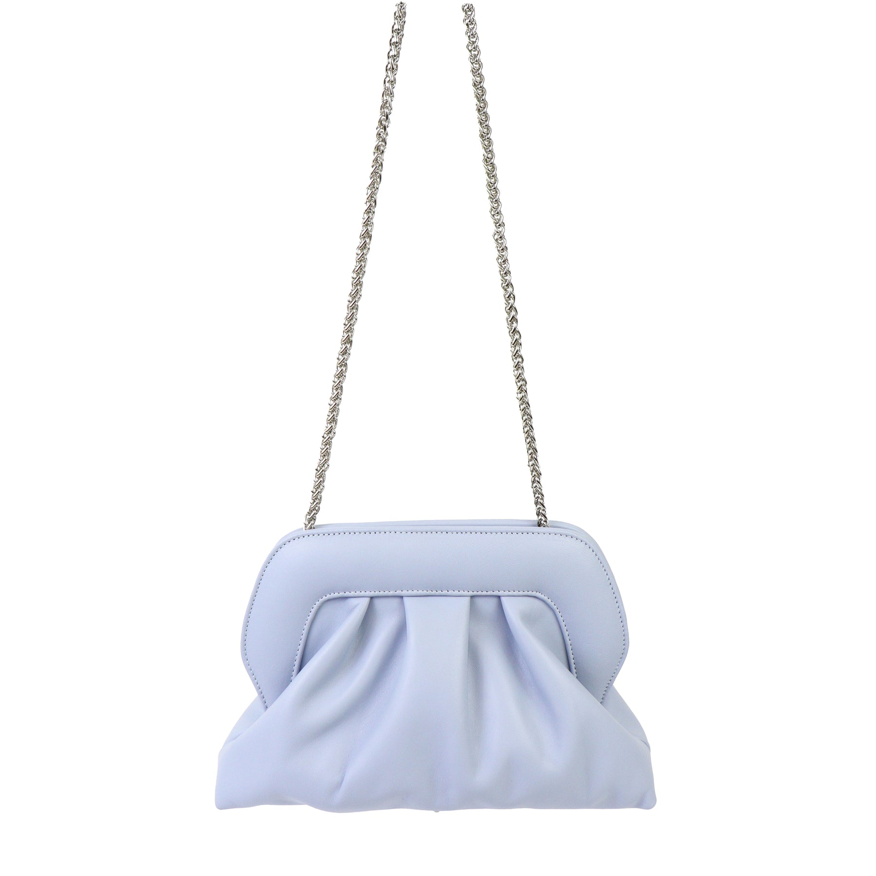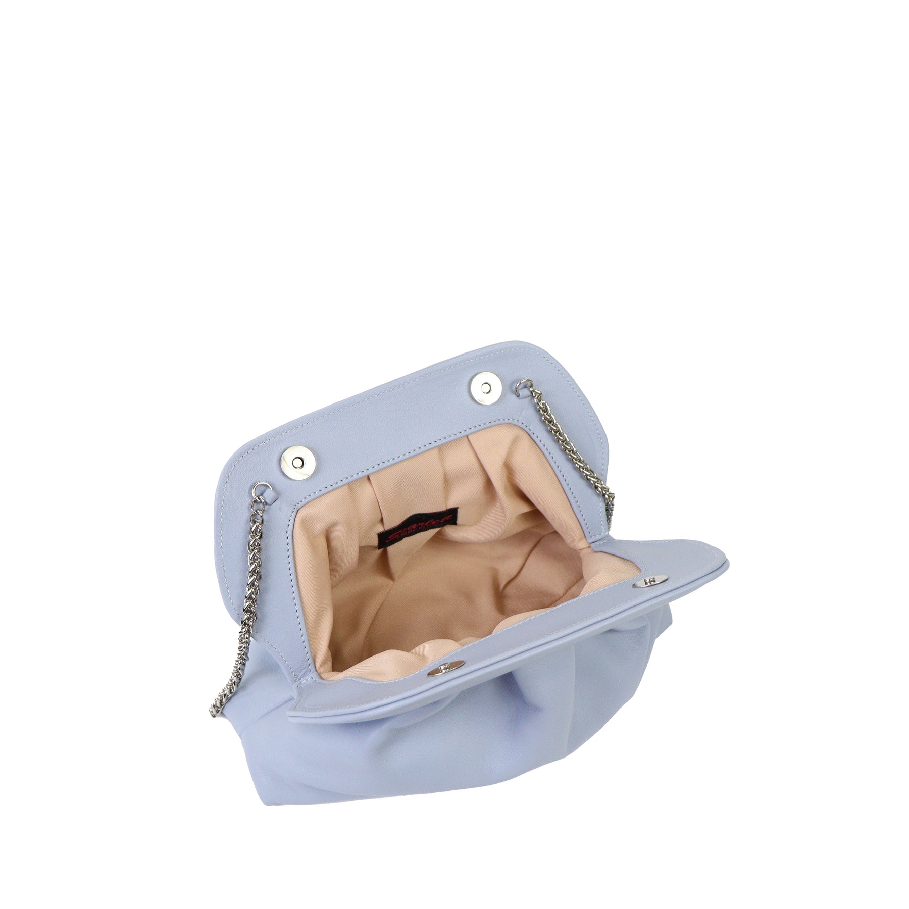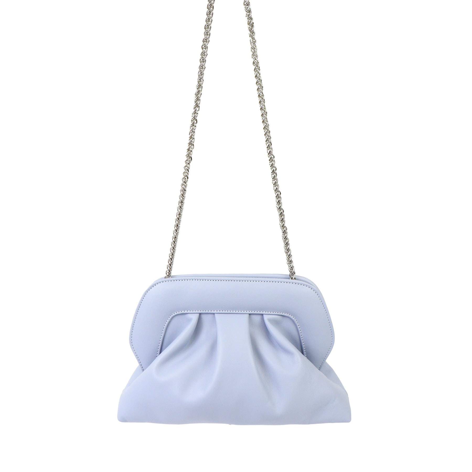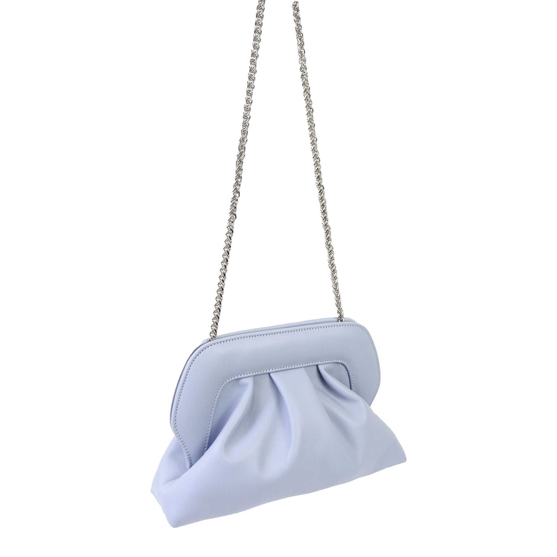 Borsetta con arriccio azzurra di SCARLETT con tracollina a catena argento oro e chiusura con clip. Misure 27x22x8 cm
