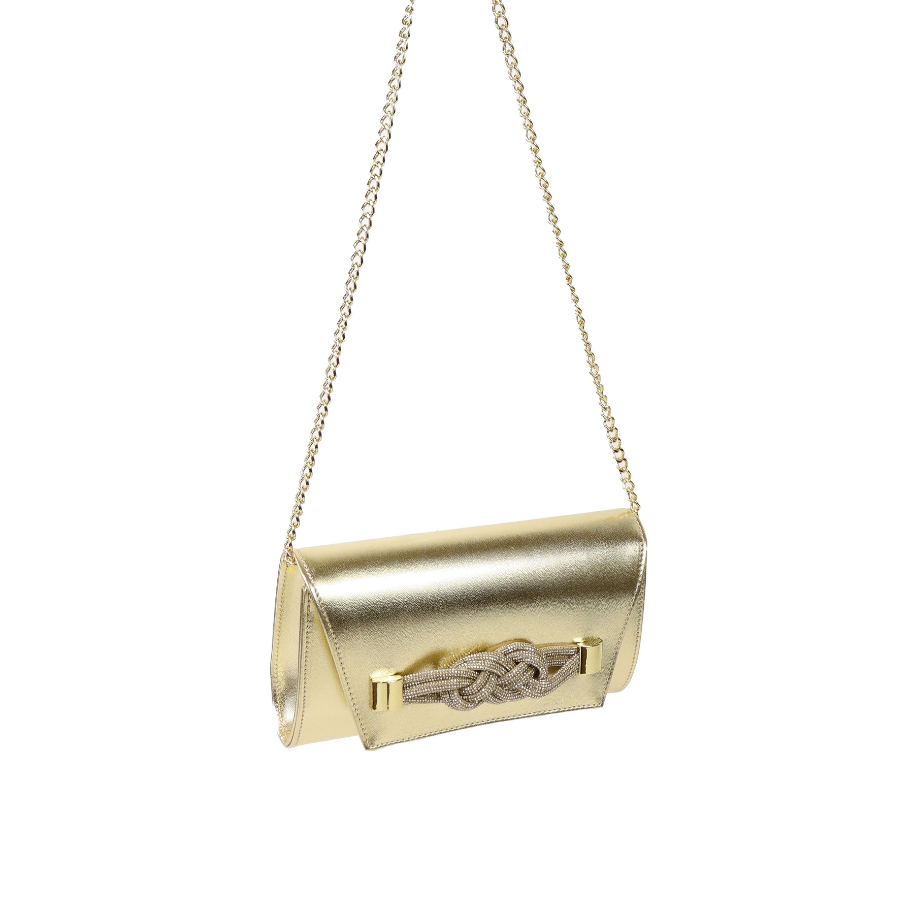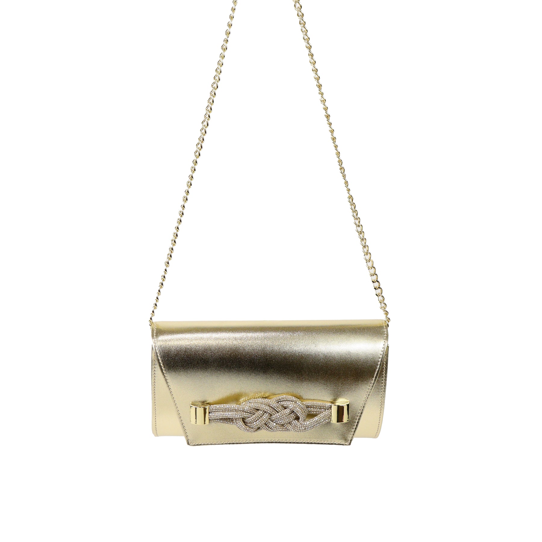 Pochette platino metallizzata di SCARLETT con patta arricchita da dettaglio nodo con strass con chiusura a clip. Tracollina a catena color oro. Misure 21x12x6 cm
