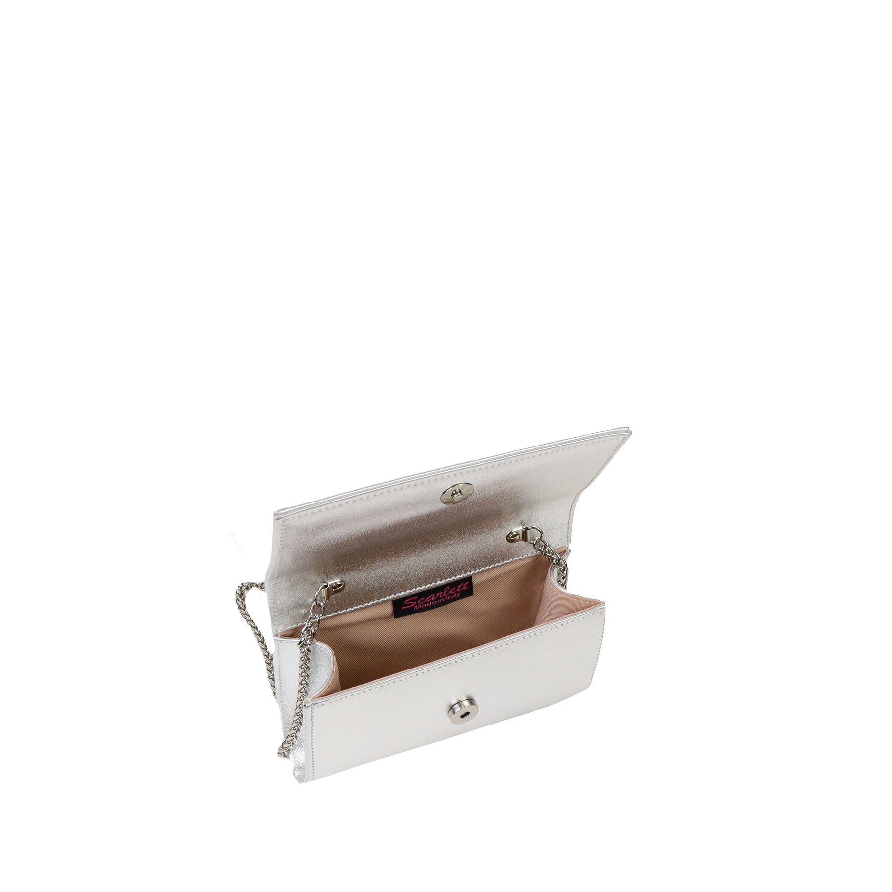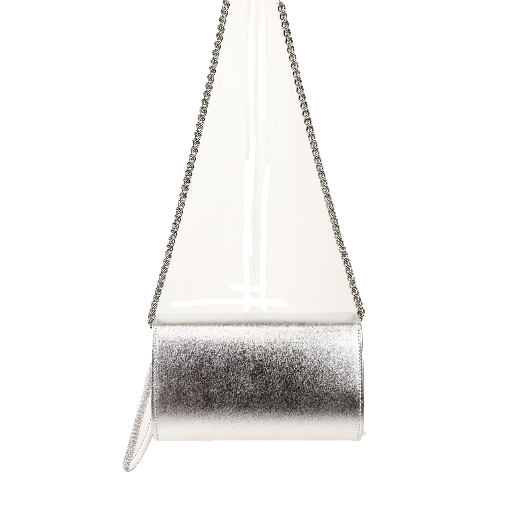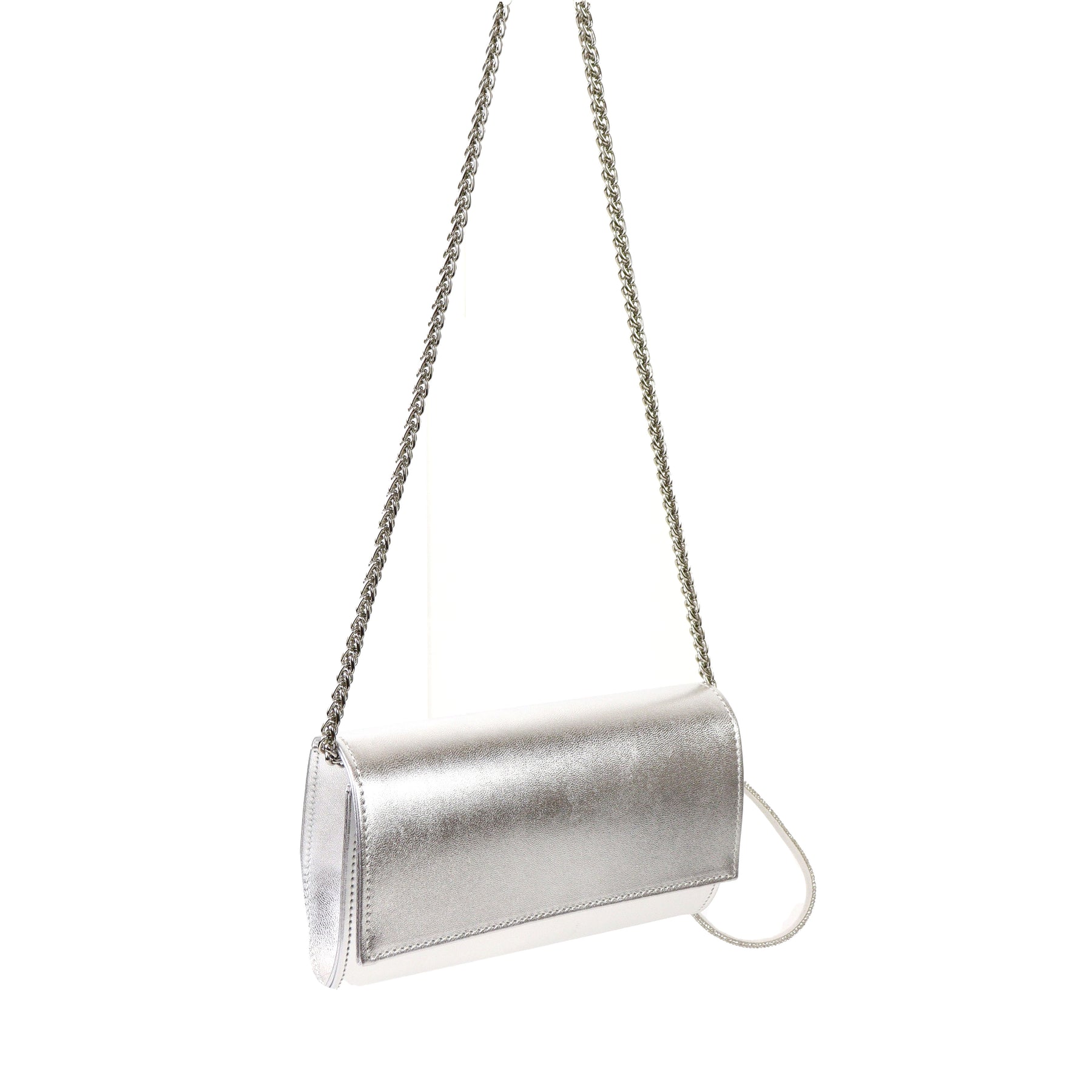 Pochette argento metalizzata di SCARLETT con patta, tracollina a catena color argento, manico con gancio removibile con strass color argento e chiusura con clip. Misure 19x11x5 cm
