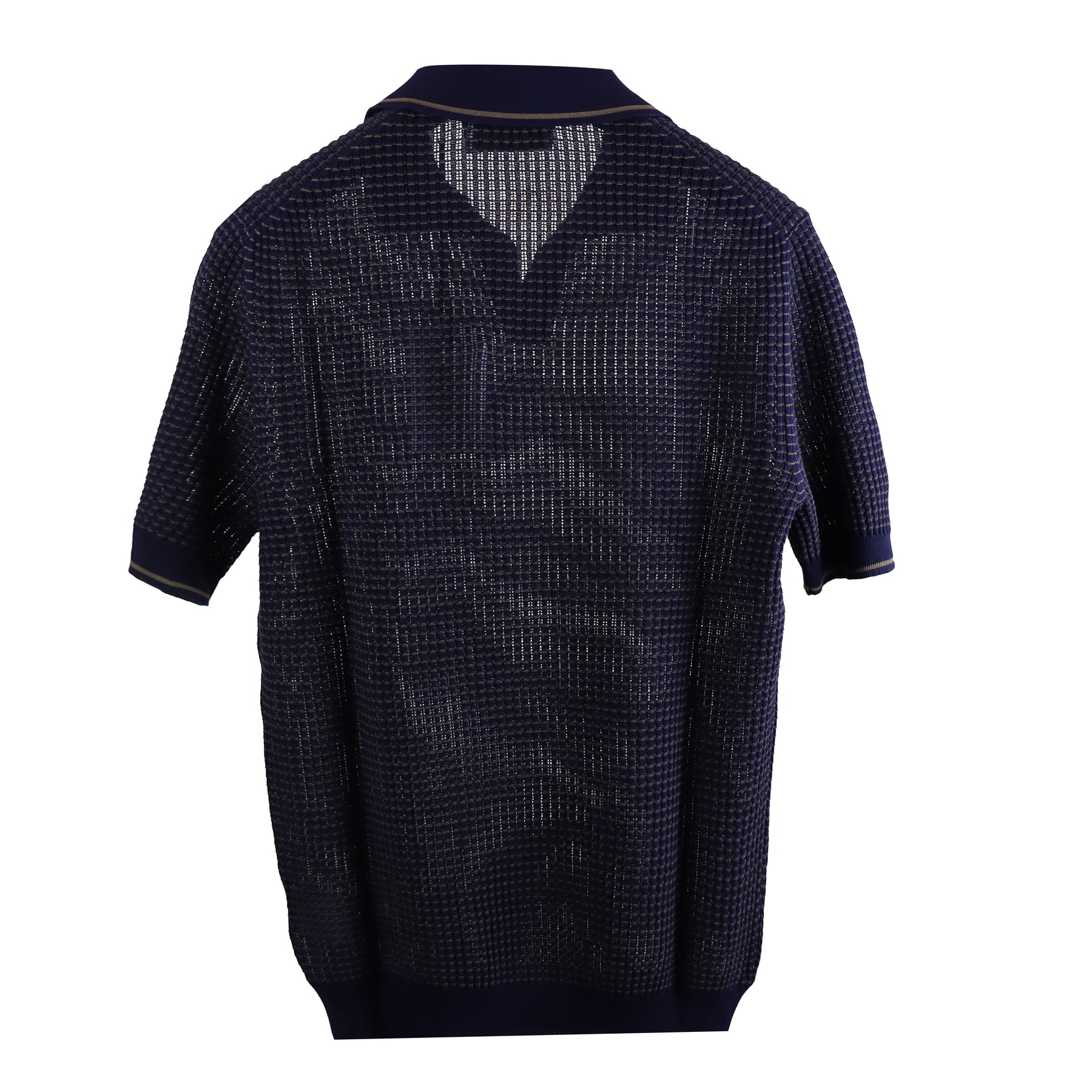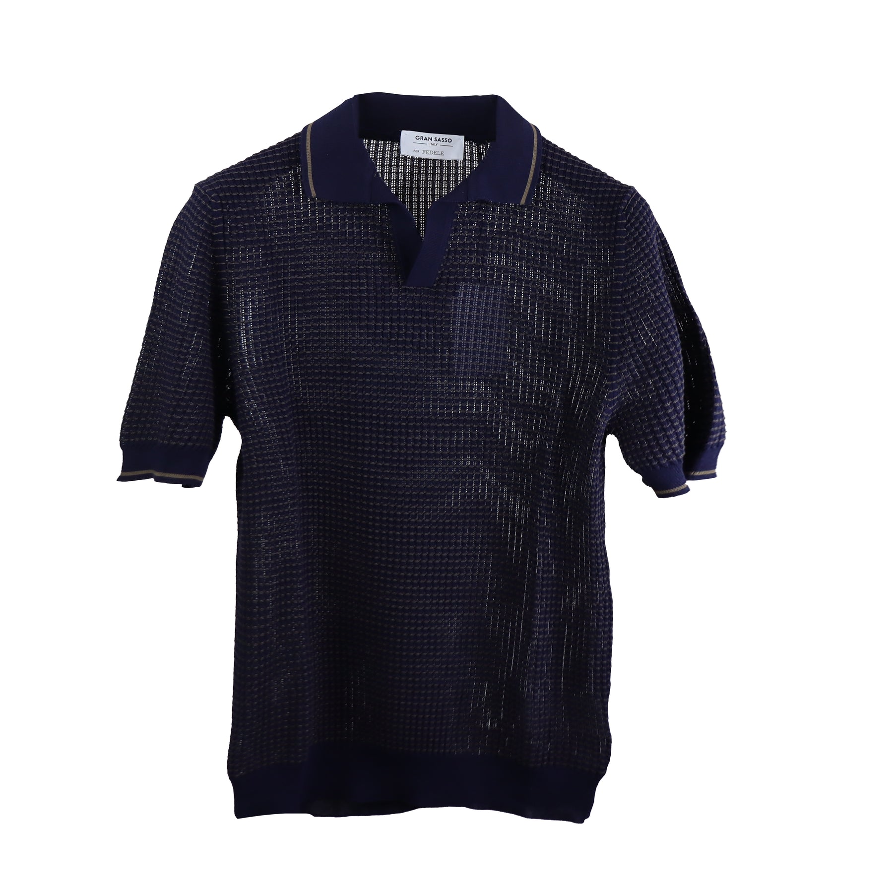 Tennis blu di GRAN SASSO X FEDELE in cotone con lavorazione leggermente microforata, leggero scollo a V, collo camicia, lavorazione a costine su maniche e fondo. Profilo in contrasto su maniche, collo e scollo.