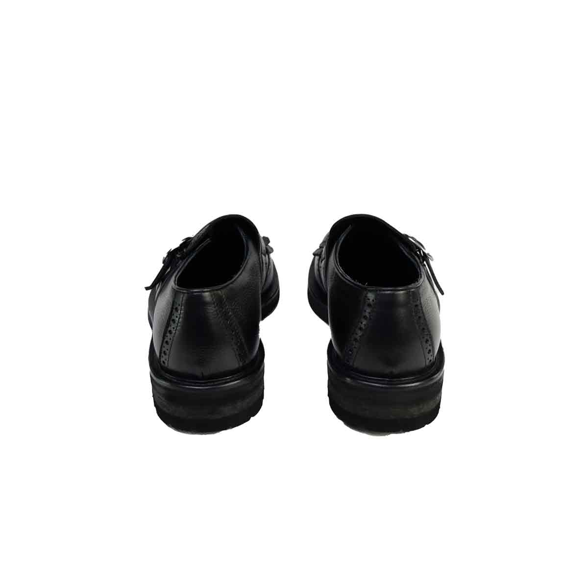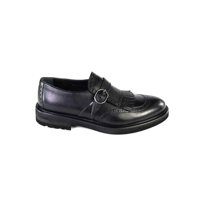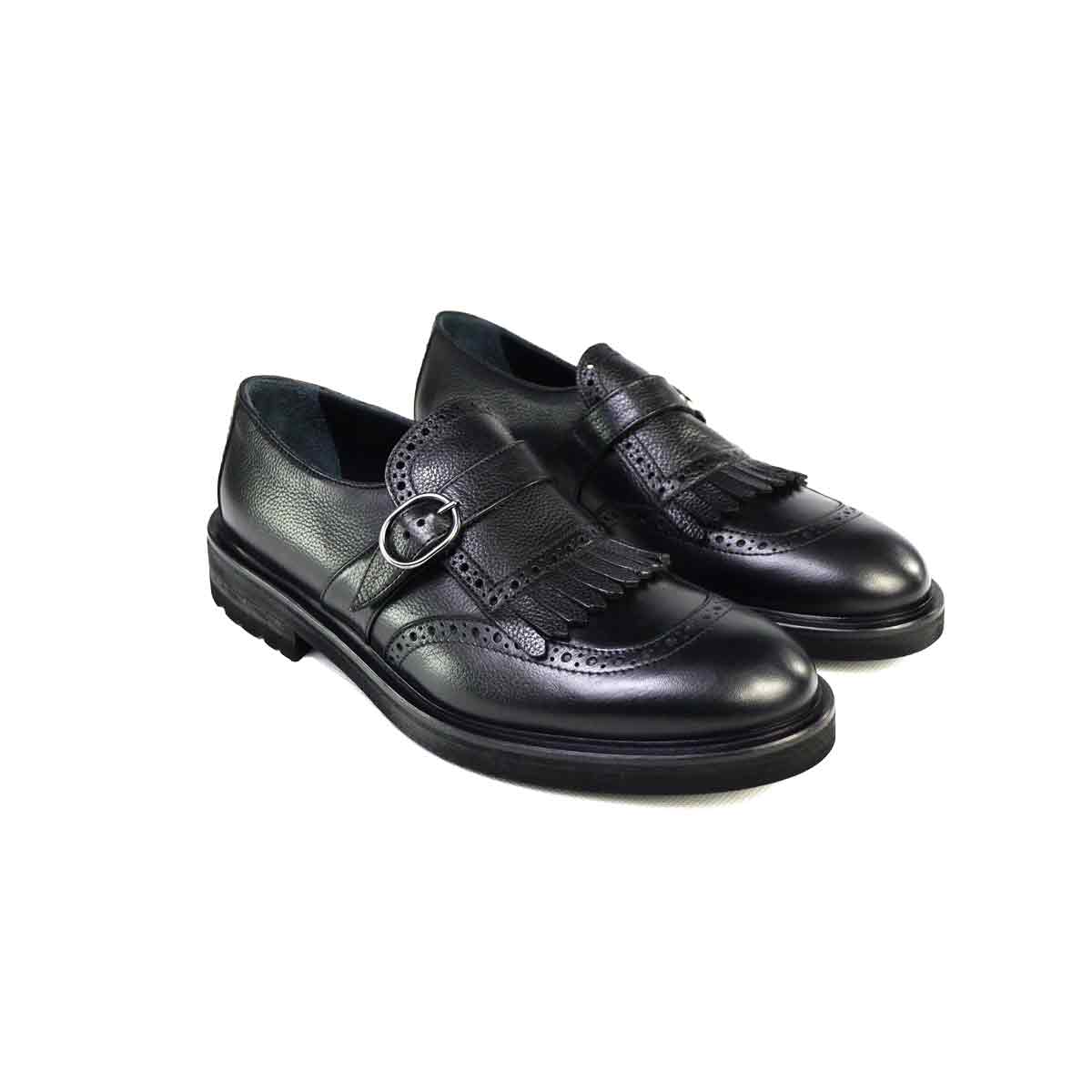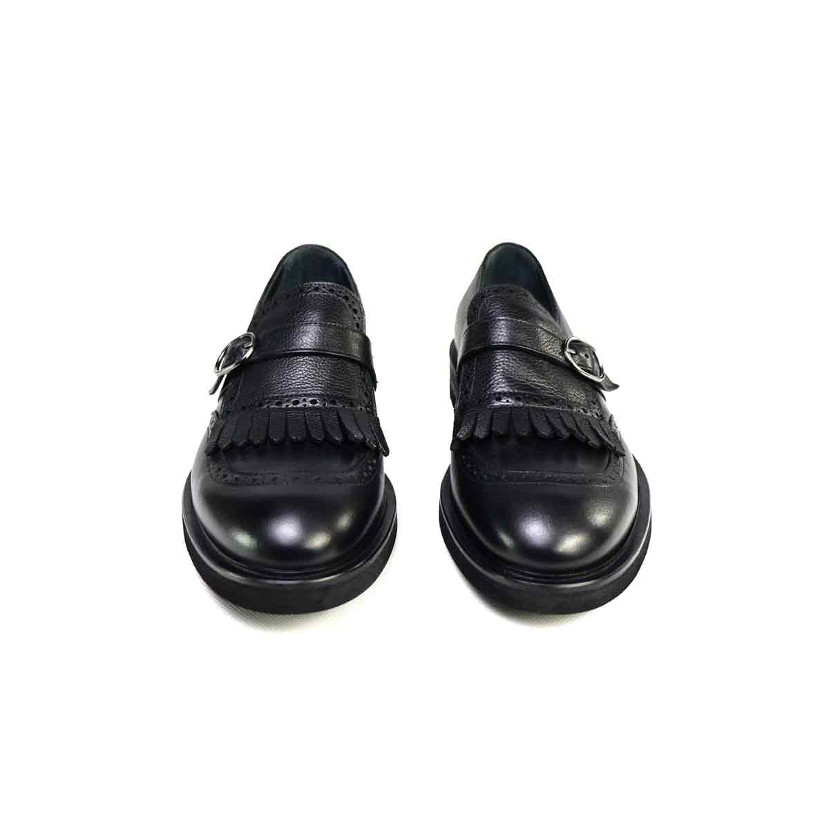 Scarpa con fibbia e frangia di Jerold Wilton realizzata in pelle bottolata nera e con fondo in gomma