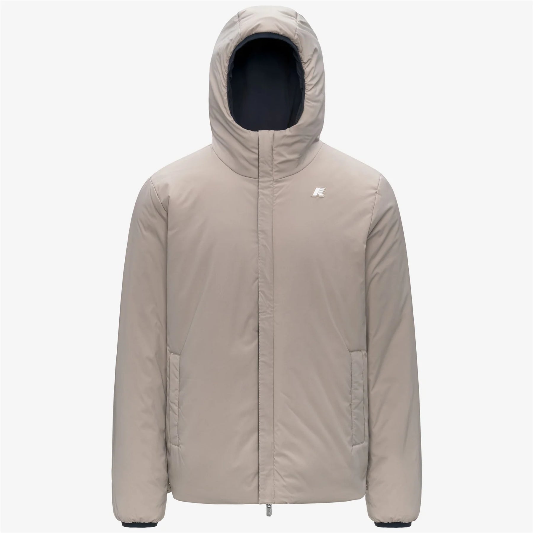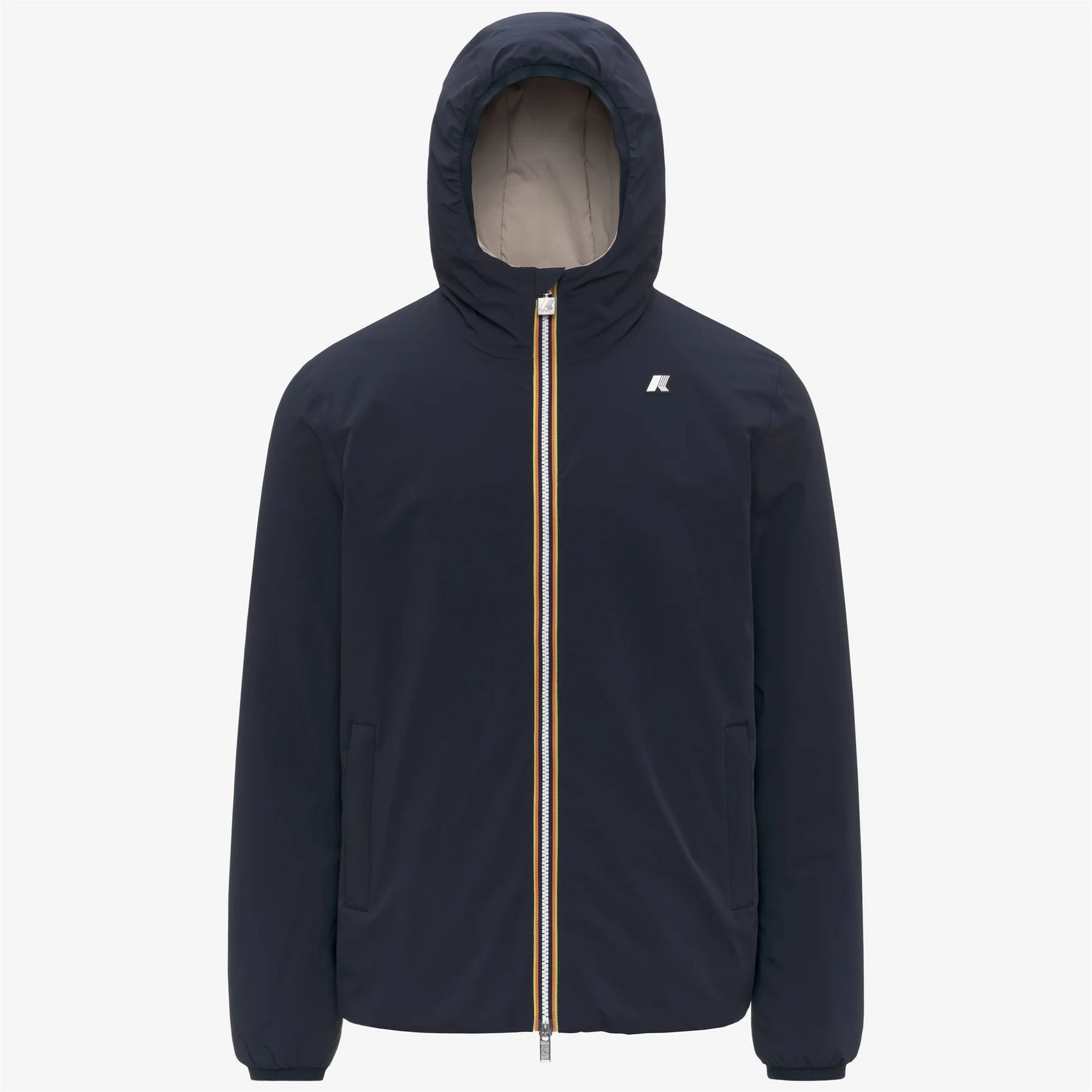 Piumino JACK ST WARM blu reversibile di K-WAY in nylon con interno in beige, iconica zip e logo in bianco. Cappuccio e tasche a filetto.