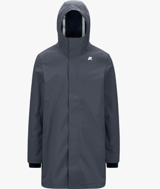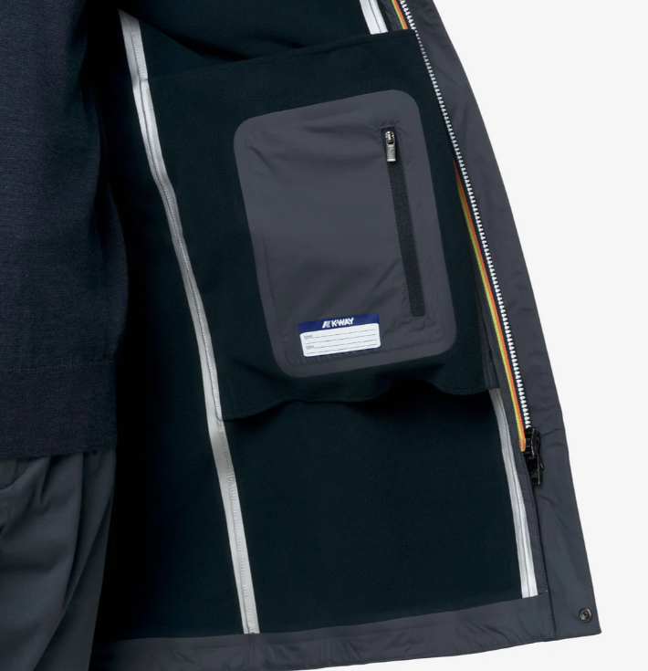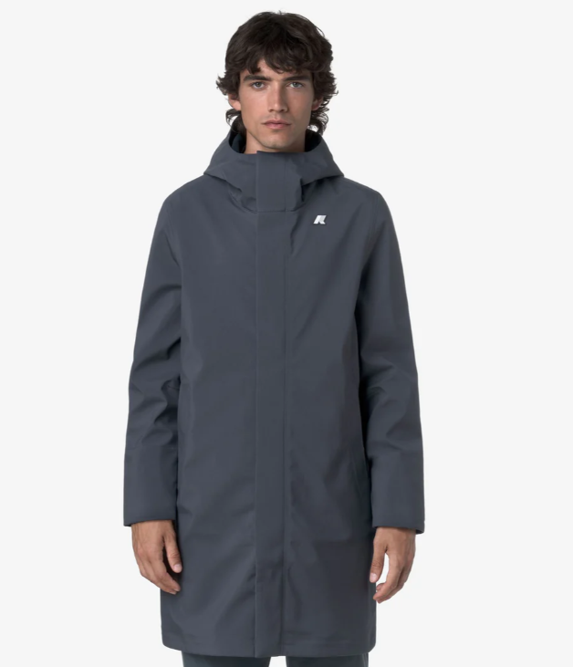 Giacca THOMAS BONDED blu chiaro di K-WAY in tessuto tecnico con cappuccio, chiusura con zip nascosta, interno in tessuto termico blu. Logo bianco.