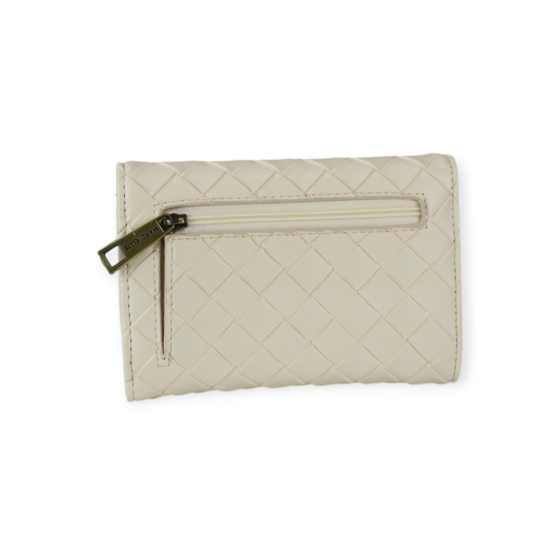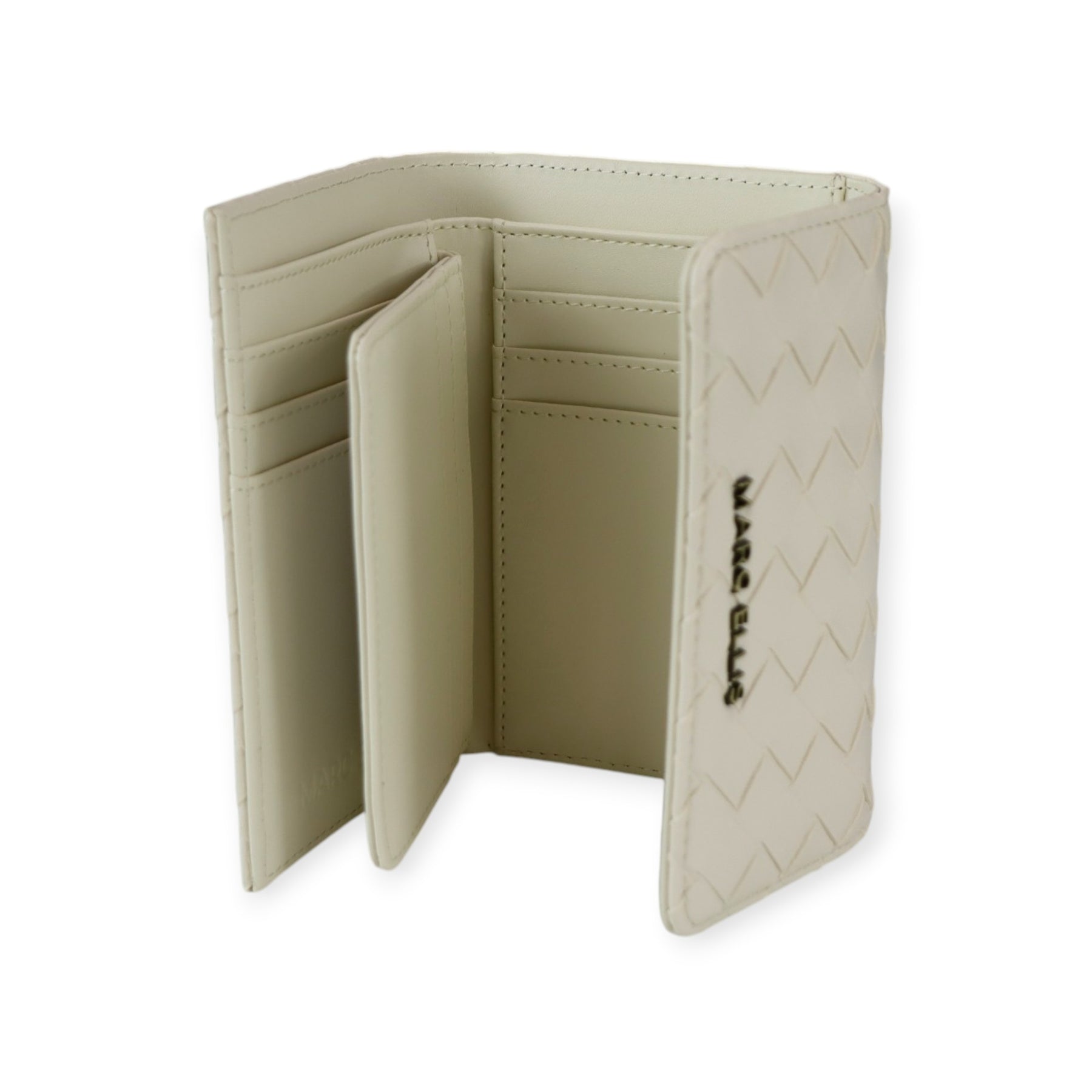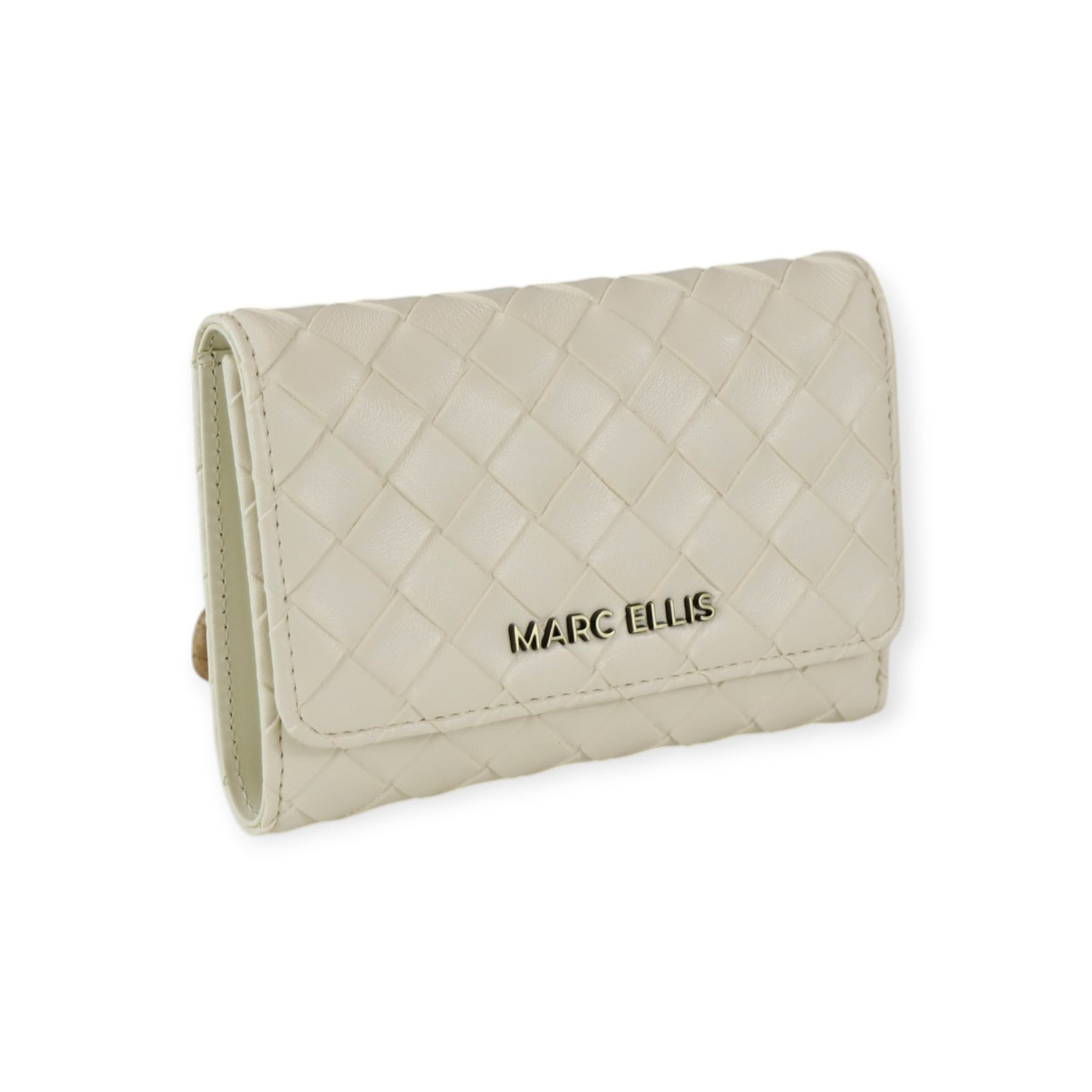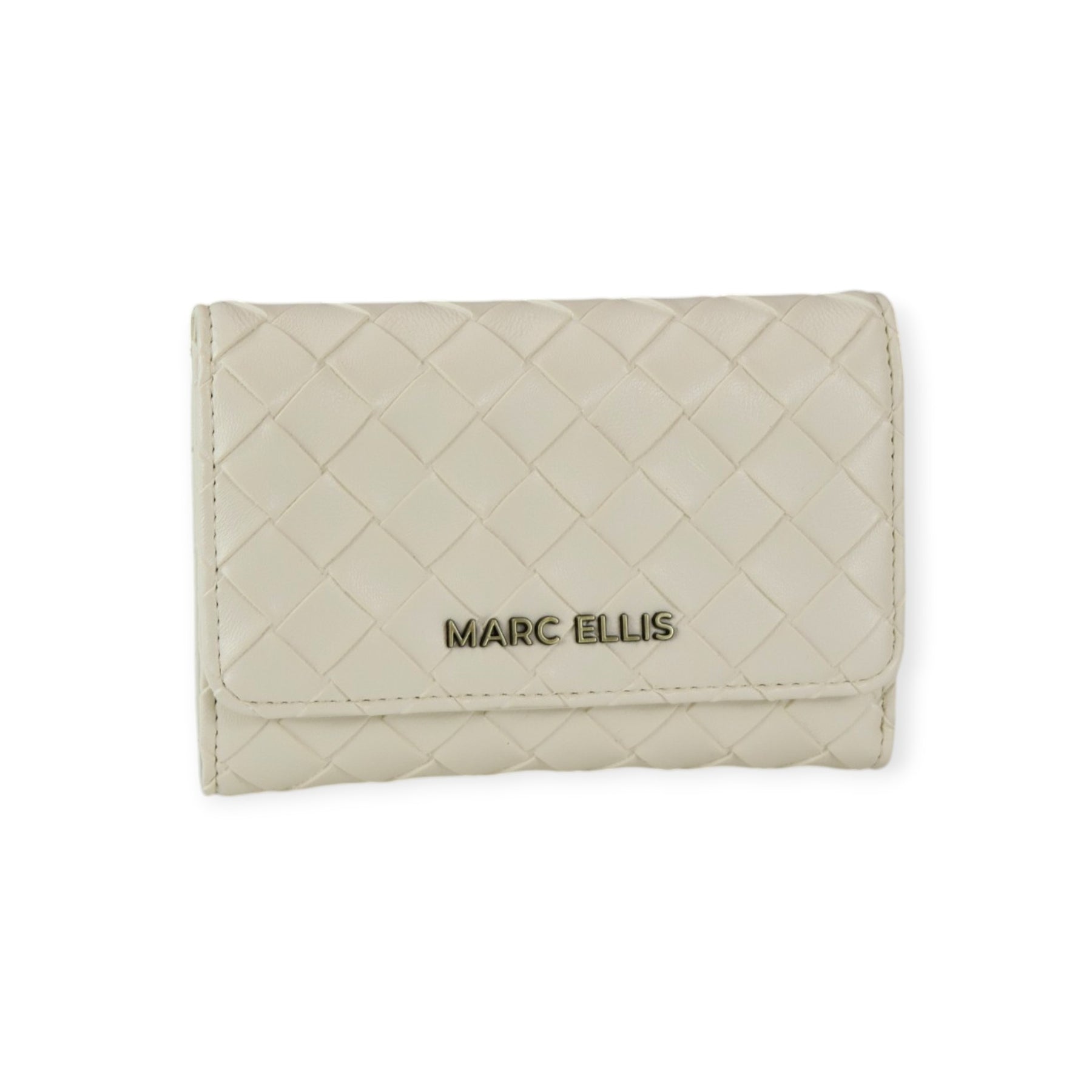 Portafogli AVA latte di MARC ELLIS in ecopelle con effetto intrecciato, chiusura con patta, logo in metallo, scomparto per carte e scomparto per monete posteriore.. Misure 15x11x3 cm.