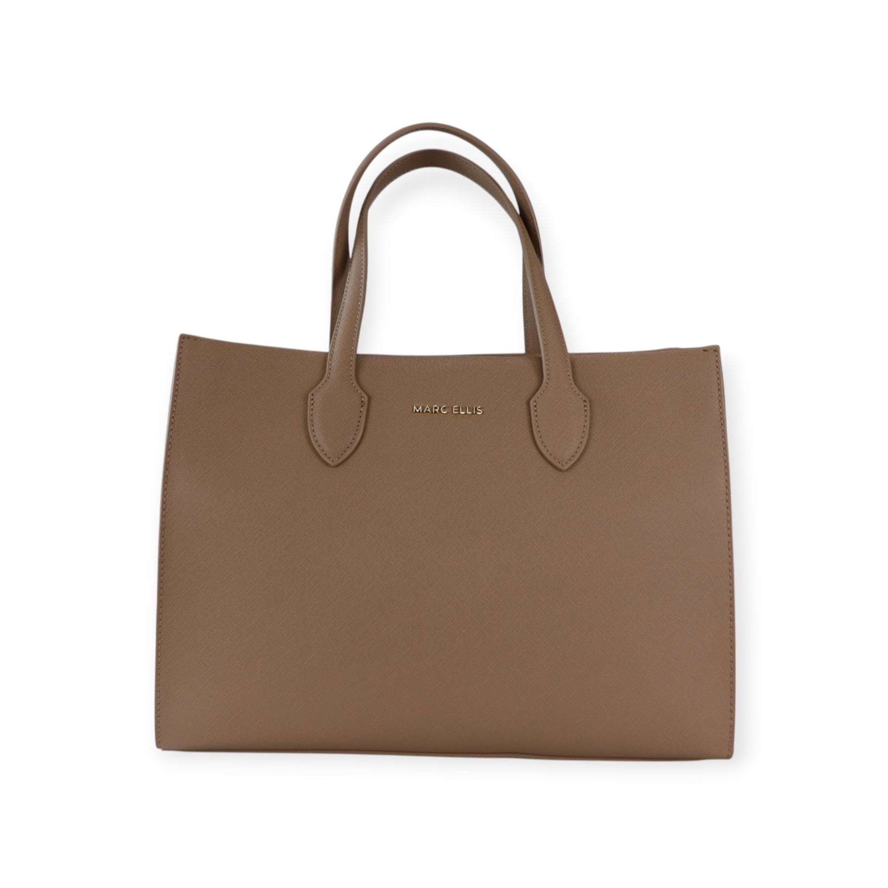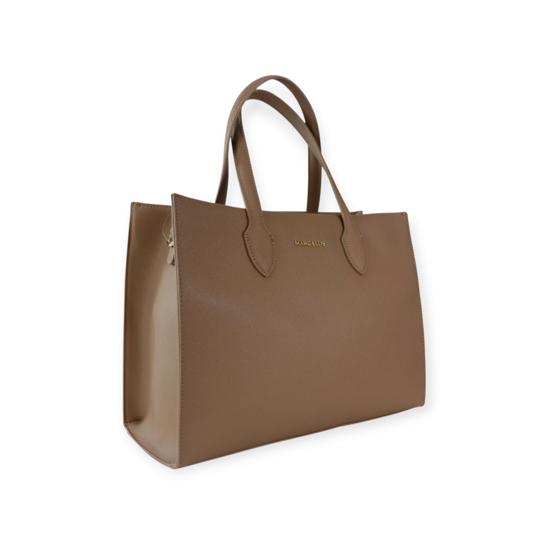 Borsa a mano CEYLAN cammello di MARC ELLIS in ecopelle con doppio manico, logo in metallo, chiusura con zip. Misure 37x28x14 cm.