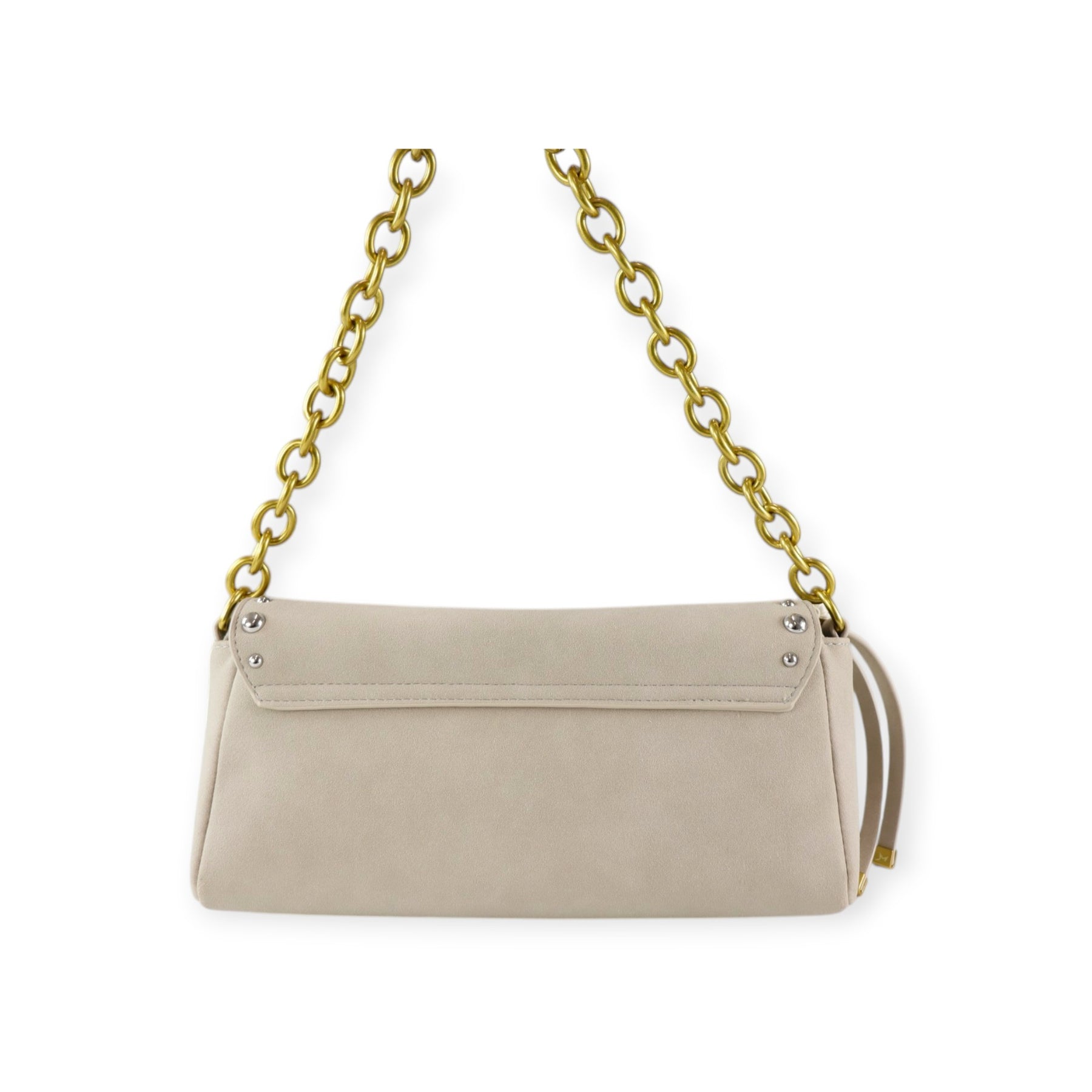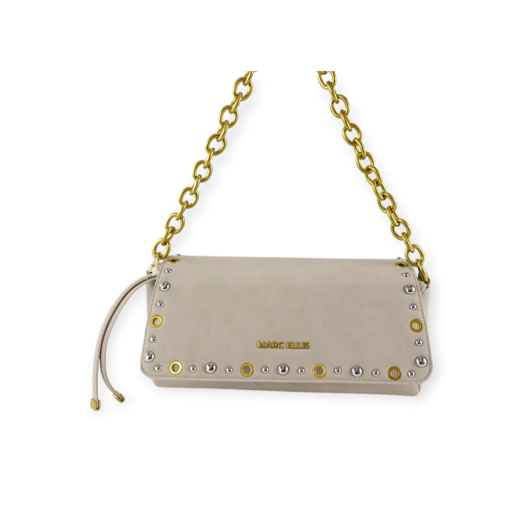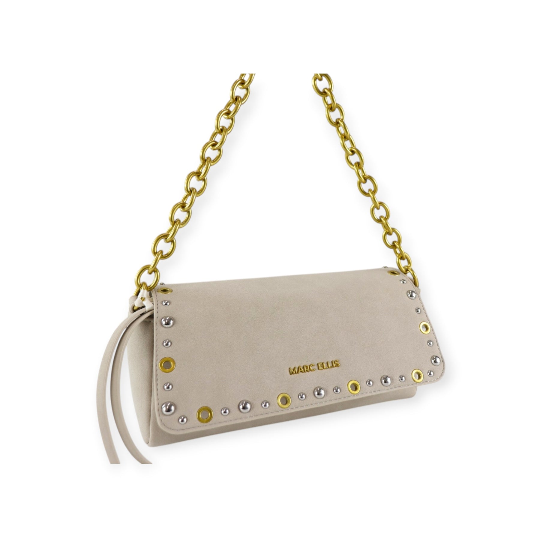 Baguette DAISI beige di MARC ELLIS in camoscio ecologico con chiusura con patta, borchie multicolore, tracolla in metallo, logo in metallo. Misure 27x11x9 cm.