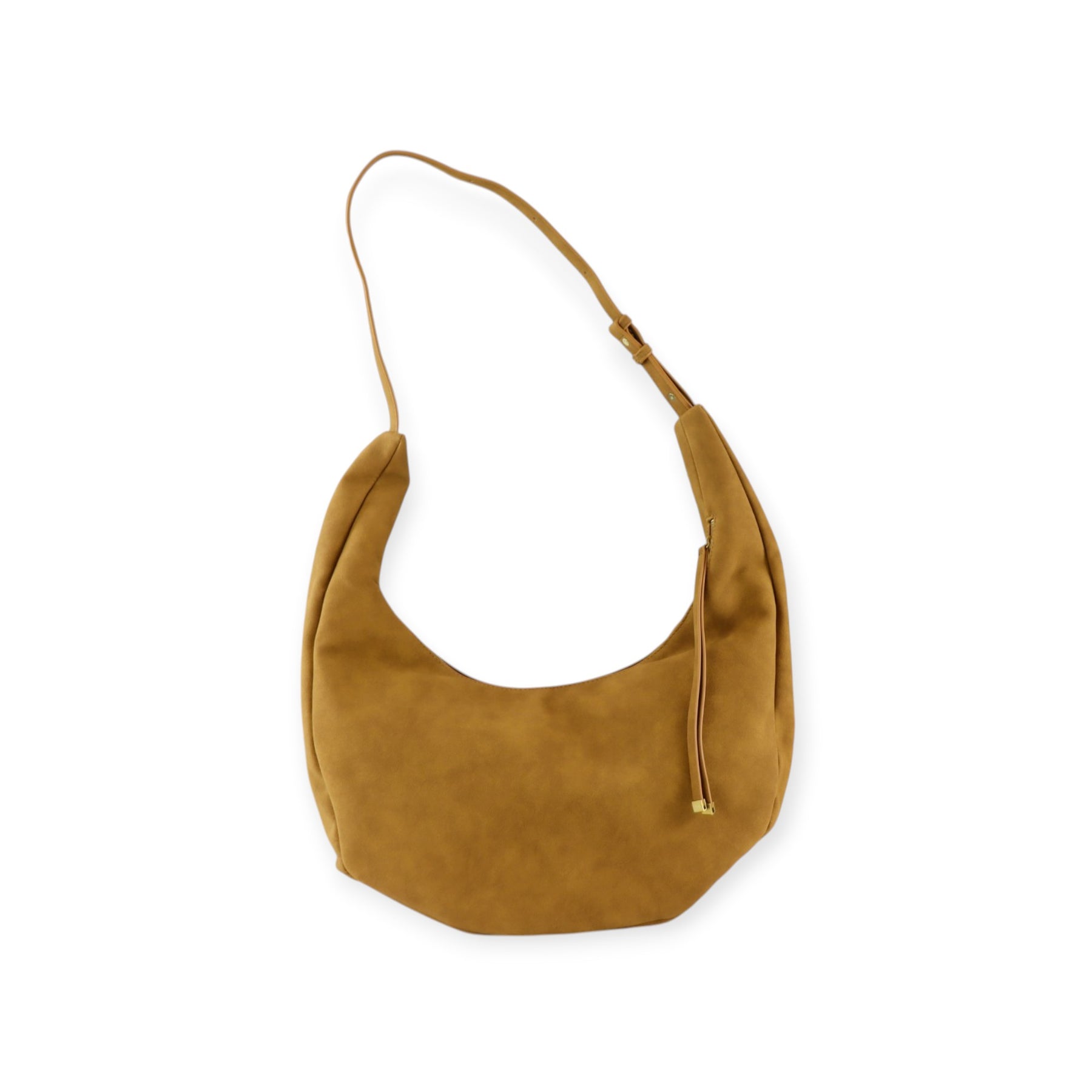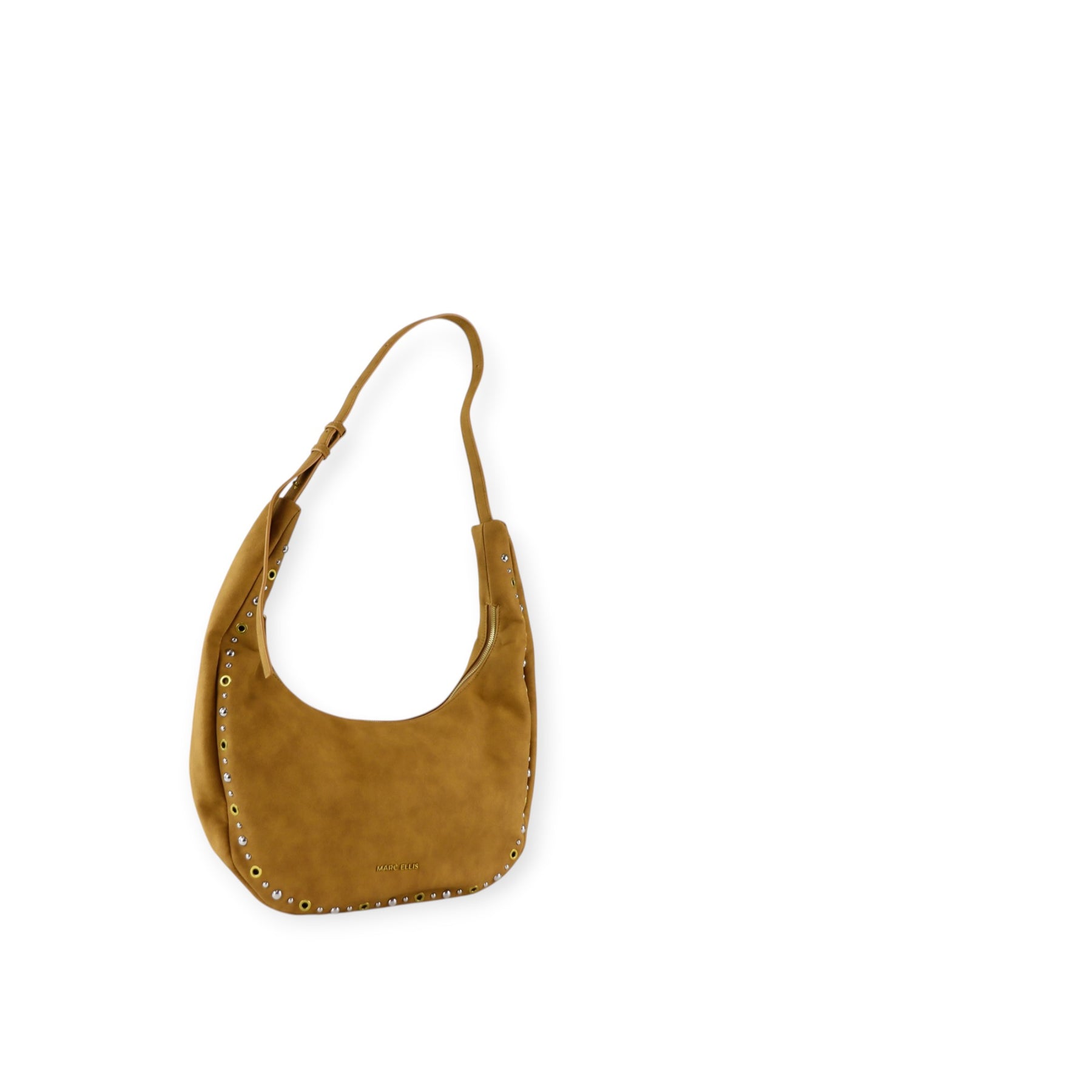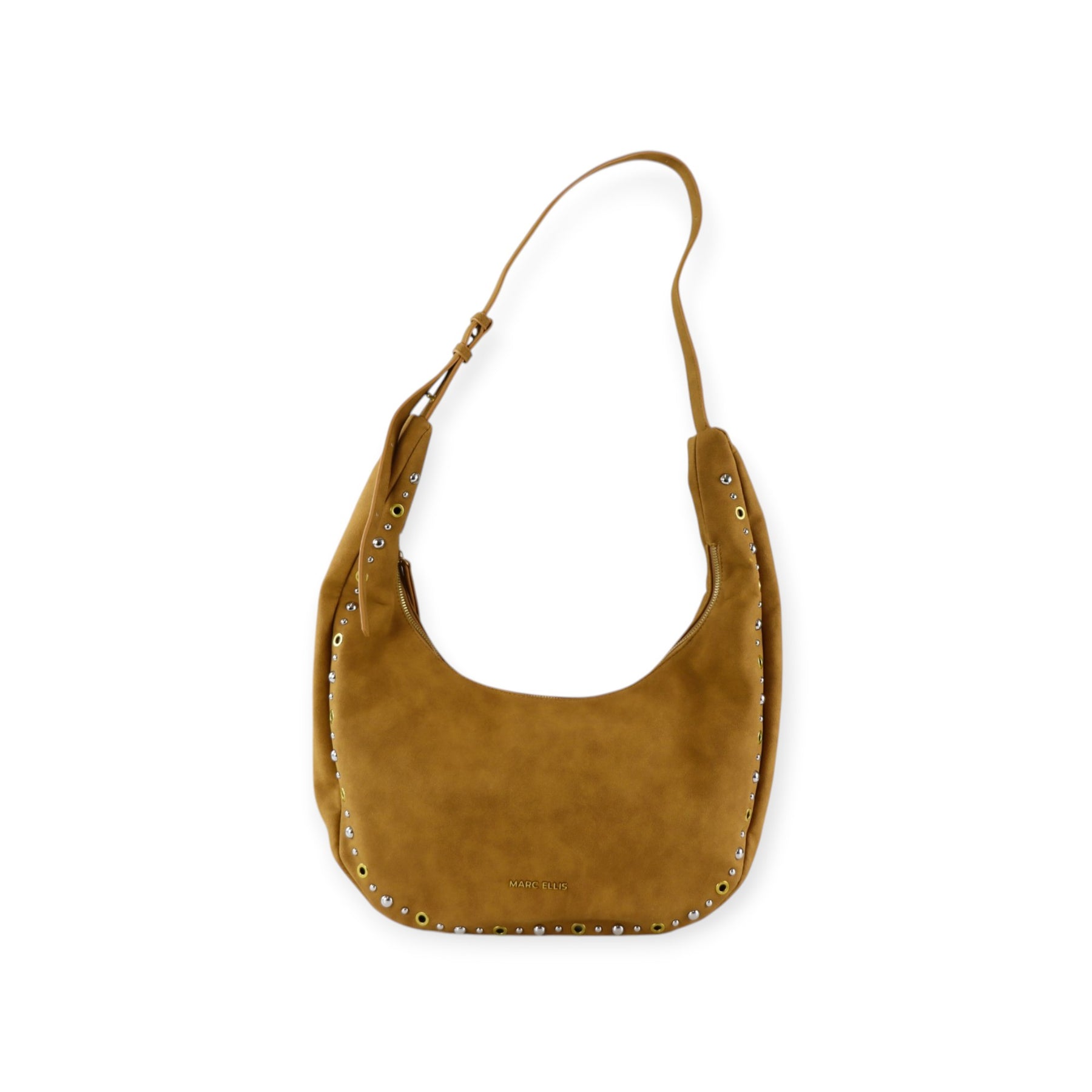 Borsa mezzaluna HARRIE cuoio di MARC ELLIS in camoscio ecologico con chiusura con zip, borchie multicolore, tracolla regolabile, logo in metallo. Misure 40x23x12 cm.