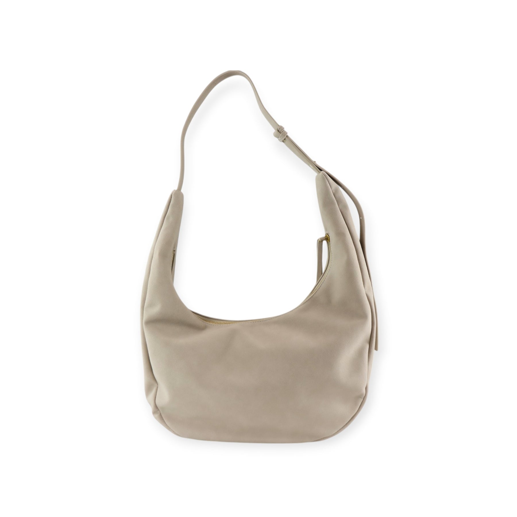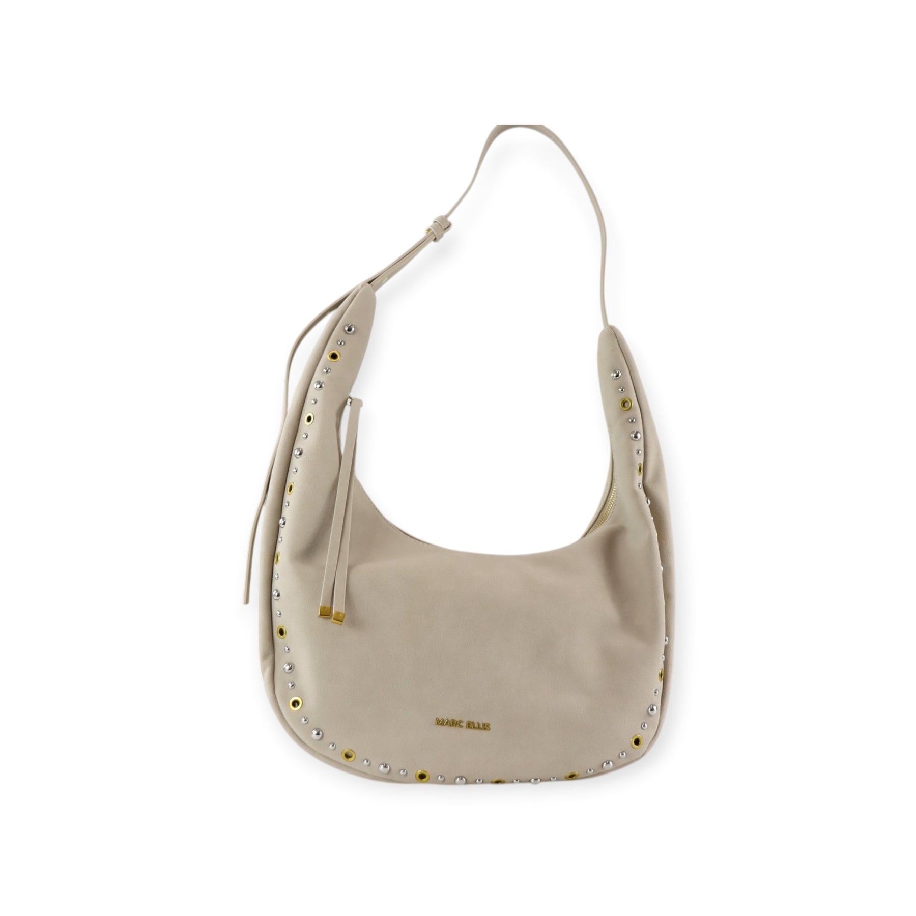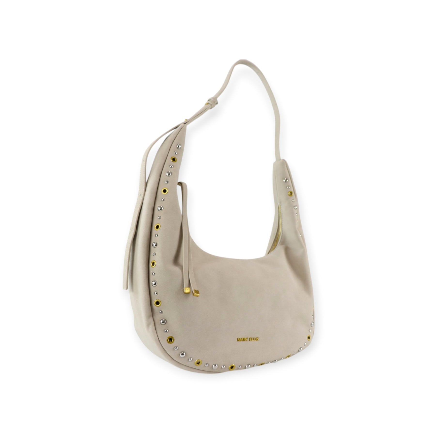 Borsa mezzaluna HARRIE beige di MARC ELLIS in camoscio ecologico con chiusura con zip, borchie multicolore, tracolla regolabile, logo in metallo. Misure 40x23x12 cm.