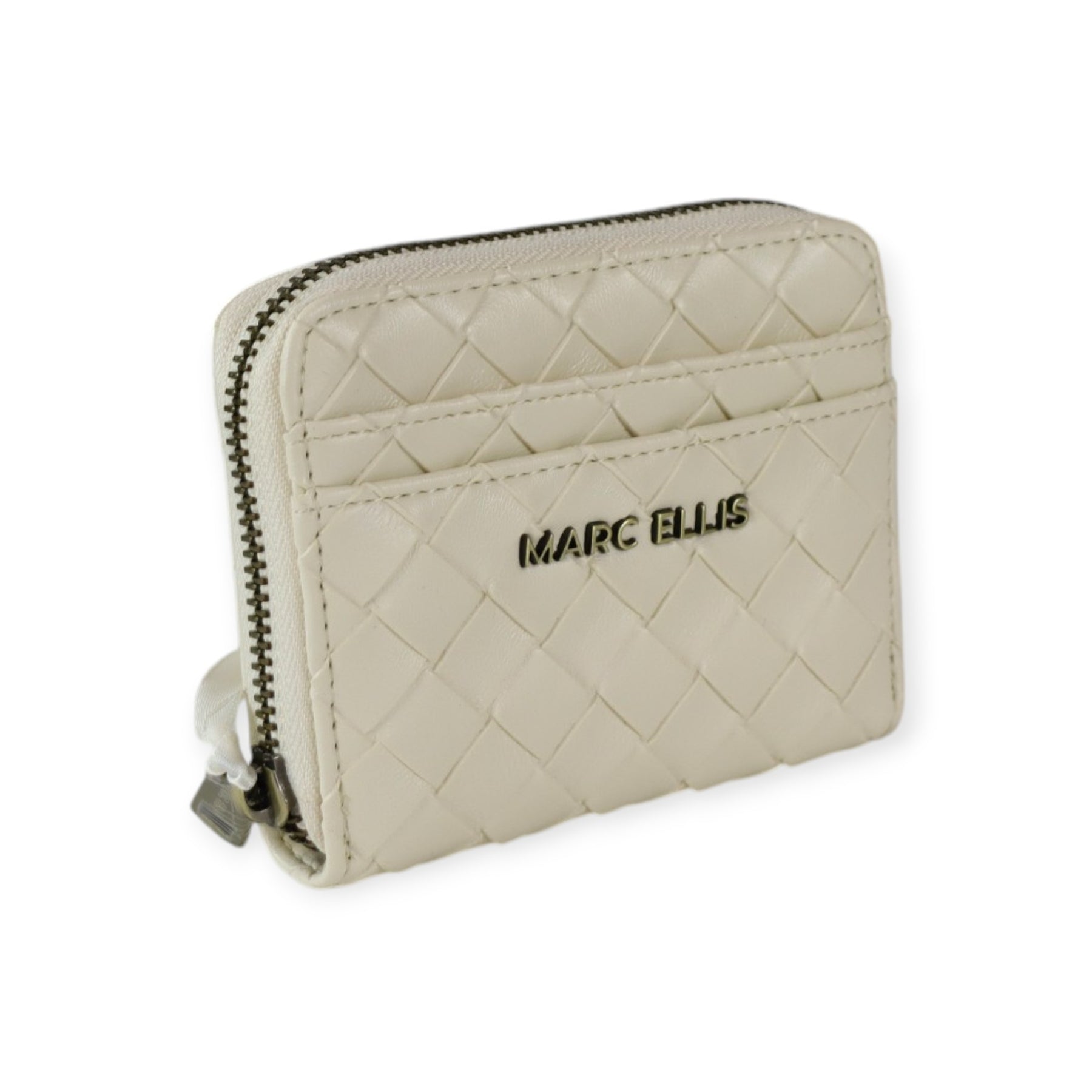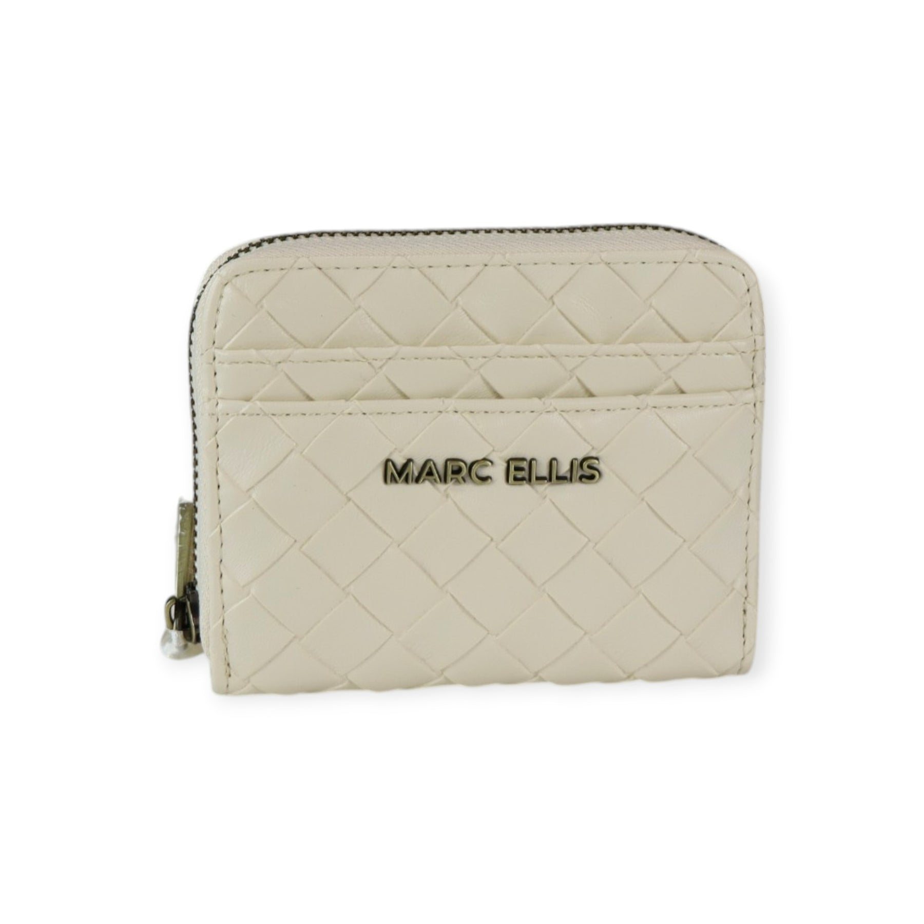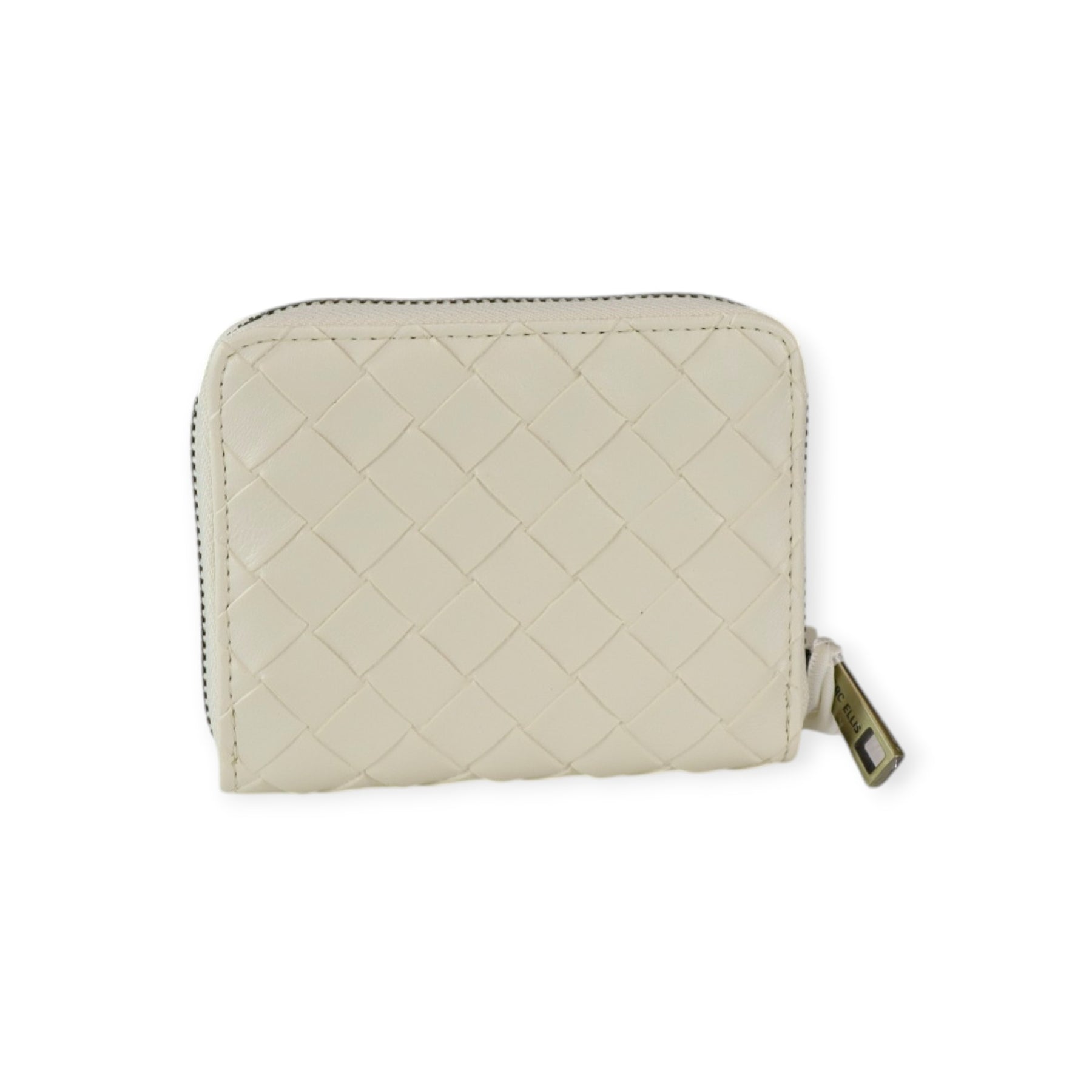 Portafogli KAROL latte di MARC ELLIS in ecopelle con effetto intrecciato, chiusura con zip, logo in metallo, scomparto esterno per carte. Misure 12x10x3 cm.