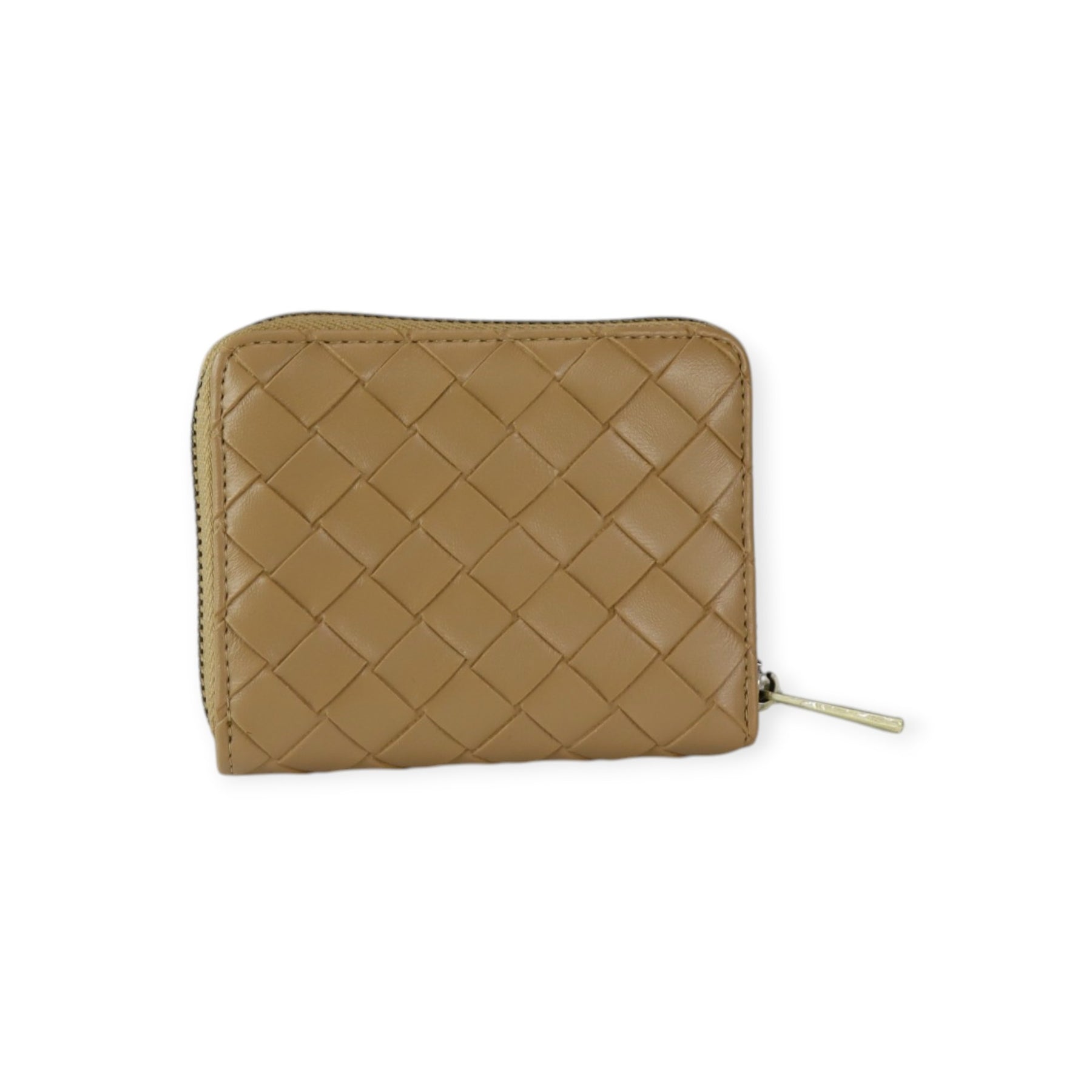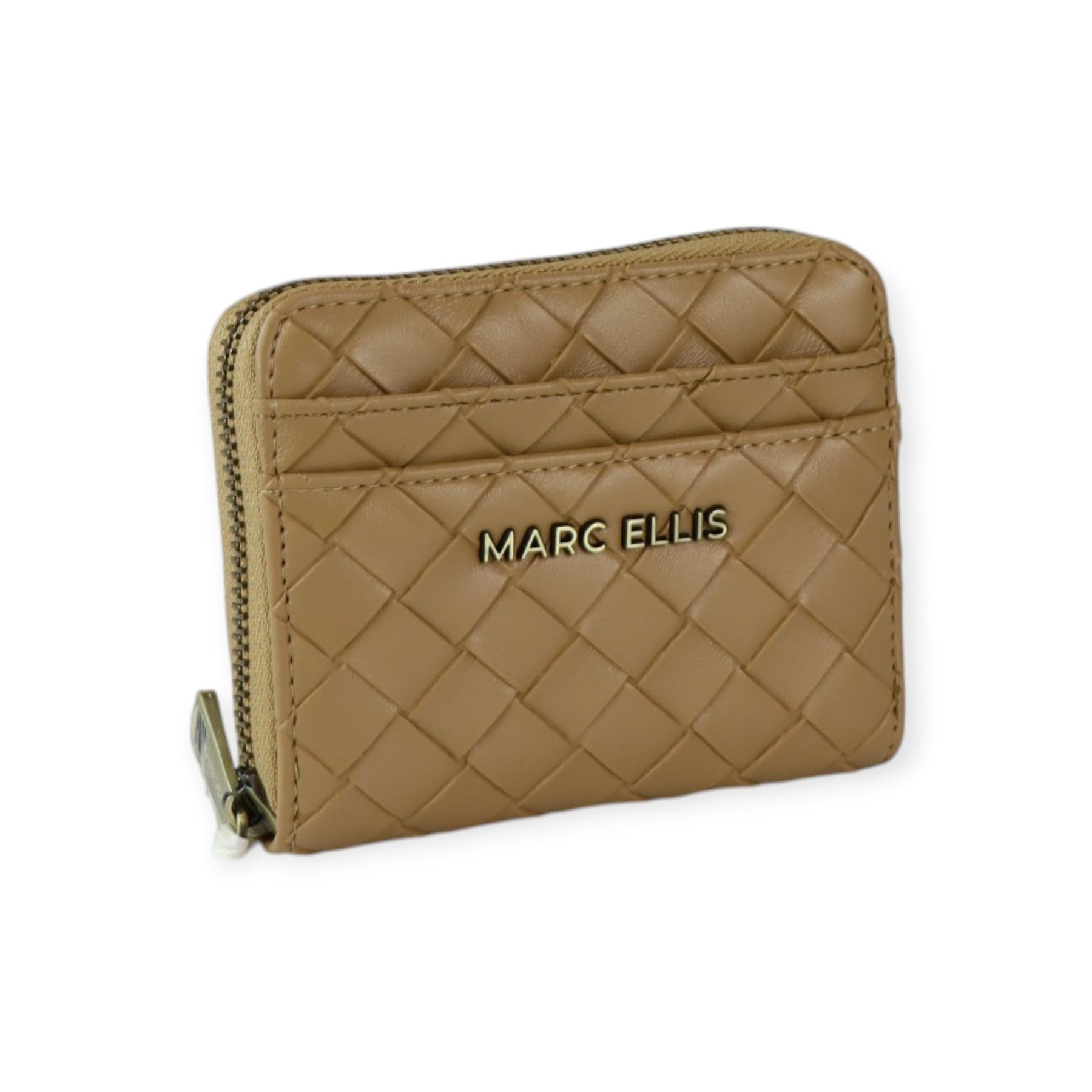 Portafogli KAROL cammello di MARC ELLIS in ecopelle con effetto intrecciato, chiusura con zip, logo in metallo, scomparto esterno per carte. Misure 12x10x3 cm.