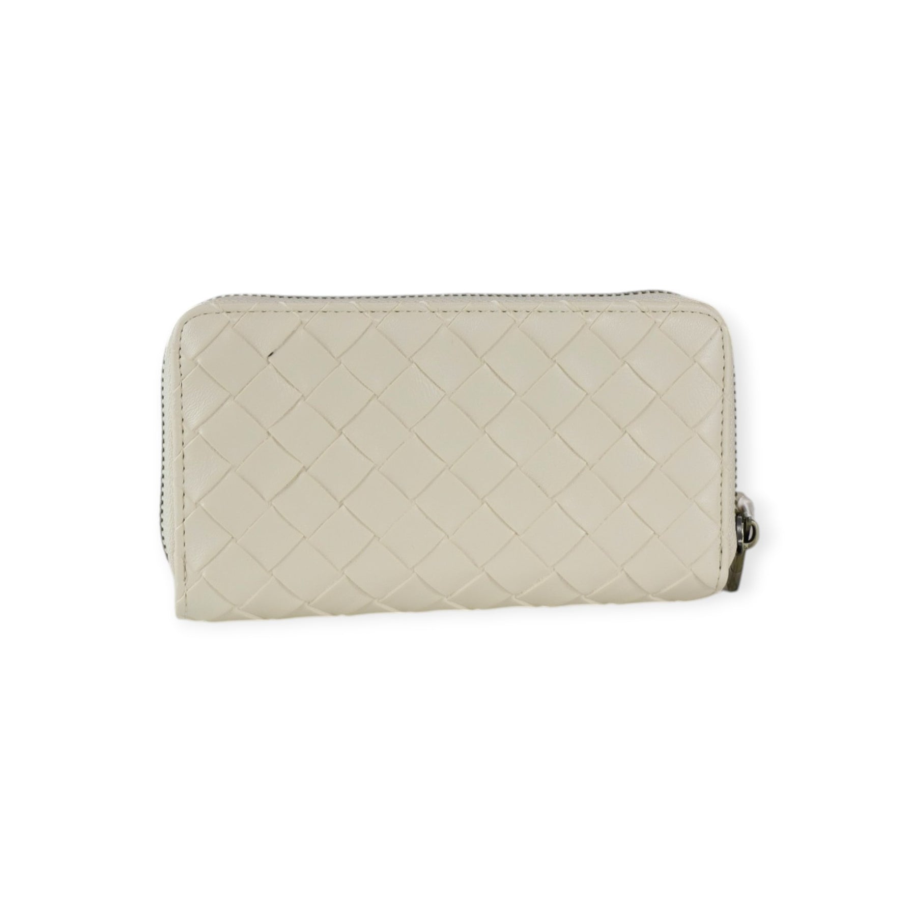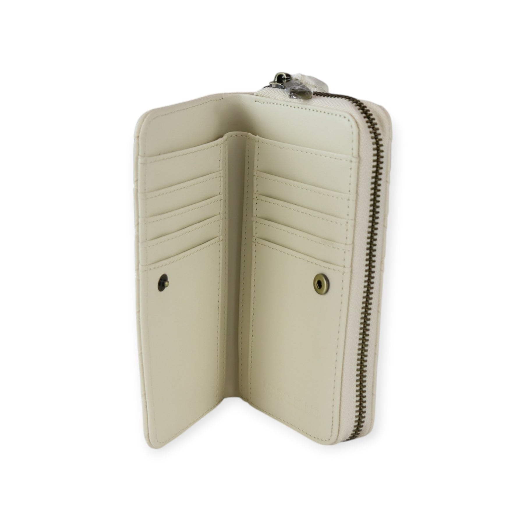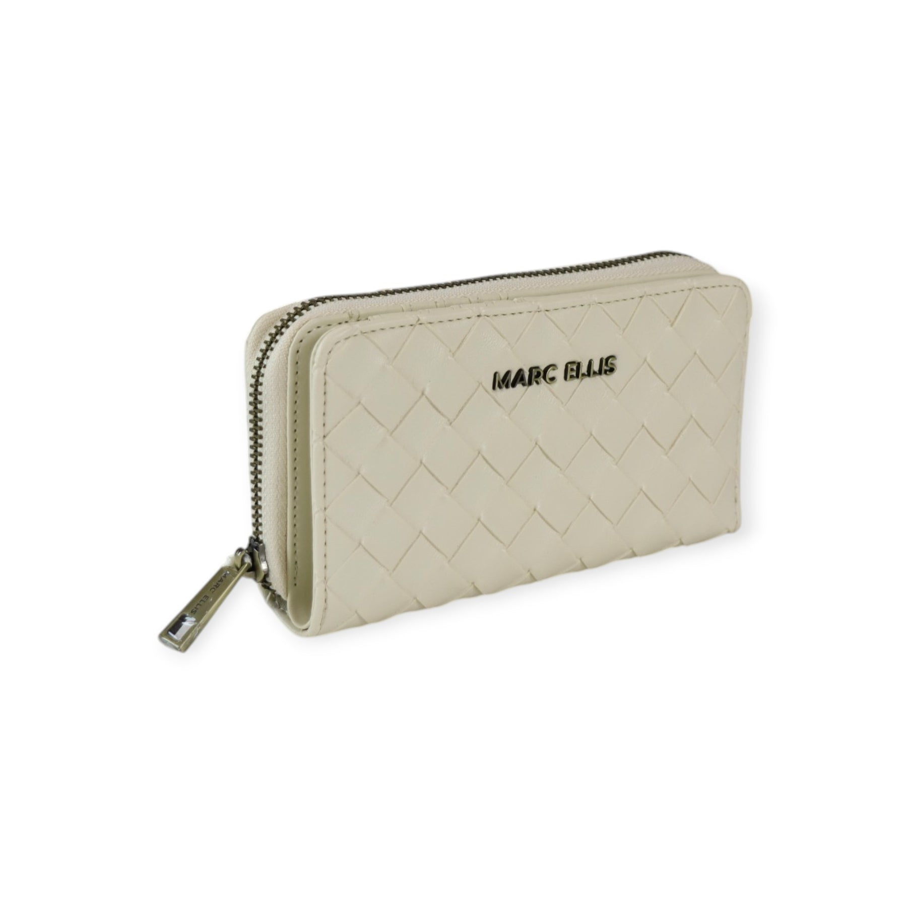Portafogli NORAH latte di MARC ELLIS in ecopelle con effetto intrecciato, zip around, scomparto carte esterno con bottone, logo in metallo. Misure 16x9x4 cm.