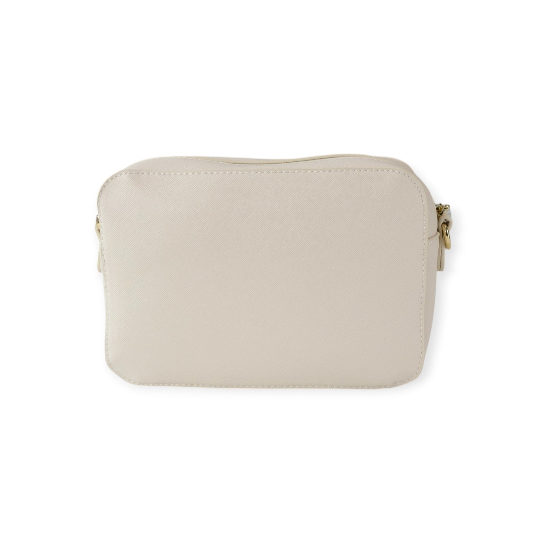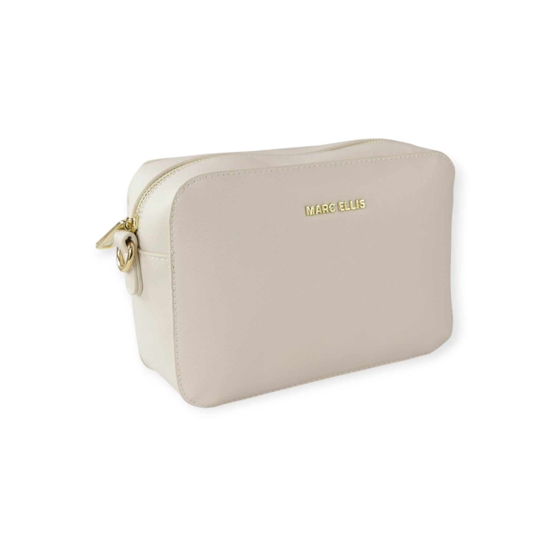 Borsa a tracolla PEYTON latte di MARC ELLIS in ecopelle con effetto saffiano, logo in metallo, chiusura con zip, tracolla in pelle e metallo. Misure 22x16x8 cm.