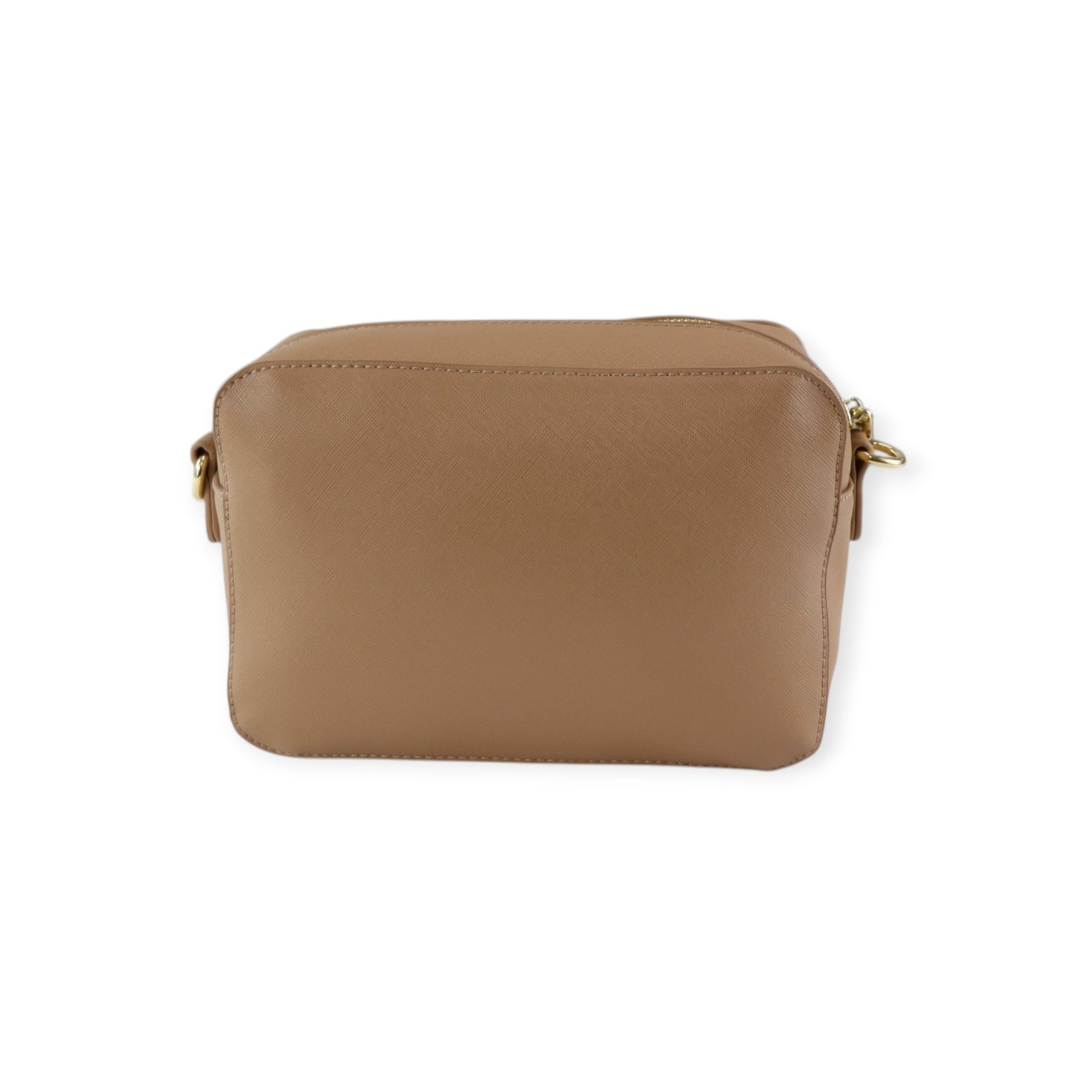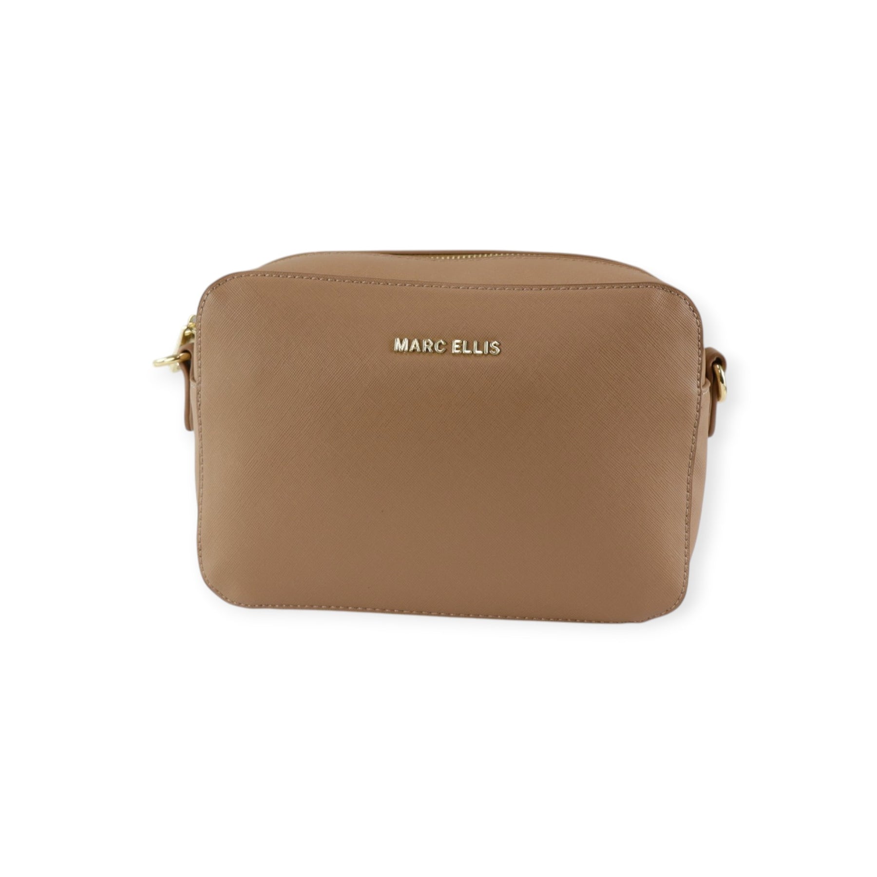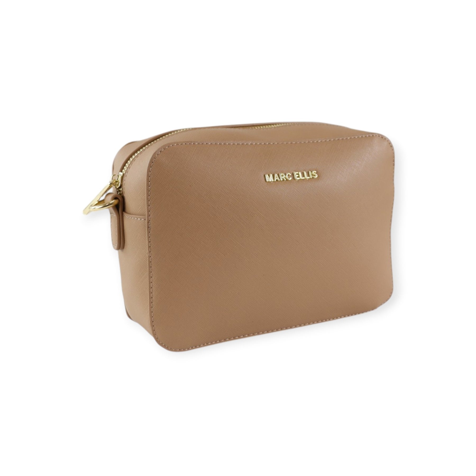 Borsa a tracolla PEYTON cammello di MARC ELLIS in ecopelle con effetto saffiano, logo in metallo, chiusura con zip, tracolla in pelle e metallo. Misure 22x16x8 cm.