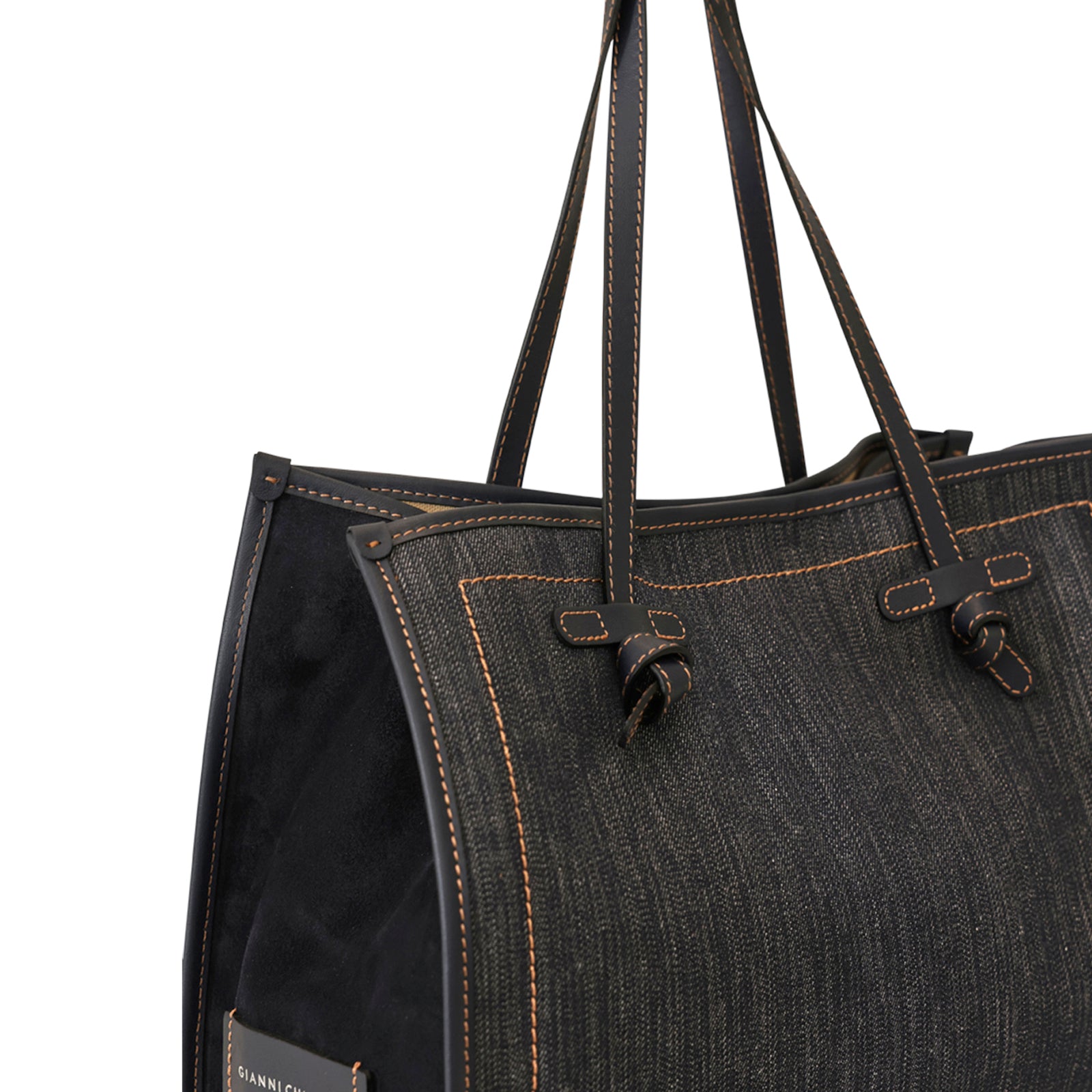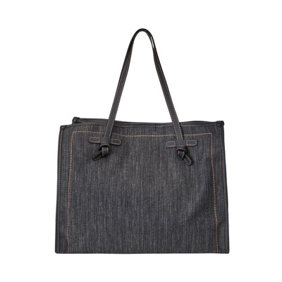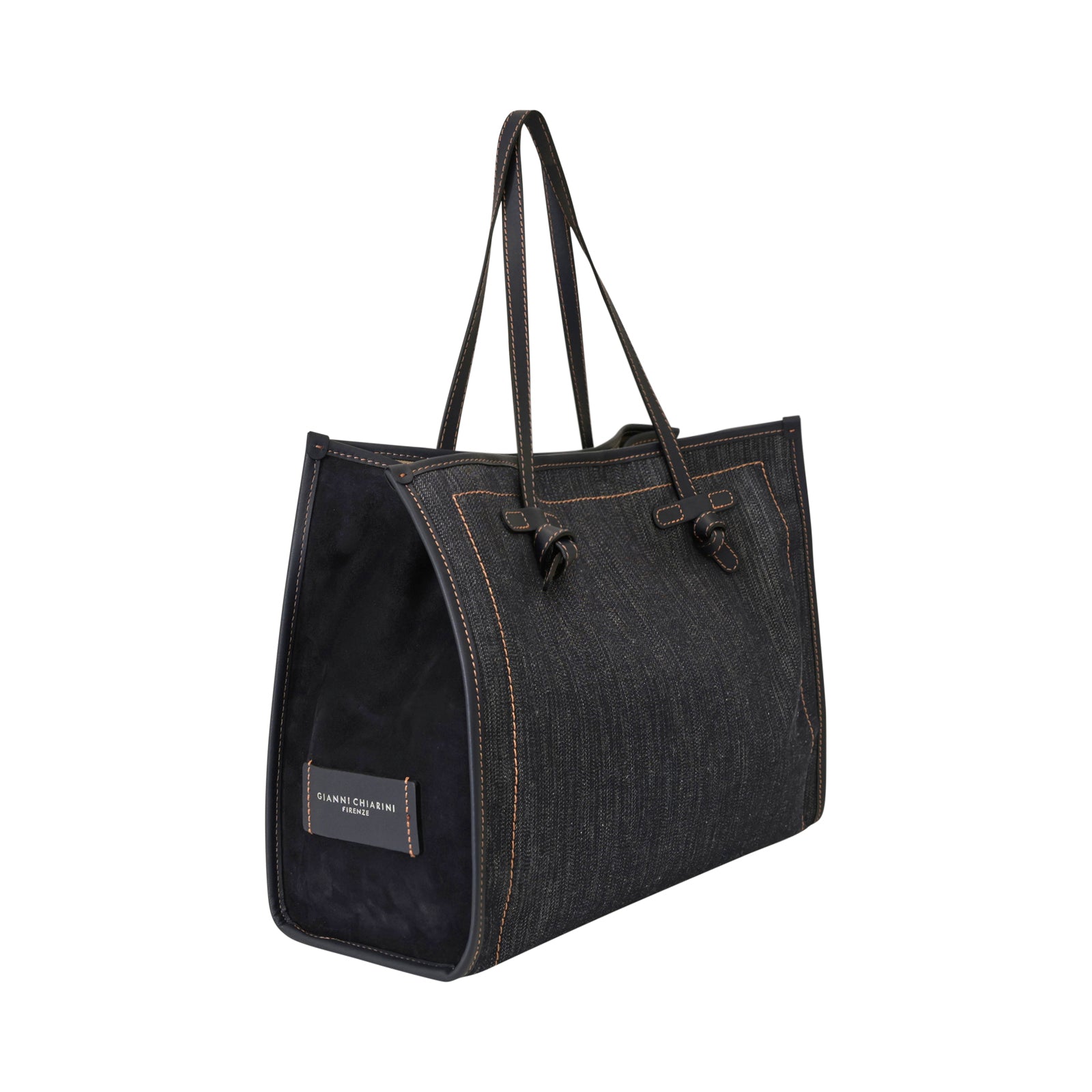 Shopping denim di MARCELLA CLUB in cotone con doppio manico, chiusura con bottone e profili in camoscio blu. Misure 37x30x23 cm.