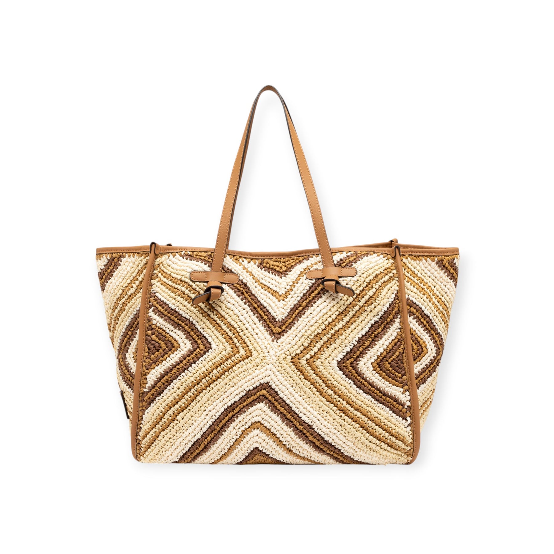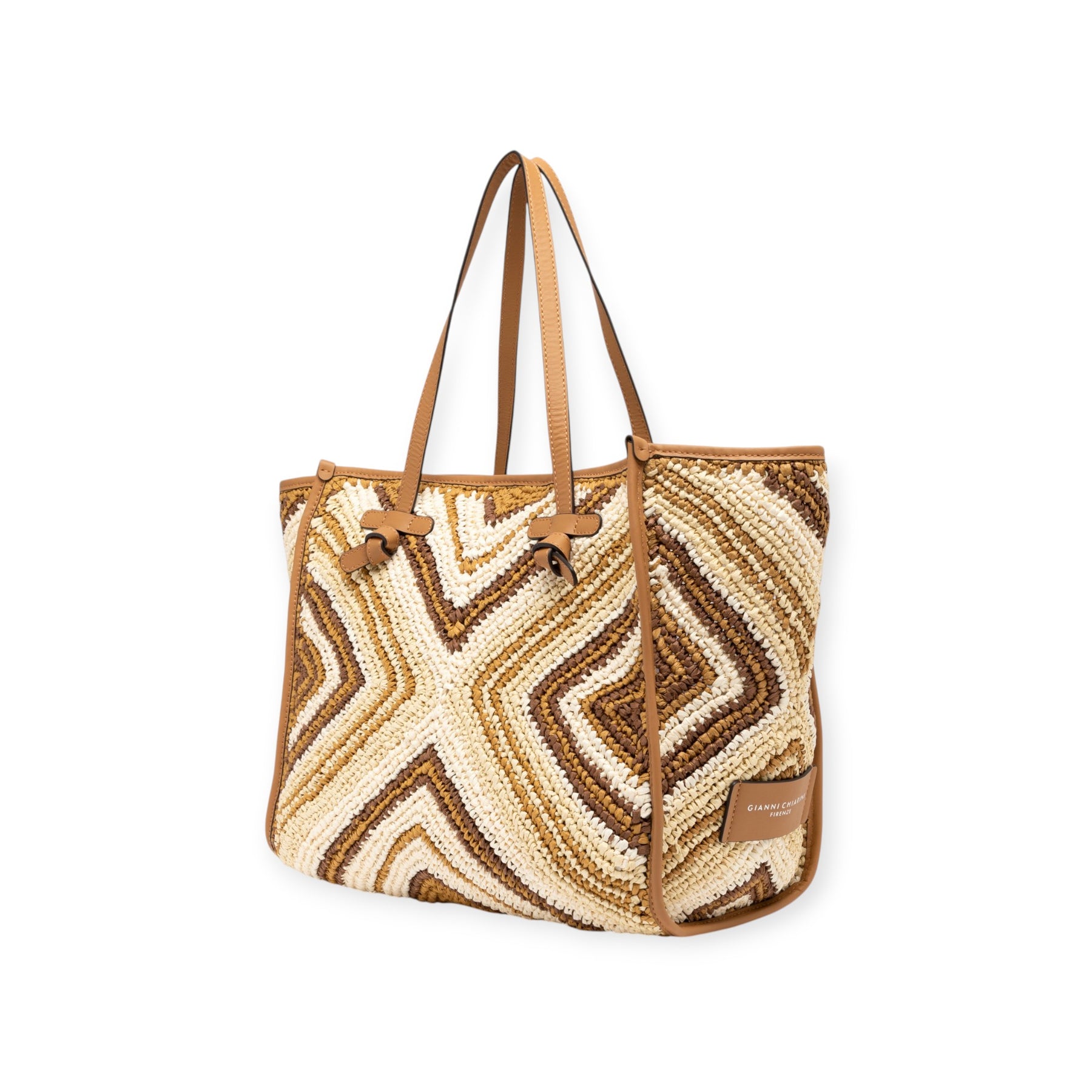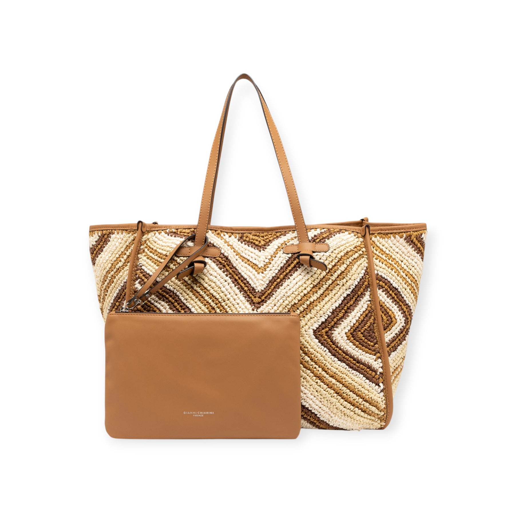 Shopping bag multicolor di MARCELLA CLUB GIANNI CHIARINI in raffia con doppio manico e profili in pelle cuoio, chiusura con bottone, pochette interna in pelle cuoio. Misura 38x31x16cm.