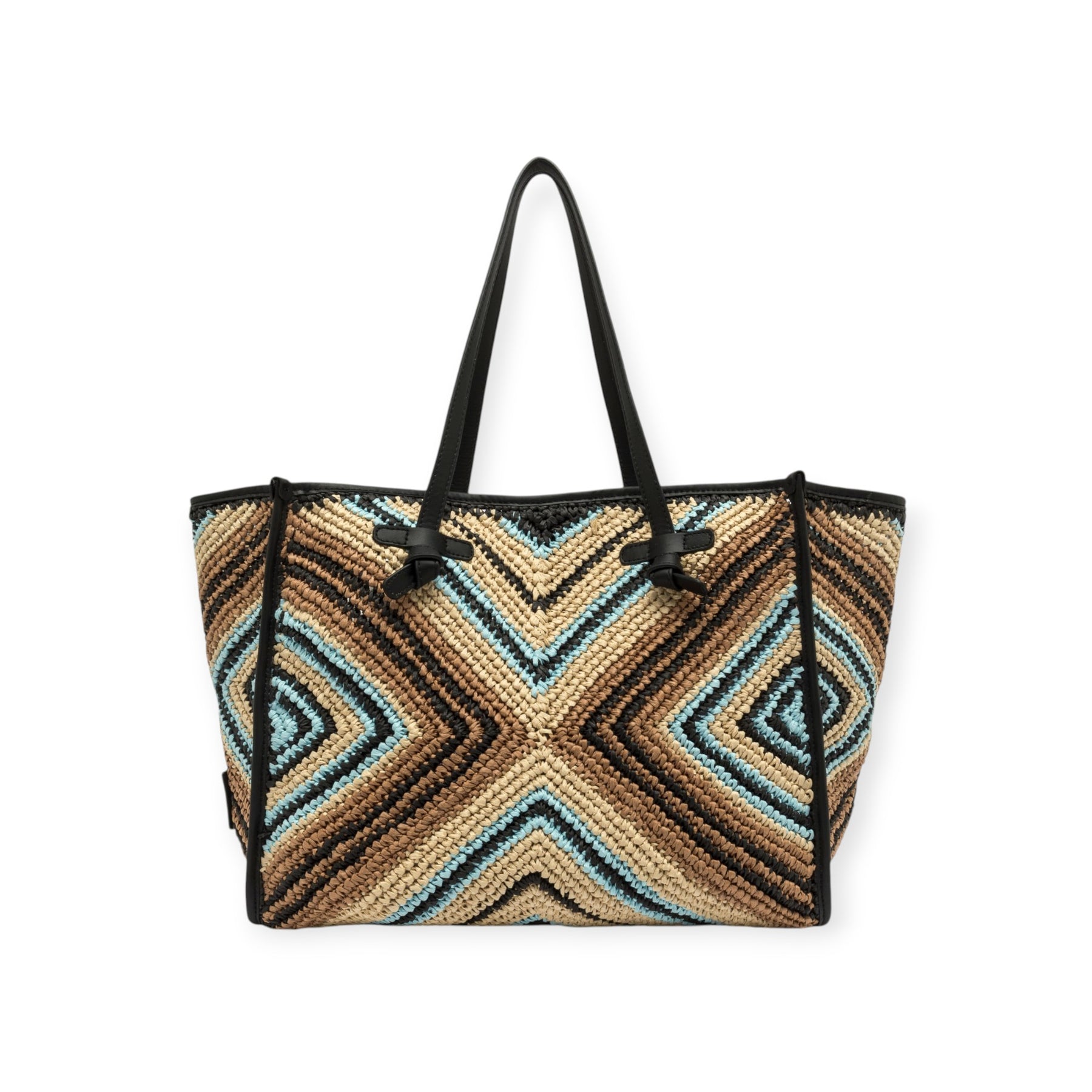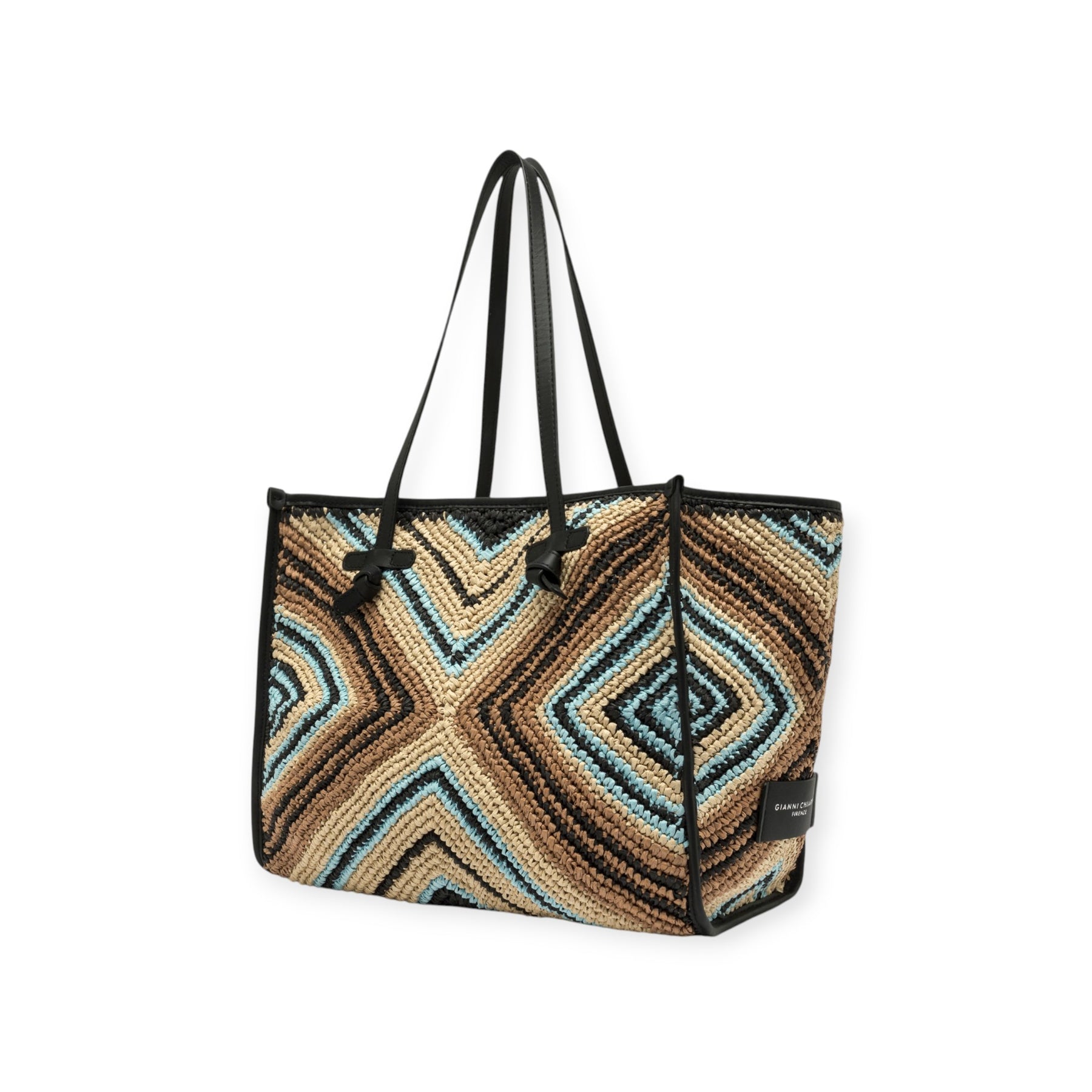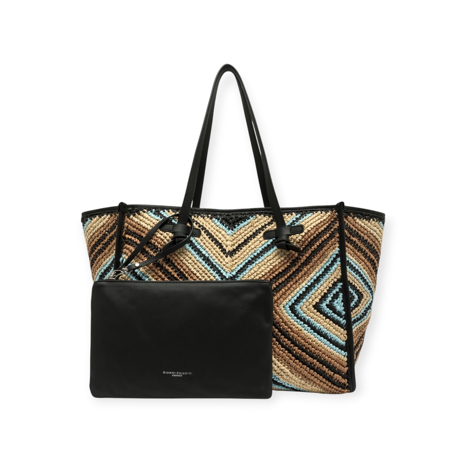 Shopping bag multicolor di MARCELLA CLUB GIANNI CHIARINI in raffia con doppio manico e profili in pelle nera, chiusura con bottone, pochette interna in pelle nera. Misura 38x31x16cm.