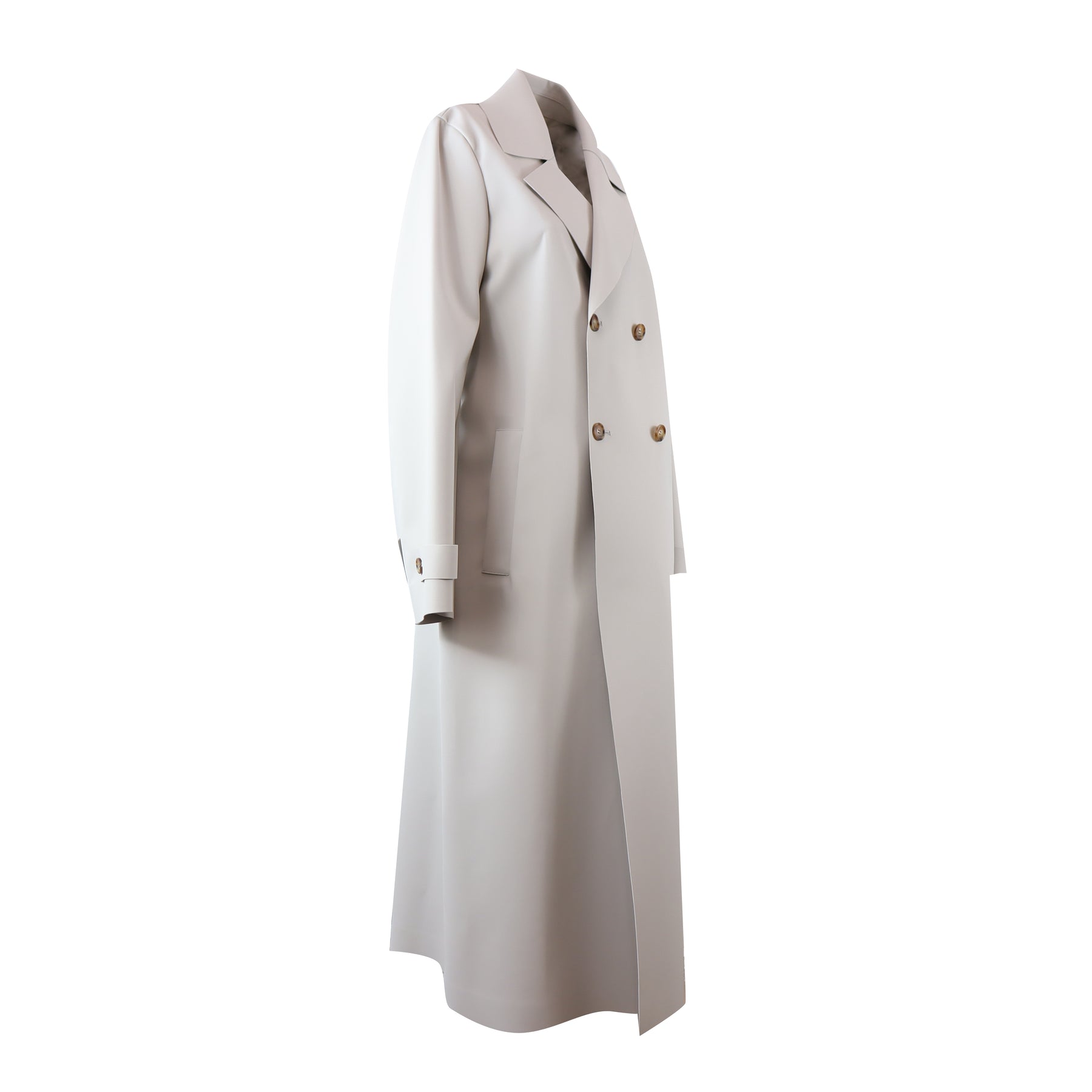 Trench CEDRO grigio chiaro di MM MAX MARA in poliestere con collo campio, rever classico, modello doppio petto lungo con 4 bottoni, tasche laterali a filetto e cintura in vita.
