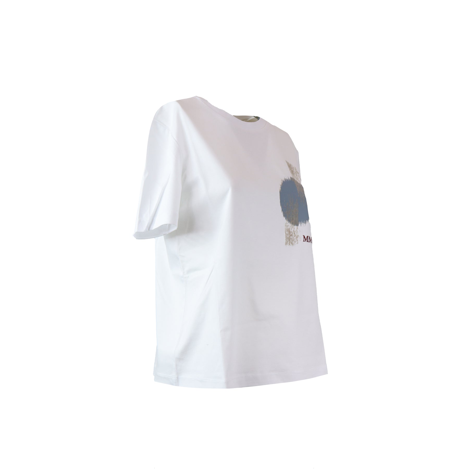 T-Shirt NEGOZI bianca di MM MAX MARA in cotone modal con mezza manica, stampa in azzurro e logo a contrasto.