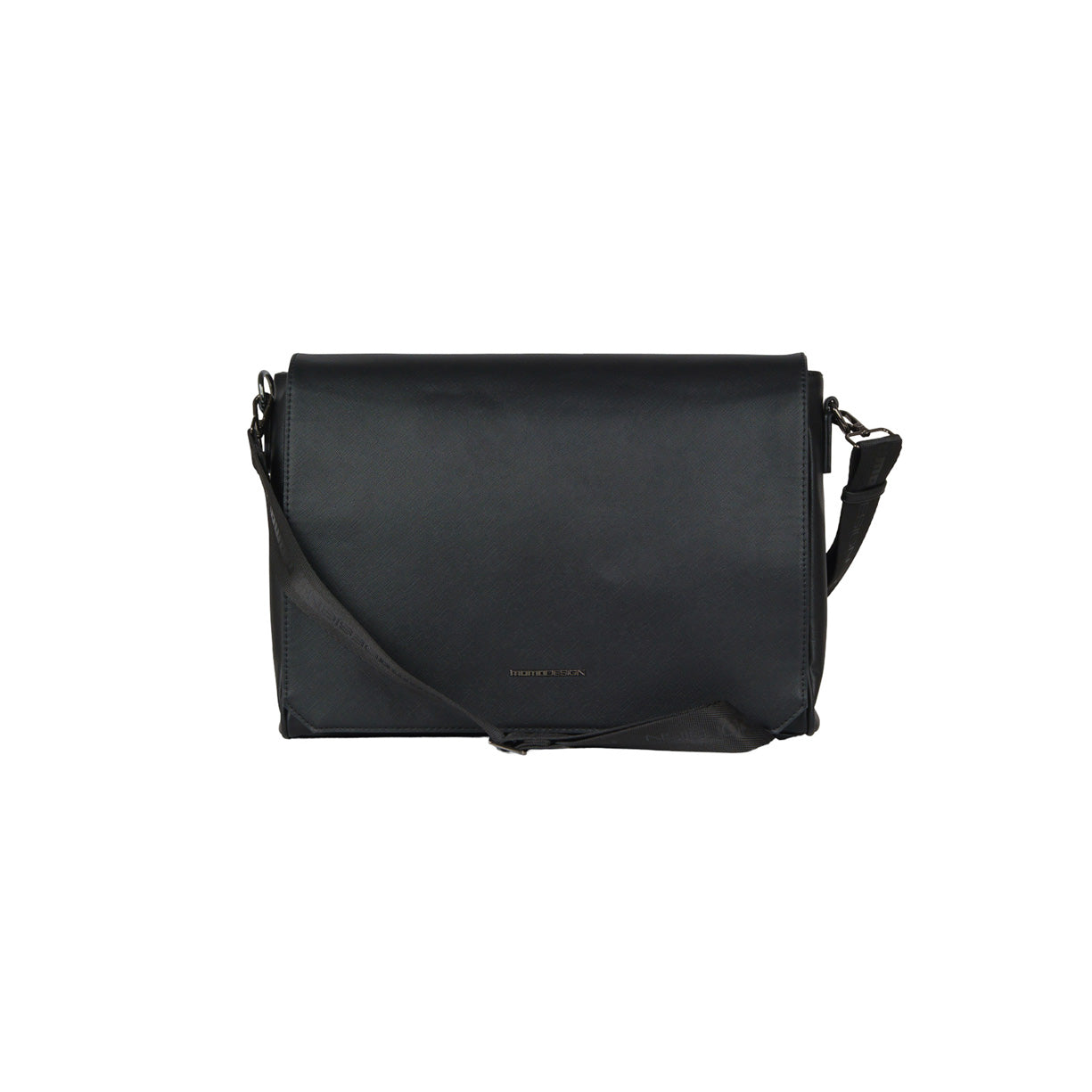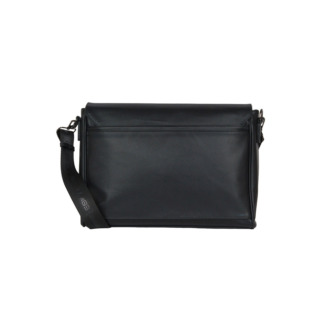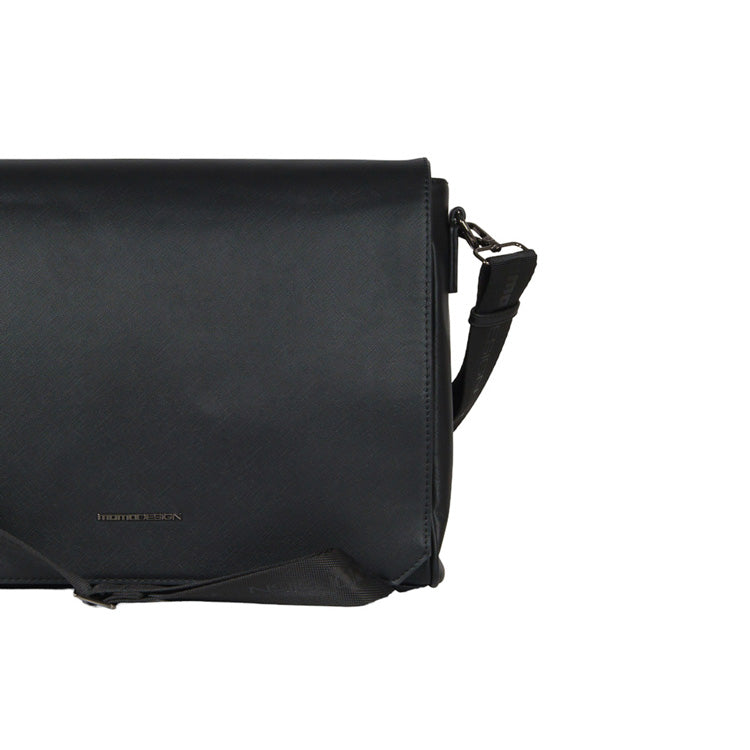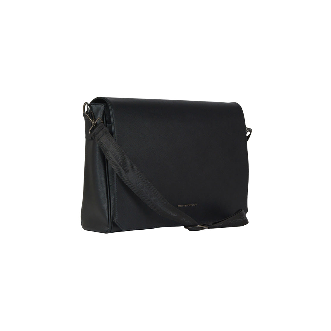 Tracolla nera di MOMO DESIGN in ecopelle con chiusura con patta, logo in metallo acciaio e tracolla in tessuto. Misure 37x27x10 cm.