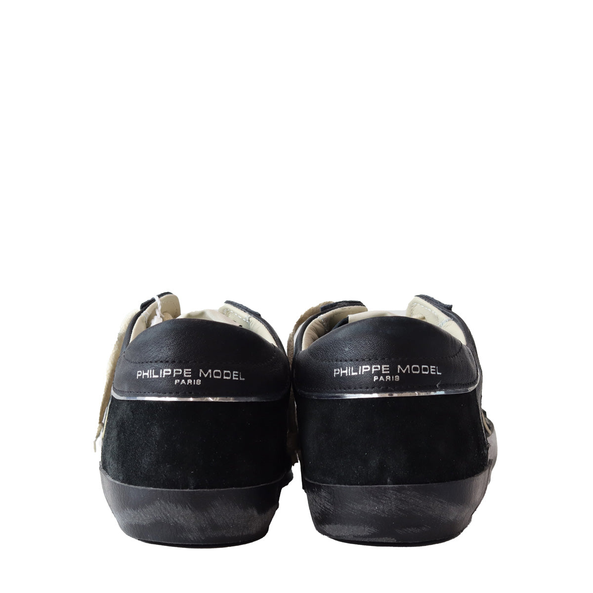 Sneakers PARIS X nera di PHILIPPE MODEL in pelle con profili in camoscio nero, cuciture beige e fondo in gomma effetto used nera.