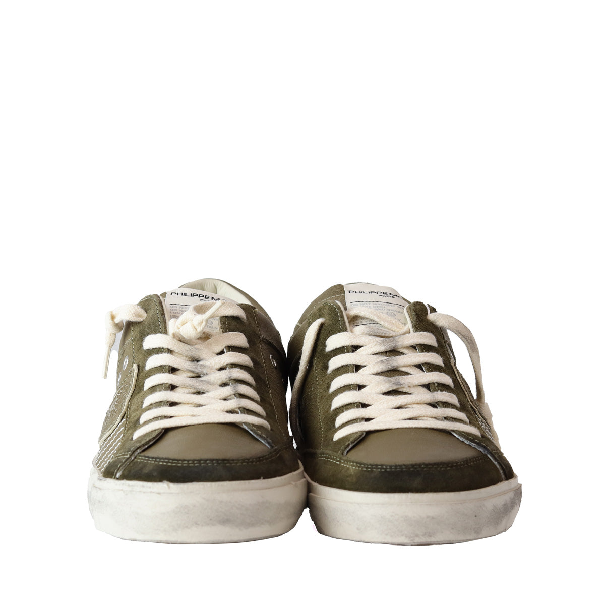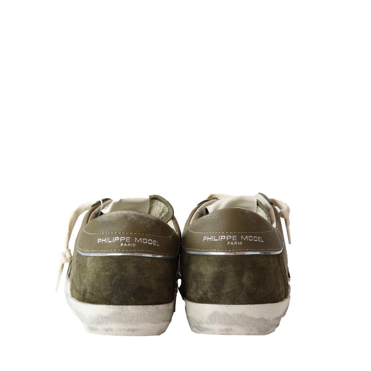 Sneakers PARIS X verde di PHILIPPE MODEL in pelle con profili in camoscio nero, cuciture beige e fondo in gomma effetto used bianca.