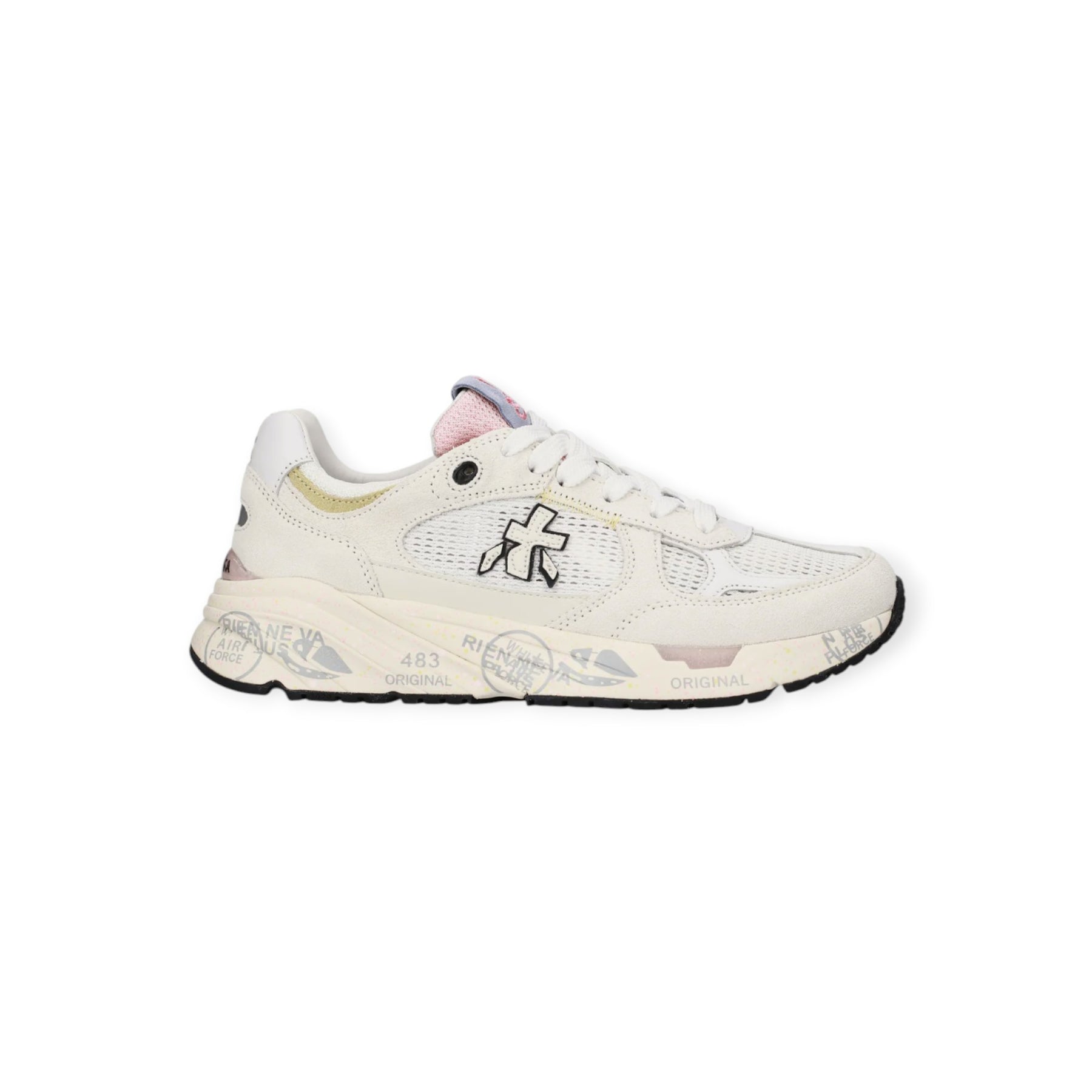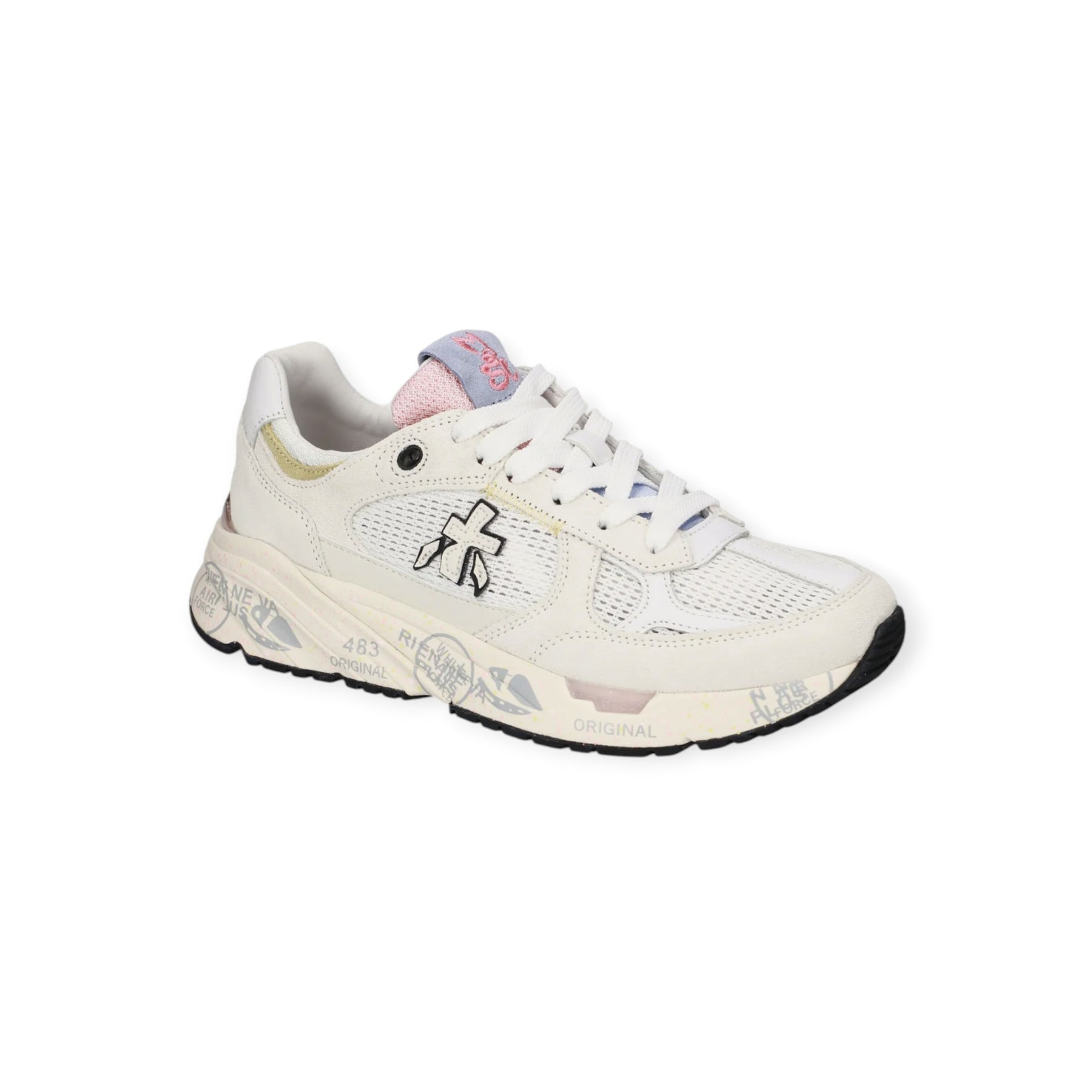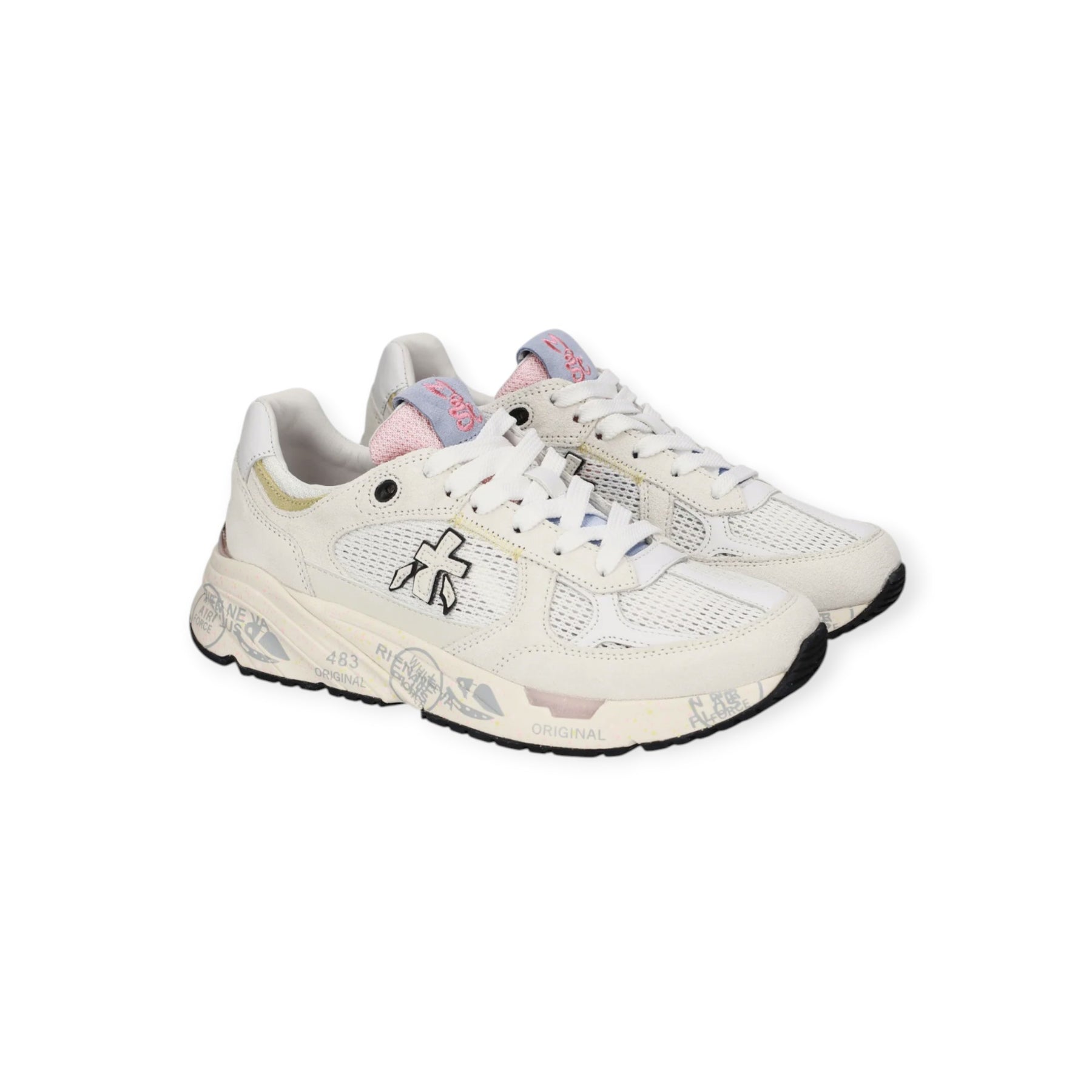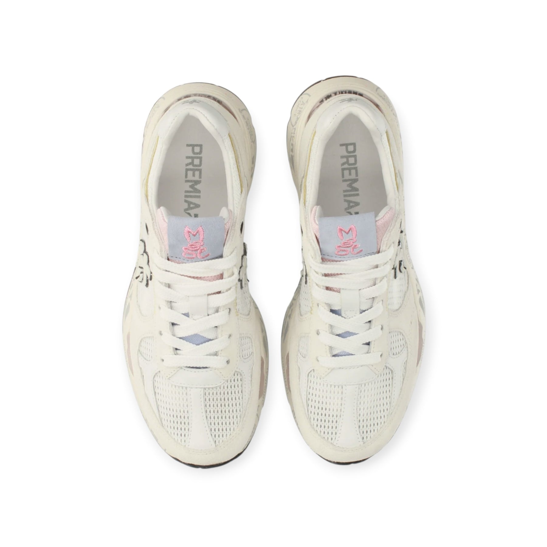 Running MASE bianca di PREMIATA in camoscio con tomaia in tessuto forato bianco, profili in pelle, logo laterale in bianco, talloncino posteriore in pelle bianca. Fondo in gomma alto 40mm.