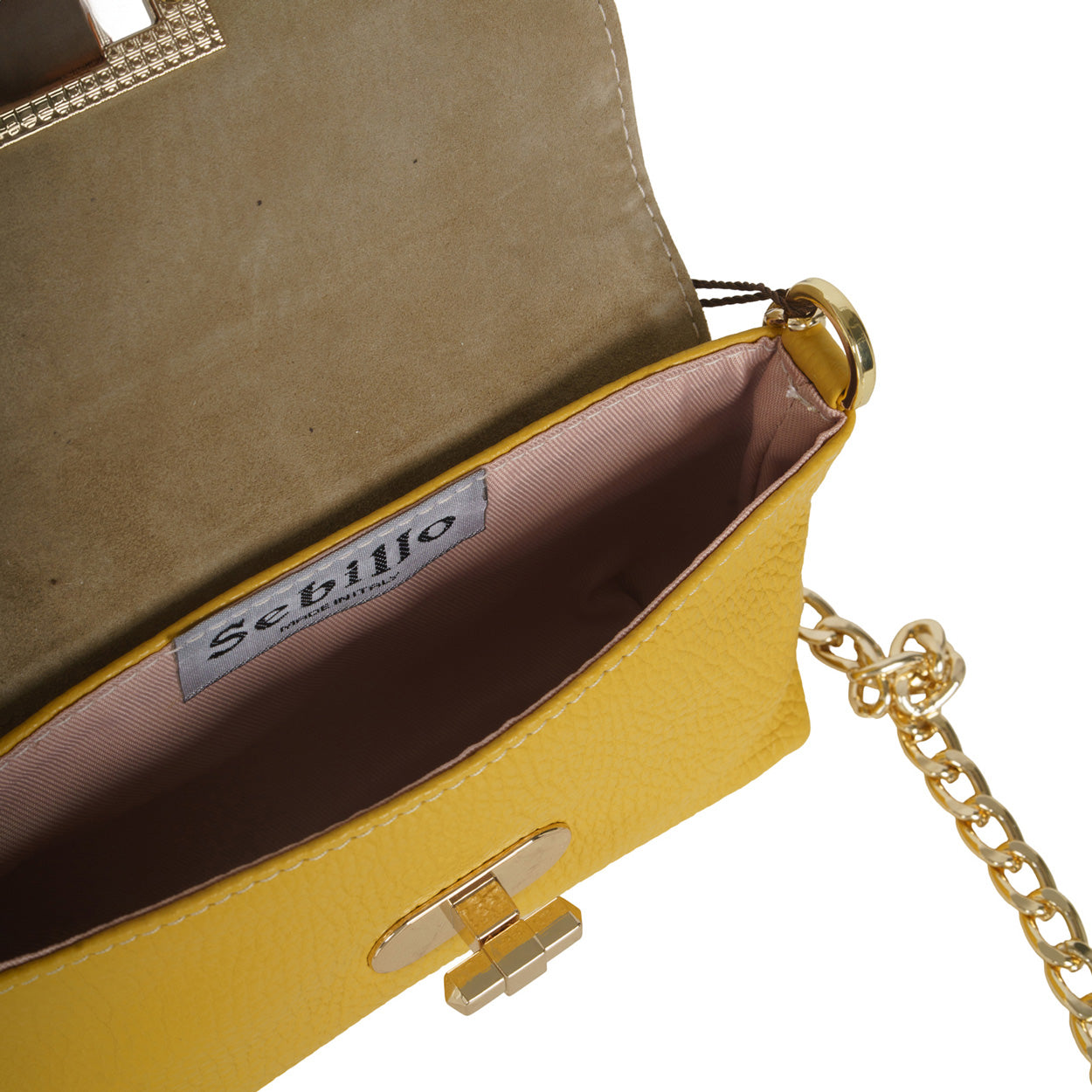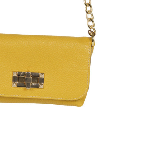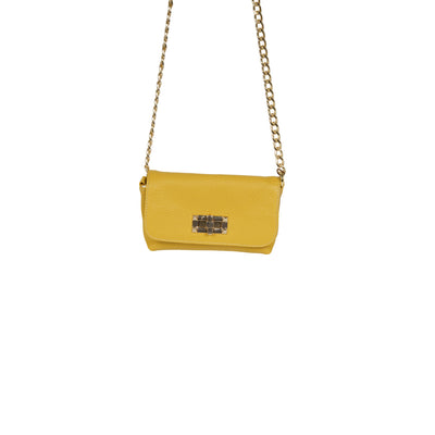 Tracolla ocra di SEBILLO in pelle bottalata con patta e chiusura con gancio, catena interna. Misure 17x10x5cm.