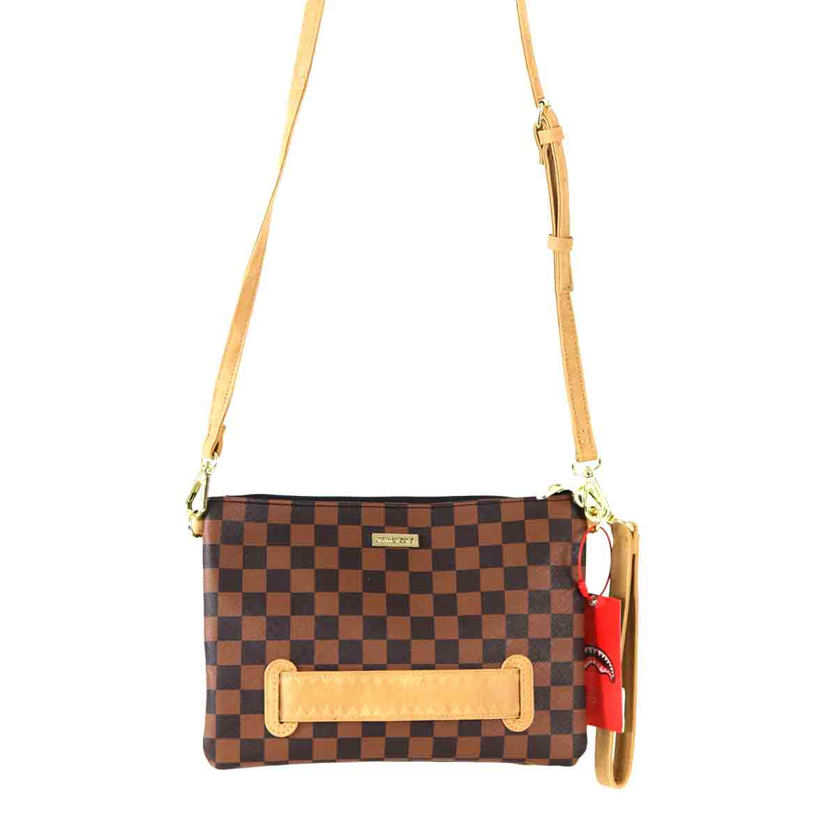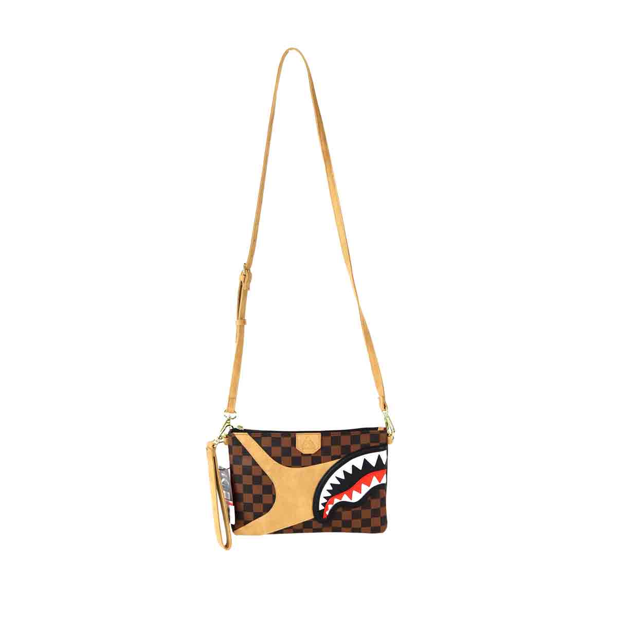 Pochette Shark marrone di SPRAYGROUND in ecopelle con shark classico, profili in camoscio beige, polsiera e tracolla interna. Misure 26x18x1 cm.