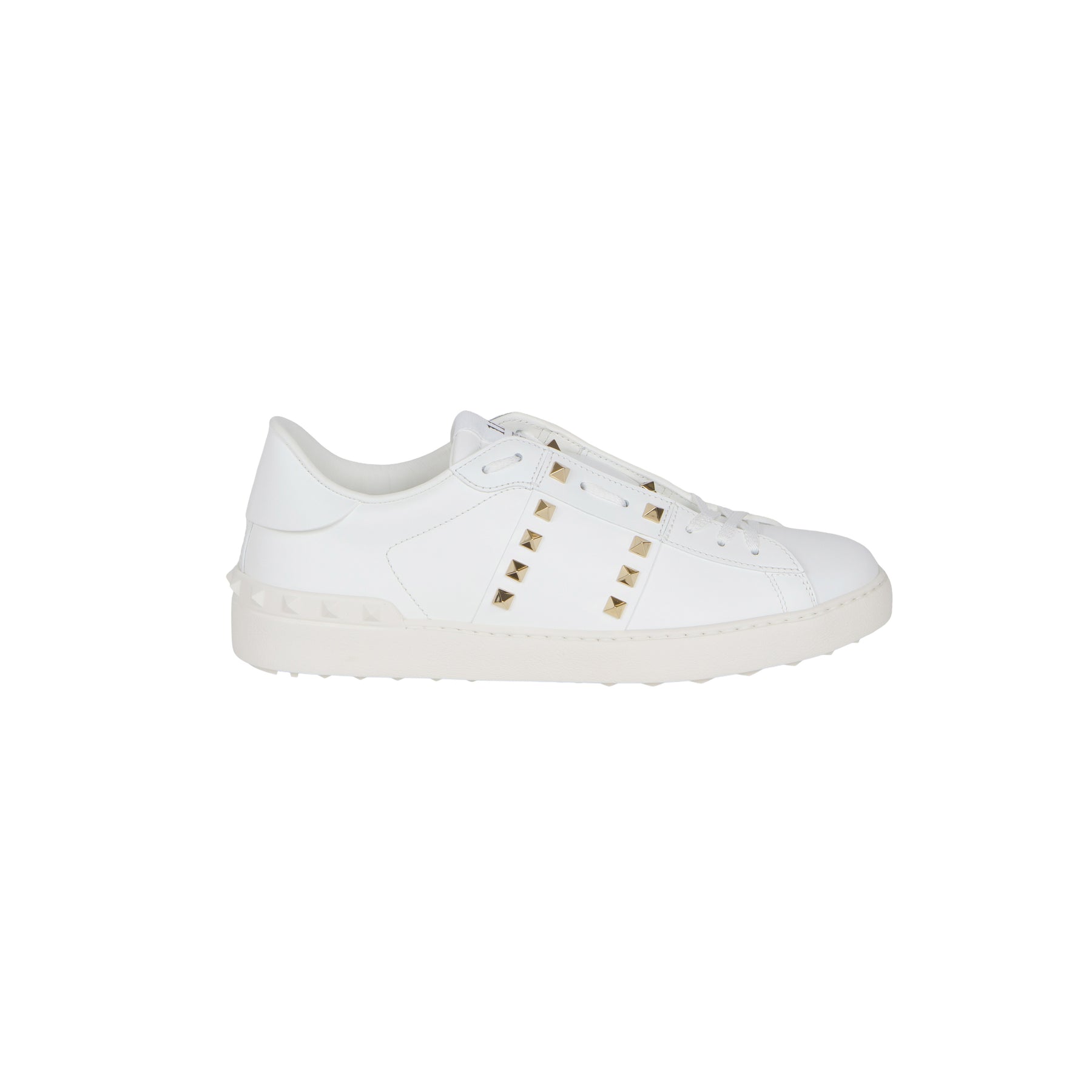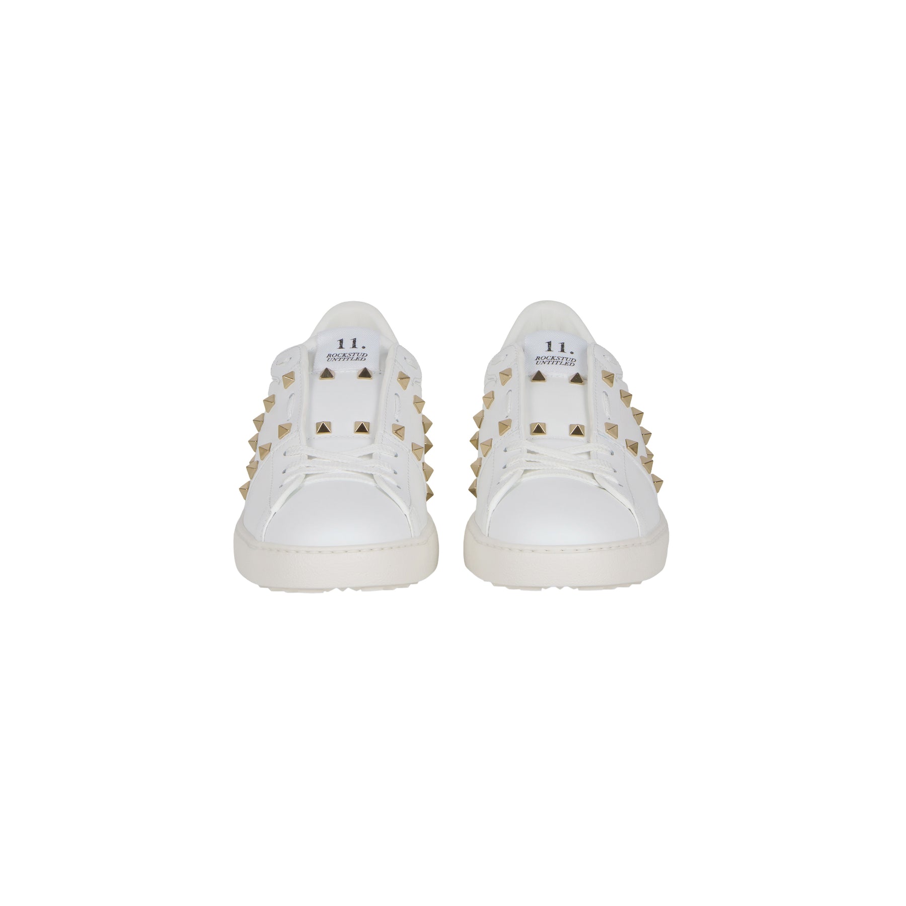 Sneakers ROCKSTUD UNTITLED bianca di VALENTINO GARAVANI in pelle con fascia con borchie in metallo platino, fondo in gomma con dettaglio borchie in gomma sul retro ed etichetta speciale "11".